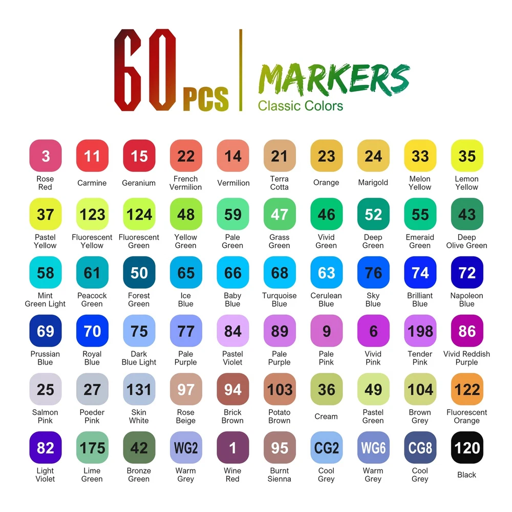 Perfect brush tip for kids, adult and artist coloring books BRUSH & CHISEL DOUBLE TIP: You can choose the brush tip for sweeping, details, calligraphic strokes or the broad chisel tip for quickly color in large areas 60 VIBRANT COLORS: Perfect for adults coloring books, card making, illustration, drawing, calligraphy lettering beginners, underlining, architectural design, advertising rendering, landscape, comic design, and drawing cartoons etc. EASY TO USE, NO SMUDGING: Each Marker Cap is marked with color code at both ends makes it easier to choose right color. HIGH-QUALITY MATERIALS: The markers are made of environmental protection material. The ink dres quickly and will not fade. Excellent smudge-proof and waterproof qualities on most surfaces. SAFTY & SERVICE GUARANTEE:We are committed to creating high-quality products and ensuring a good use experience. If you have any problems in using our products, please contact us in time, and we will actively solve the problems for you