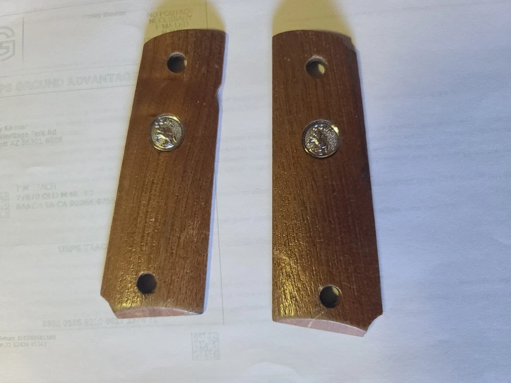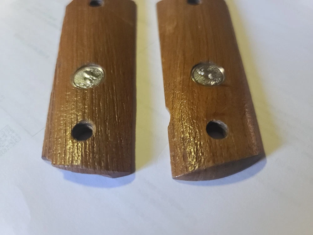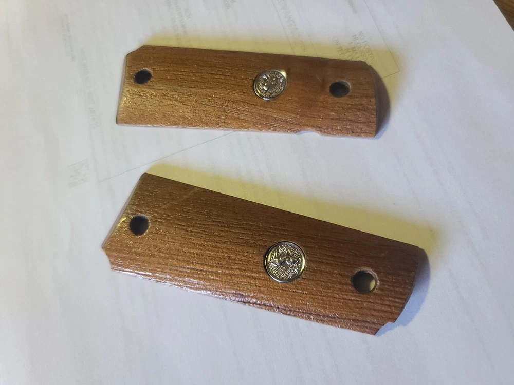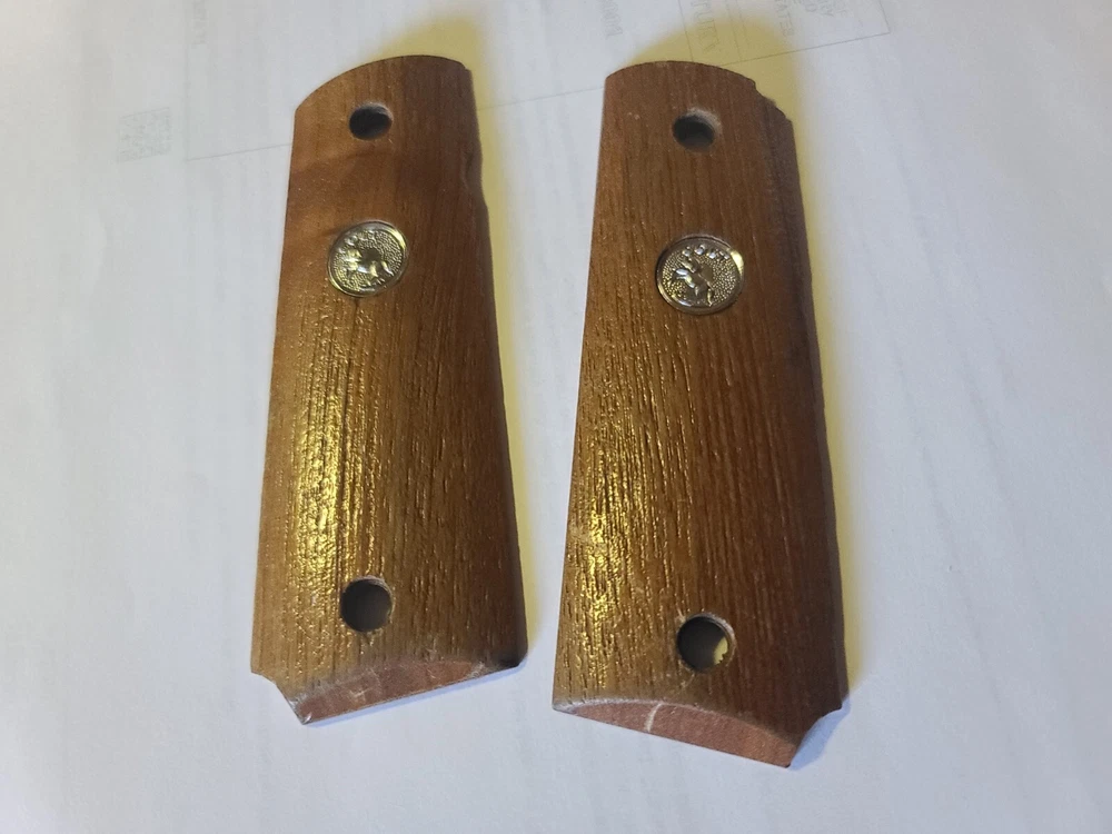 Enhance your Colt 1911 .45 ACP handgun with these smooth wood grips, designed to offer both a comfortable grip and a classic aesthetic. The rich brown hue of the wood complements the firearm's robust aesthetic, ensuring that your shooting experience is both stylish and secure. Crafted specifically for Colt firearms, these grips fit seamlessly, providing a seamless integration with your handgun. Please let me know if you have any questions or concerns. Ship is 9.00 USPS ground advantage, ebay will likely add tax.