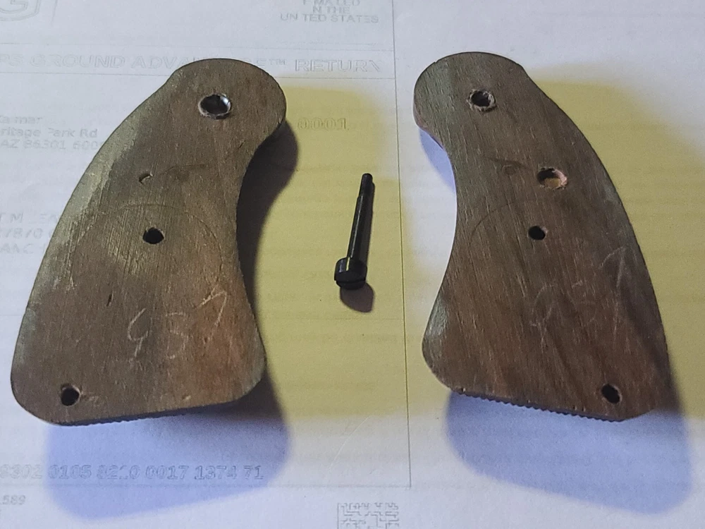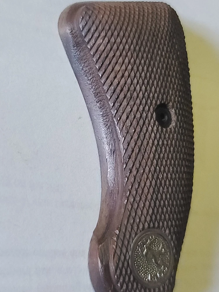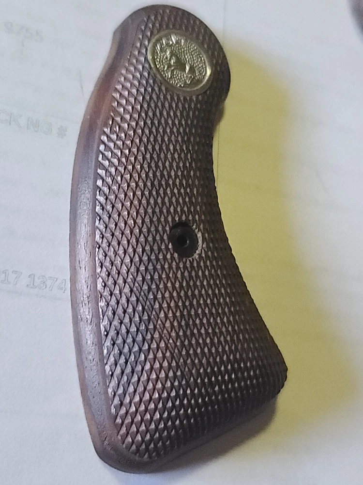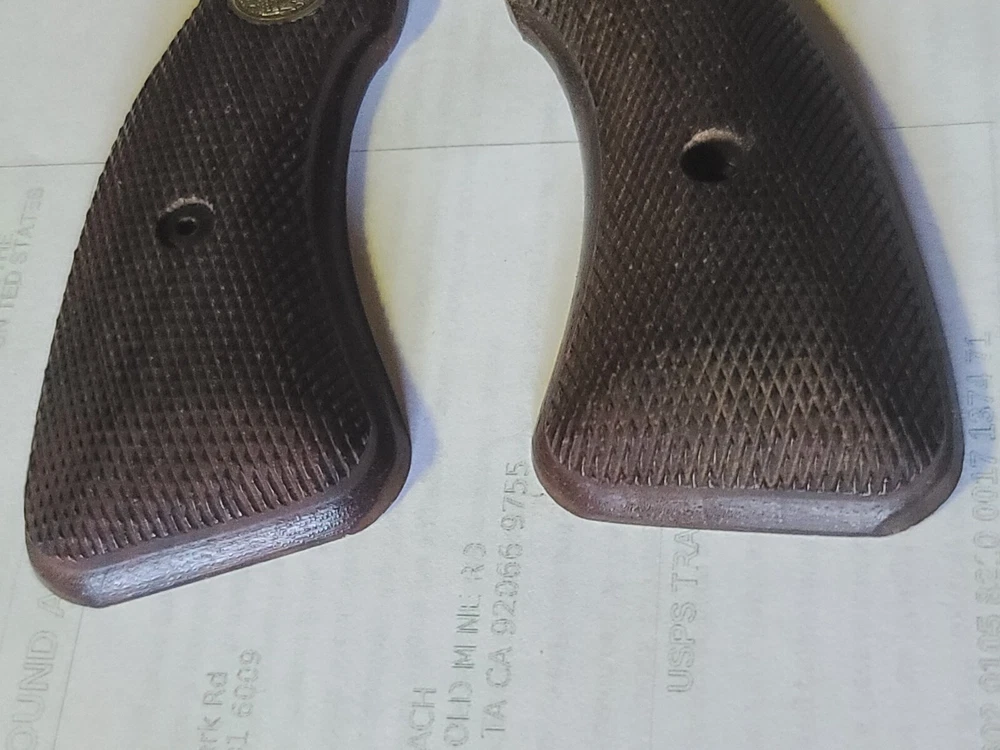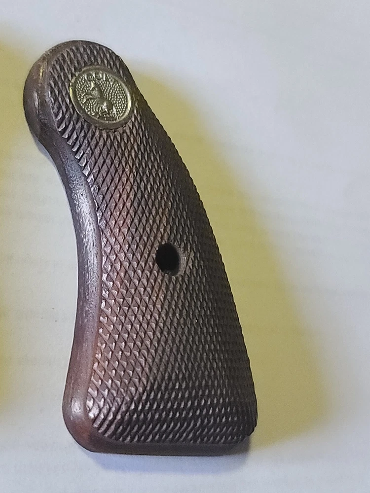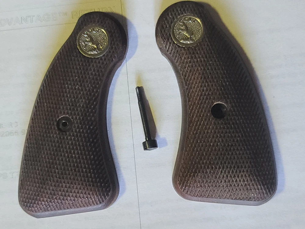 Enhance your Colt handgun's feel and appearance with these authentic Colt Police Positive checker walnut service grips. They are meticulously crafted to fit a range of Colt models, ensuring a snug and secure attachment. The rich brown color of the wood complements the classic design, offering a warm and professional look that's both functional and aesthetically pleasing.These grips are engineered from high-quality walnut, providing a comfortable grip with a classic aesthetic that many shooters appreciate. The distinctive checker pattern adds a layer of texture for a better grip, making them an excellent choice for those who value both form and function in their firearm accessories. Please let me know if you have any questions or concerns. Ship is 9.00 usps ground advantage, ebay will likely add tax.