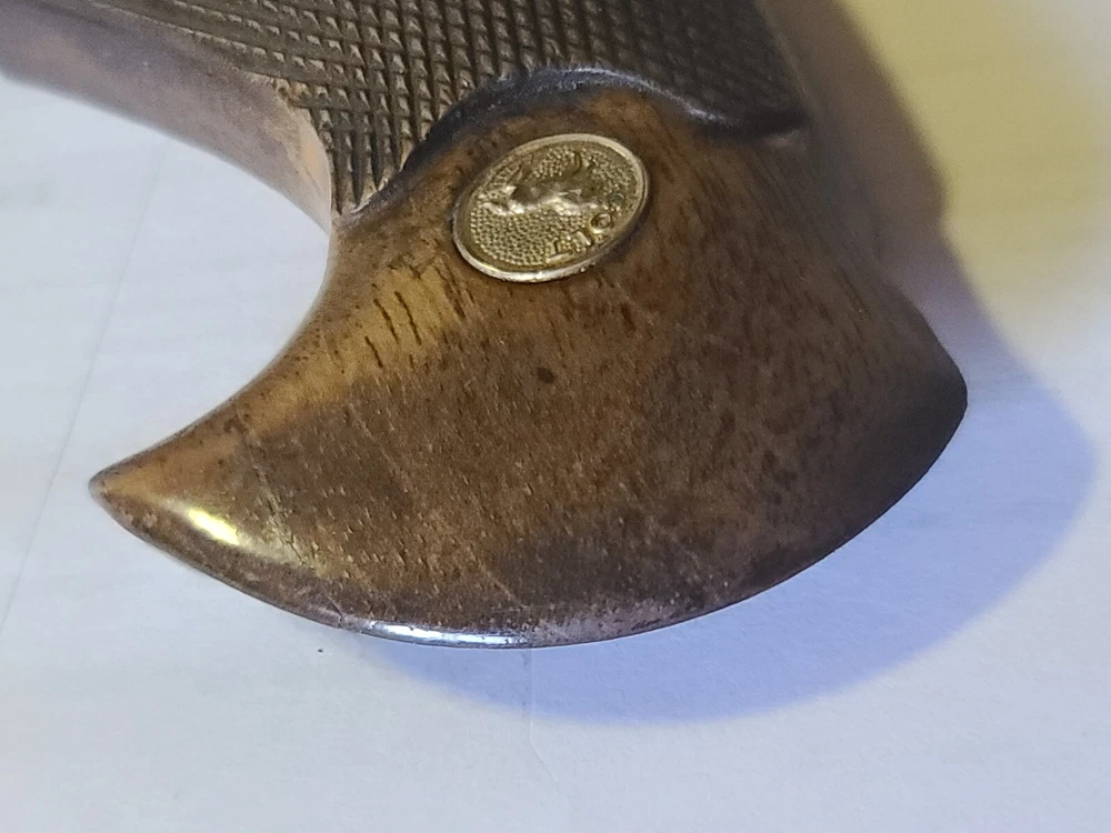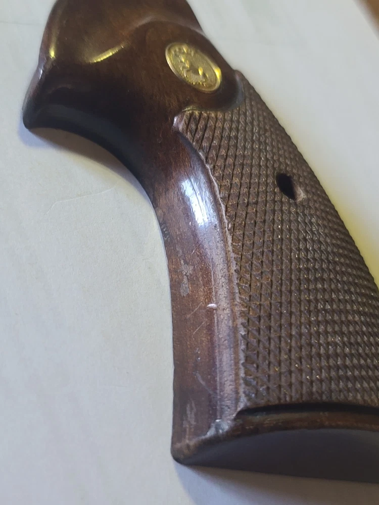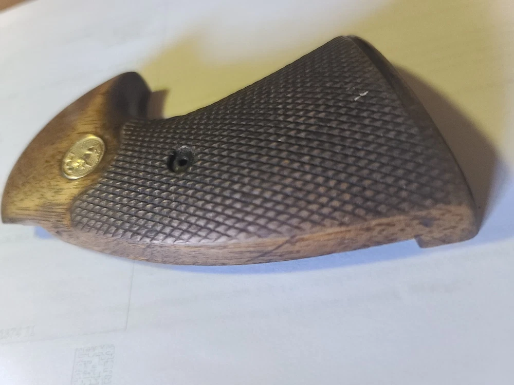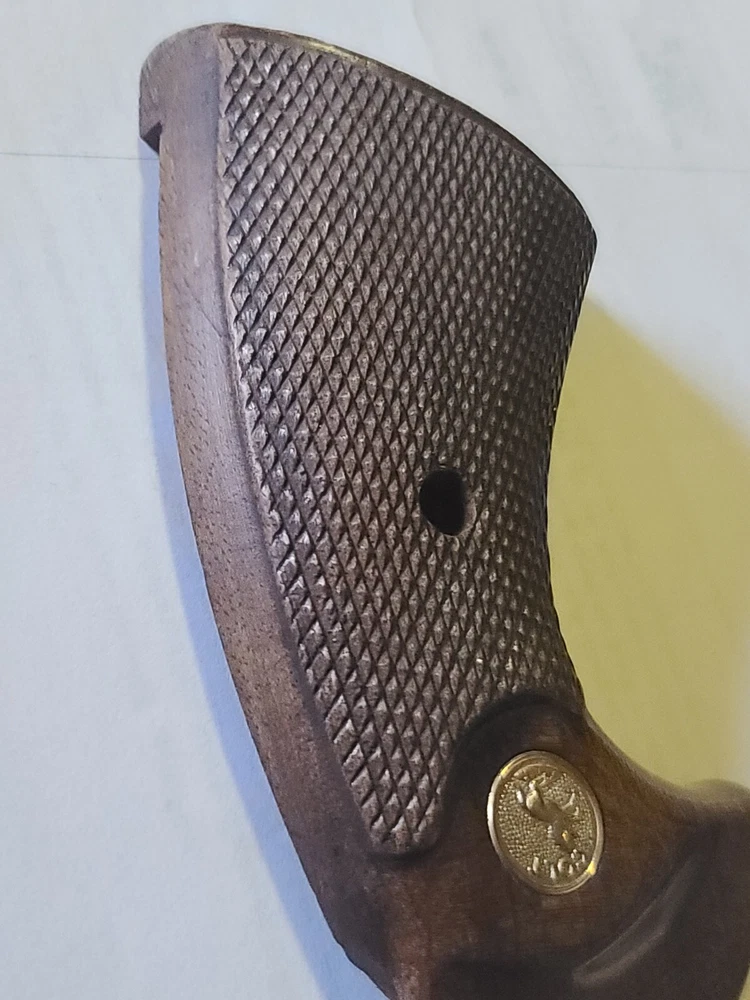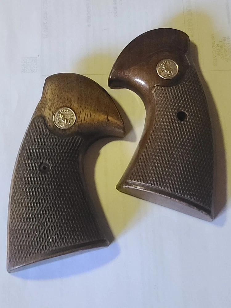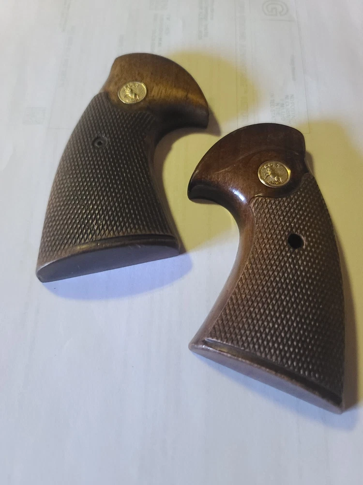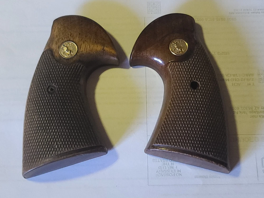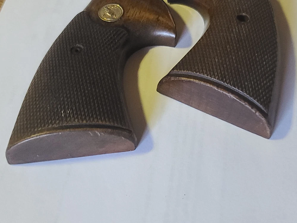 Offered here is original colt manufactured python presentation grips in fair condition, removed from gun for custom grips. Enhance your Colt Python's aesthetic and functionality with these larger checkered walnut presentation grips. They are a perfect fit for your handgun, providing a comfortable and secure grip during use. the wood adds a classic touch to your gun, maintaining the timeless look of Colt firearms. Crafted from high-quality walnut.. these grips are not only durable but also contribute to the overall balance of your gun ensuring a lasting and positive shooting experience. With these Colt-branded grips, your Python is sure to feel as good as it looks. Please let me know if you have any questions or concerns. Ship is 9.00 usps ground advantage, ebay will likely add tax.