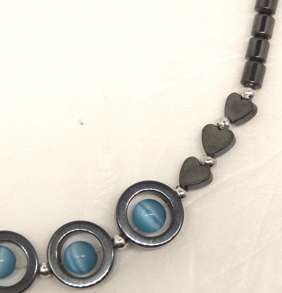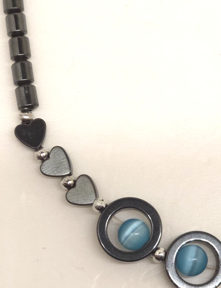 Crafted with an eye for style and a touch for the bohemian spirit, this dark grey beaded necklace is a testament to effortless elegance. The piece features a unique heart and tube cats eye blue circle pendant that adds a touch of mystique to your ensemble. Its 15-inch length makes it a versatile accessory, perfect for a variety of necklines and outfits. The necklace's barrel closure ensures secure wear, while the gray beads provide a neutral backdrop that complements any color palette. Whether you're aiming for a gothic vibe, embracing your love for beauty and fashion, or simply accenting a casual look with a hint of sophistication, this necklace is sure to become a cherished addition to your collection.