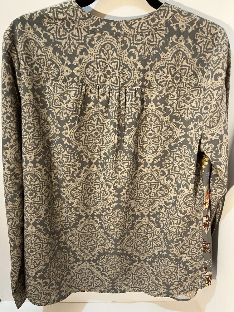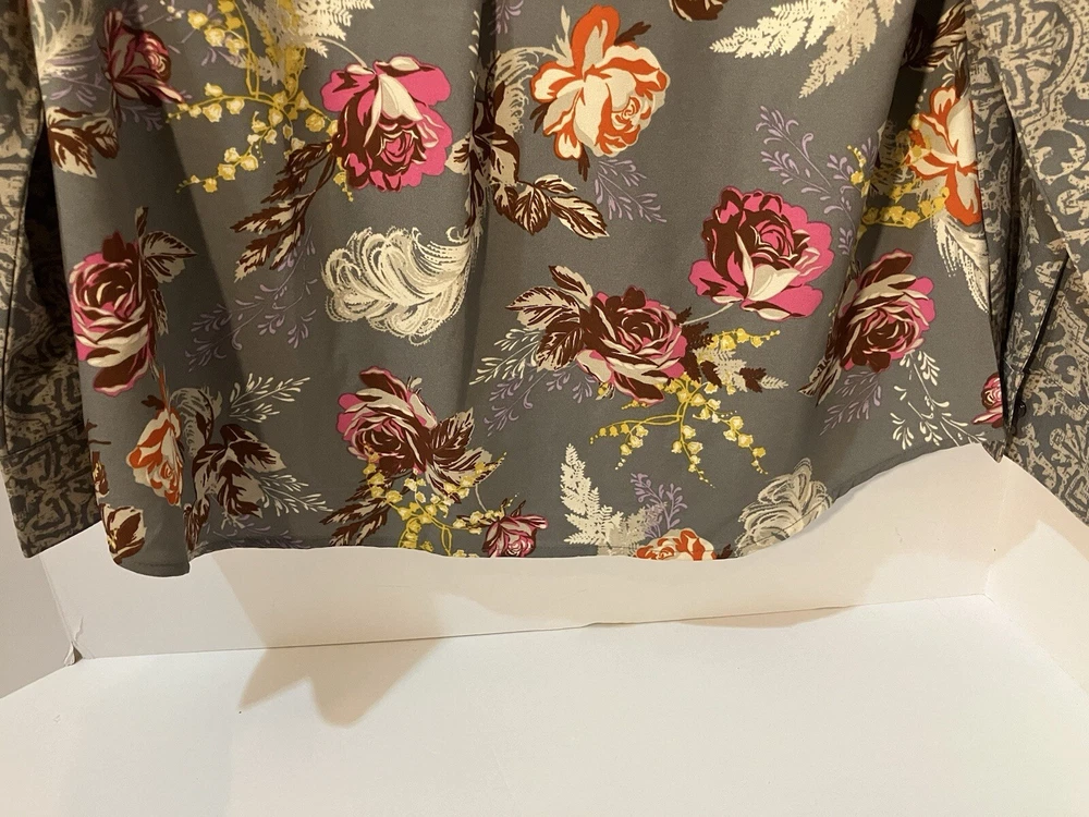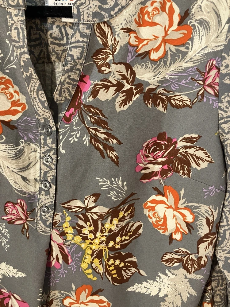 denim & company two pattern blouse front with gorgeous flowers and back has a fun classic geometric design v neck with 4 buttons pull over size M button sleeves 90% polyester 10%spandex Made in China machine wash cold separately gentle cycle, only non chlorine bleach when needed tumble dry low warm iron when needed lightly used but wholly loved!-- see photos for condition details, feel free to request additional photos if needed! **be sure to check out my other clothing listings for similar styles and sizes! many BNWT! any pre owned items may show normal signs of use-- if see any stains, rips, etc., I will do my best to provide photos. please do not hesitate to ask for more if needed! feel free to combine orders to save on shipping!