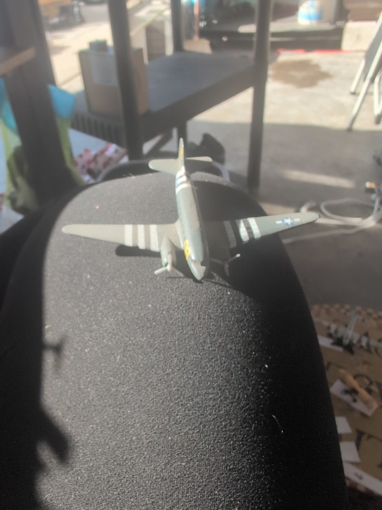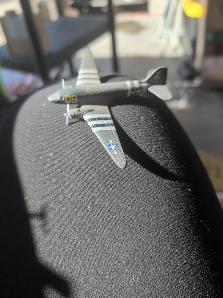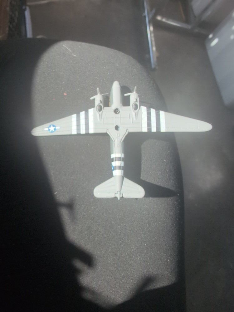 The product is a diecast model of a Douglas C-47A Skytrain military airplane by Franklin Mint. feat invasion stripes from the D-Day invasion. This detailed replica is made of high-quality diecast material and is scaled at 1:48. Perfect for collectors or young aviation enthusiasts, this model showcases the iconic McDonnell Douglas C-47A Skytrain aircraft. With its realistic design and attention to detail, it is sure to be a prized possession for anyone interested in aircraft and spacecraft.