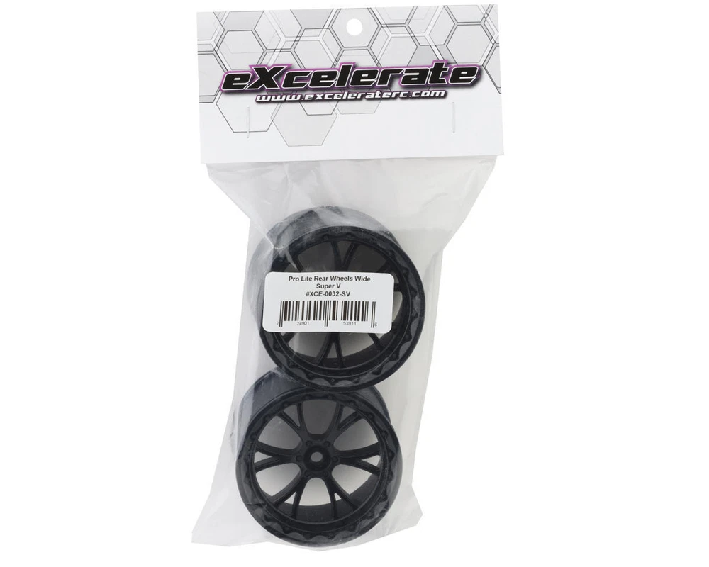 Wheels Overview: eXcelerate Super V Pro Lite Rear Wheels. Designed specifically for eXcelerate Outlaw NPRC racing rear tires, these optional wheels feature an Updated P-Drive center hex that provides a secondary connection point between the hex and wheel for superior strength on high bite tracks, the updated wider bead makes gluing your eXcelerate tires easier and reduces the overall weight of each wheel by 5 grams by removing the air valve to enhance overall performance! Features: Designed specifically for eXcelerate Outlaw NPRC racing rear tires Reduced overall weight of each wheel by 5 grams by removing the air valve Updated P-Drive Center Hex provided a secondary connection point between the hex and wheel for superior strength on high bite tracks Updated wider bead makes gluing your eXcelerate tires easier 12mm Hex Center with P-Drive Specifications: Scale: 1/10 Hex Size: 12mm Width: 50mm Back Spacing: 32mm Material: Lightweight Composite Includes: (2) Super V Pro Lite Rear Wheels About Us | View Store