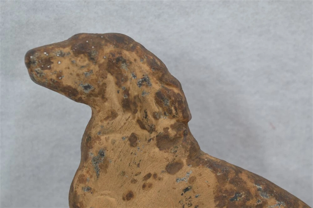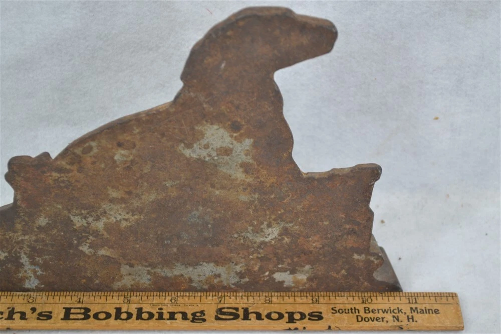 early antique cast iron doorstop flat setter dog w/flowers worn rare original old original rare cast iron doorstop 1. original not marked not reproduction 2. needs a little cleaning, I have not cleaned it, right out NH attic 3. I have been buying and selling or more than 50 years, I have never seen this form 4. original worn paint 5. some surface rust, will brush off 6. this will look a lot better when cleaned 7. long ear, long haired, setter type of dog approximate measurements 1. 9 in. long x 7.5 high x 1/2 in thick at body 2. base 9 in. long x 1.5 in. thick ground advantage or priority shipping and handling in US scroll down for larger photos You may be interested in our other eBay listings . I send a note at the end of the sale with payment information. Payment is expected within 2 days. We ship promptly within 1 day on receipt of payment. All US packages have tracking and are insured. International Buyers We ship international with United States Postal Services. USPS First Class postage and Flat Rate Priority Boxes or Envelopes can now be tracked to some countries . International packages over $100 ship priority or express. Contact us for more information. Import duties, taxes and charges are not included in the item price or shipping charges. These charges are the buyer’s responsibility. Please check with your country’s customs office to determine what these additional costs will be prior to bidding/buying.” . Powered by SixBit's eCommerce Solution