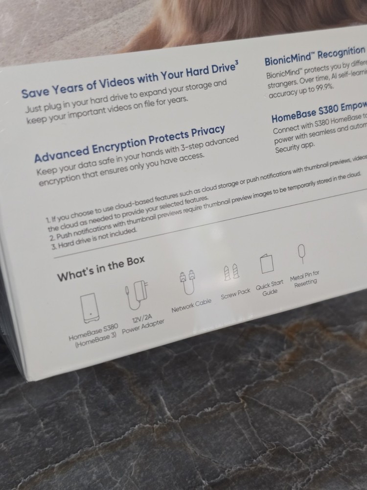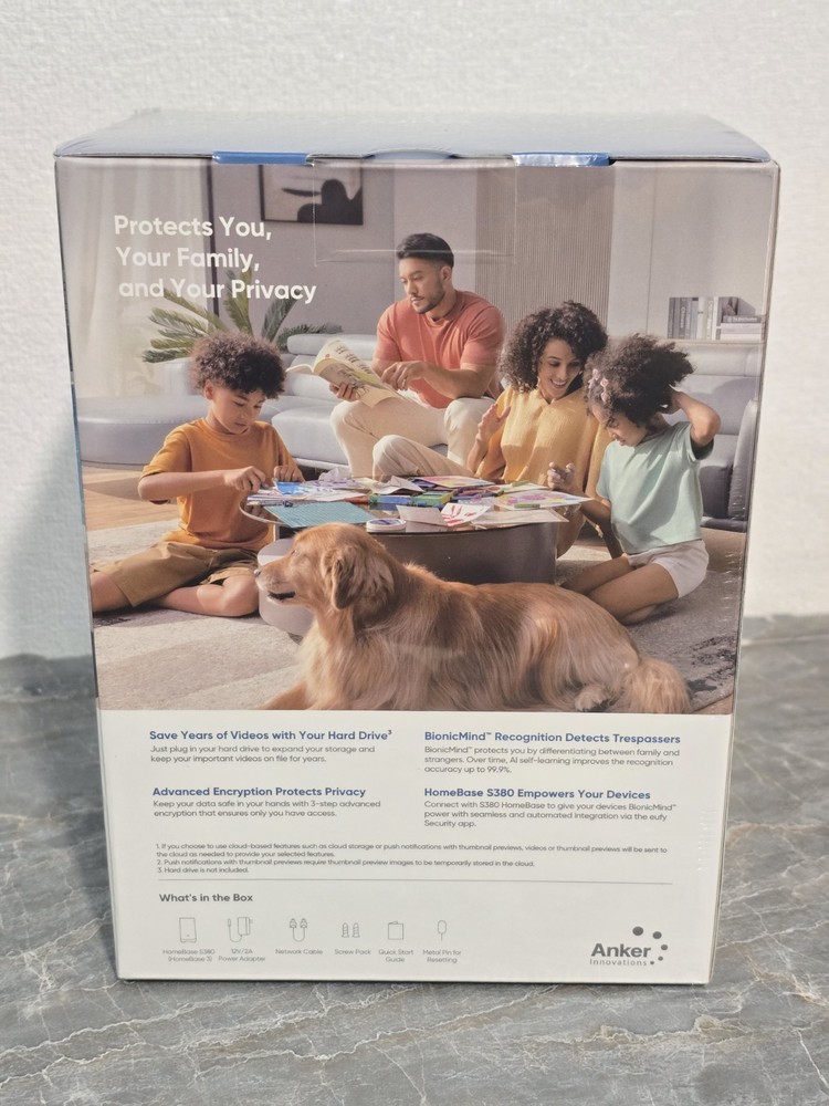 Brand new sealed box eufy Security HomeBase S380 (HomeBase 3),eufy Edge Security Center, Local Expandable Storage up to 16TB, eufy Security Product Compatibility, Advanced Encryption,2.4 GHz Wi-Fi, No Monthly Fee Included: • Homebase S3 (S380) • Power adapter • Network cable • Manual • Reset pin • Screws for hard drive (hard drive sold separately) All in box Ships with usps ground adv. Final sale
