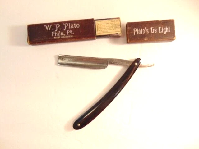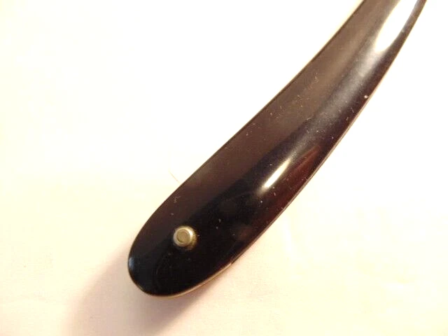 Here is an older extra Hollow Ground straight razor (etched on the face of the blade) and marker W.H. Morely & Sons, Clover Brand, Germany. The razor measures about 6 1/2 inches long. The blade itself measures 5 1/2 inches from tip to tip and is 5/8th inches wide. The razor shows signs of normal use with some wear, dirt scratches, and staining. There is some light wear on the handle, but no breaks or chips noted The box shows some wear and is not original to the razor. Please see the pictures and ask any questions. Thank you for looking. (Inv 23,421)