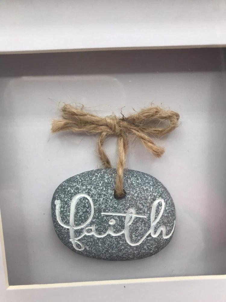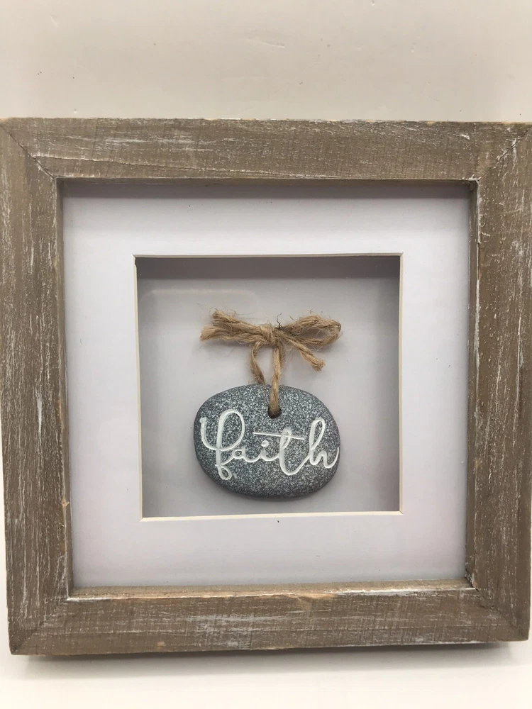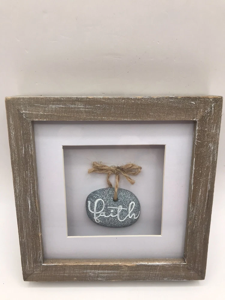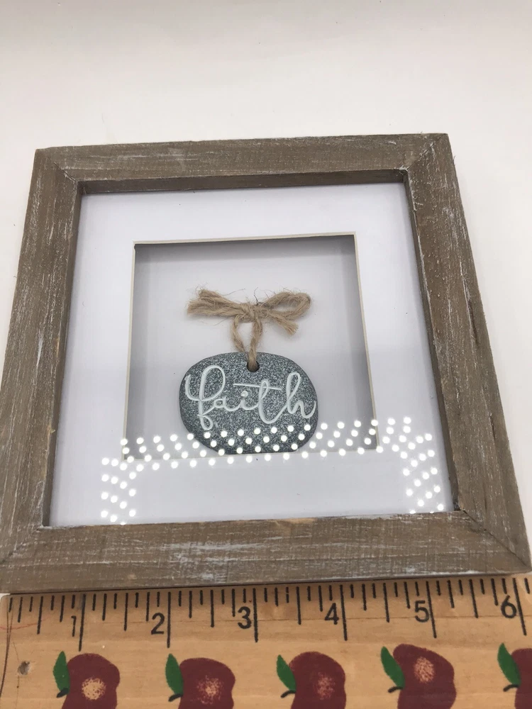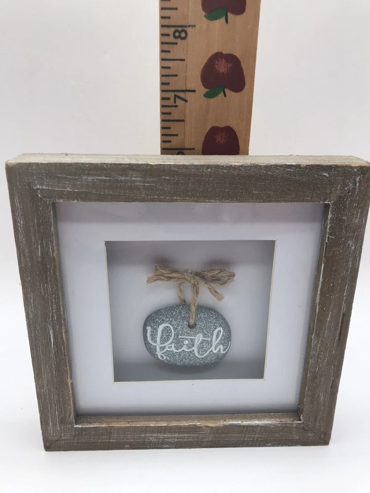 This vintage stone wall hanging/shadow box by New View Gifts is a small, square 6” plaque in great condition. It features a grey blue stone engraved with the word ‘faith’ in white cursive and framed in an aged grey wood shadow box frame. The matting is white. Measuring 6" in length and height, this vintage piece is engraved with the word 'faith' and weighs 7 oz. It can be mounted on the wall or placed on a surface, making it a versatile and meaningful addition to your home decor or home altar.