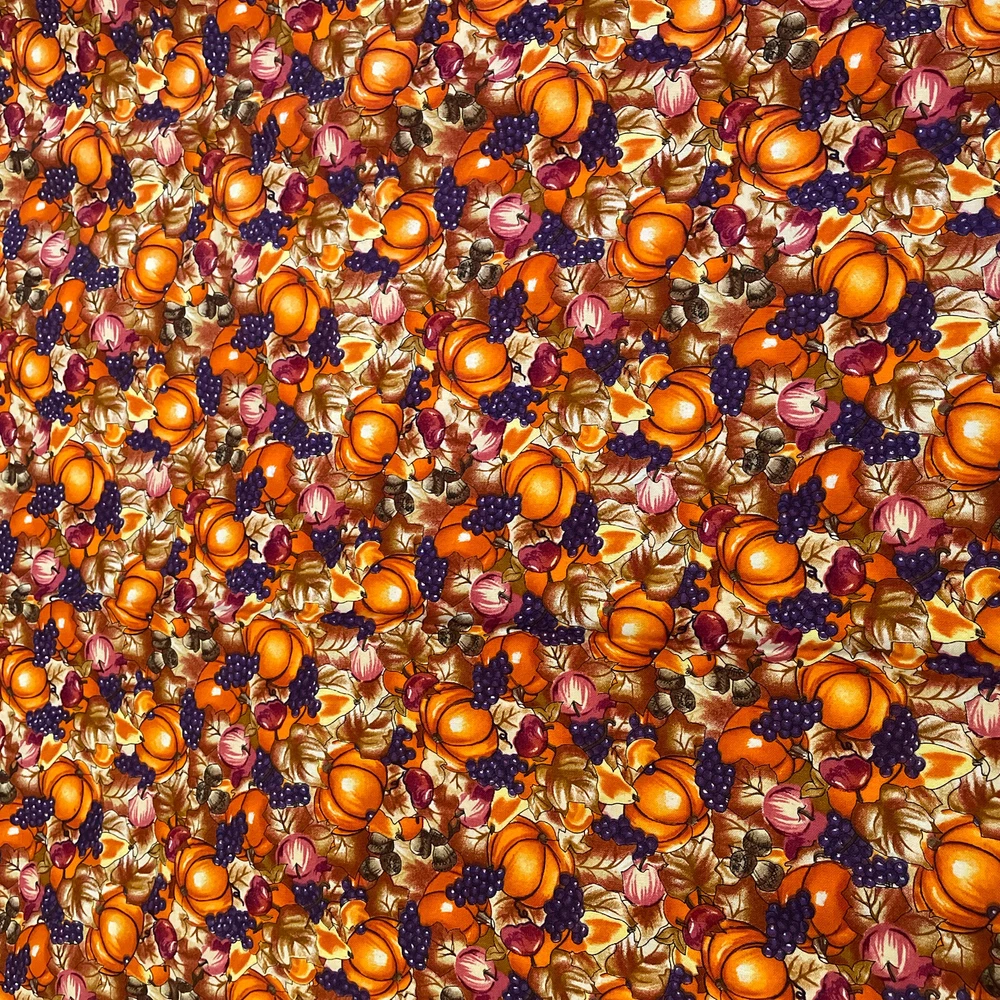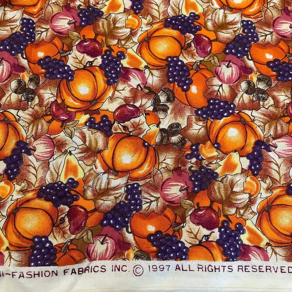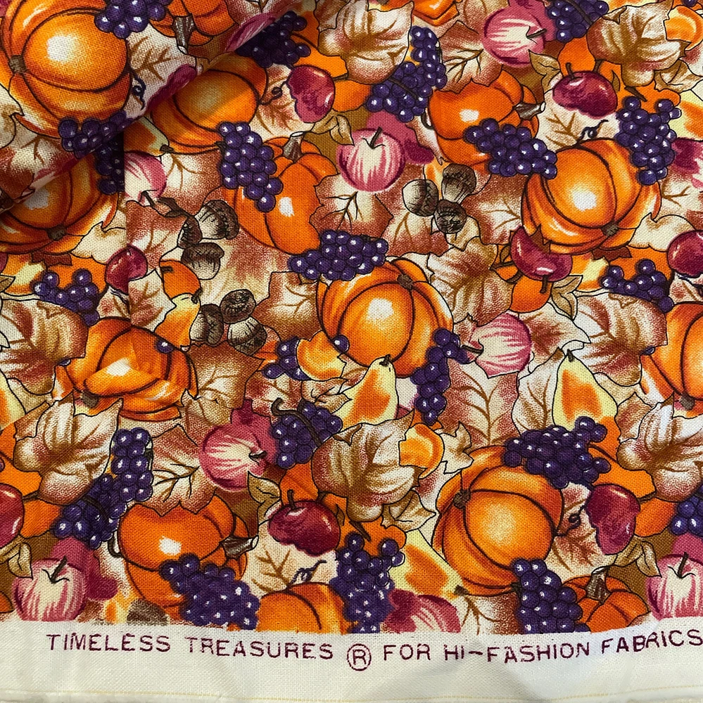 fall autumn hatvest pumpkins grapes acorns apples timeless treasures 2 yards. Has a bit of a musty odor from storage. Comes as 2 yards; 72". if multiple quantities are bought, fabric will be continuous.