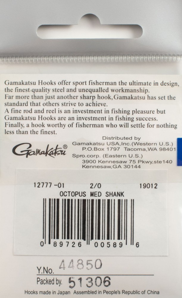 (LOT OF 6) GAMAKATSU OCTOPUS MED SHANK NICKEL HOOK 2/0 19012 K3377 (LOT OF 6) GAMAKATSU OCTOPUS MED SHANK NICKEL HOOK 2/0 19012 K3377 Gamakatsu hooks offer sport fishermen the ultimate in design, the finest quality steel and unequalled workmanship. Far more than just another sharp hook, Gamakatsu has set the standard that others strive to achieve. A rod and reel is an investment in fishing pleasure, but Gamakatsu hooks are an investment in fishing success. Finally, a hook worthy of fishermen who will settle for nothing less than the best. Hook Size: 2/0 Quantity: 6 Per Pack PAYMENT TERMS VISA, MASTERCARD, AMEX, OR DISCOVER PAYPAL APPLE PAY GOOGLE PAY PAYMENTS MUST BE MADE IN FULL WITHIN 7 DAYS SHIPPING TERMS ALL PAID ORDERS SHIP WITHIN 1 BUSINESS DAY INSURANCE IS INCLUDED IN SHIPPING PRICE COMBINED ORDER POLICY ORDERS ARE COMBINED NIGHTLY AFTER END OF ALL AUCTIONS. DO NOT PAY FOR INDIVIDUAL ITEMS ENDING ON THE SAME DATE IF YOU WANT THE ORDER COMBINED. ALLOW US TIME TO SEND YOU A COMBINED INVOICE. ORDERS THAT ARE PAID FOR ON DIFFERENT DATES ARE NOT OUR RESPONSIBILITY TO COMBINE. ITEMS MUST BE PAID IN FULL WITHIN 7 DAYS FROM THE END OF 1ST AUCTION. COMBINED ORDER PRICING BAITS - EACH ADDITIONAL AUCTION $1.00 REELS - EACH ADDITIONAL AUCTION $1.00 RODS* - EACH ADDITIONAL AUCTION $1.00 *ALL RODS WILL ONLY COMBINE WITH RODS OPERATING HOURS BUSINESS HOURS ARE MONDAY - THURSDAY 9AM-5PM CENTRAL TIME & FRIDAY 9AM-3PM CENTRAL TIME, EXCLUDING HOLIDAYS EBAY MESSAGES ARE ANSWERED DURING NORMAL BUSINESS HOURS DUE TO THE OVERWHELMING AMOUNT OF ONLINE ORDERS WE ARE EXPERIENCING, LONGER THAN NORMAL RESPONSE TIME TO EMAILS MAY OCCUR. PLEASE BE PATIENT.