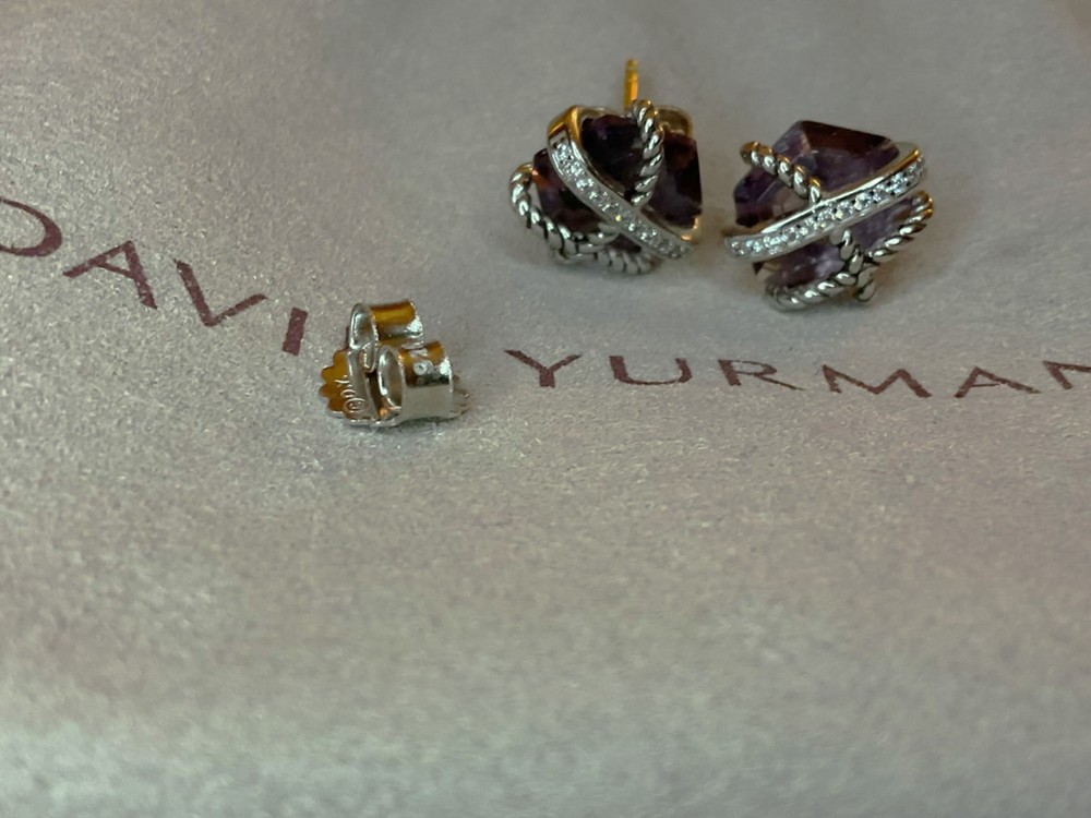 Elevate your jewelry collection with a pair that effortlessly blends modern elegance and natural beauty — the David Yurman Amethyst Cable Wrap Earrings (10mm) in a stunning mint condition. These iconic earrings showcase David Yurman’s signature cable design, gracefully wrapped around radiant 10mm amethyst stones that catch the light with every movement. The rich, regal hue of the amethyst adds a touch of sophistication while remaining versatile enough for both everyday wear and special occasions. Carefully maintained and preserved, these earrings are in mint condition and come complete with their original care pouch , making them a perfect choice for collectors or anyone seeking a luxurious yet timeless accessory. Whether you're treating yourself or searching for a meaningful gift, this pair offers unmistakable craftsmanship, enduring style, and exceptional value — all in one beautiful package. Don’t miss the chance to own a classic piece that never goes out of style. Please has any questions before buying. Happy eBaying!!!!