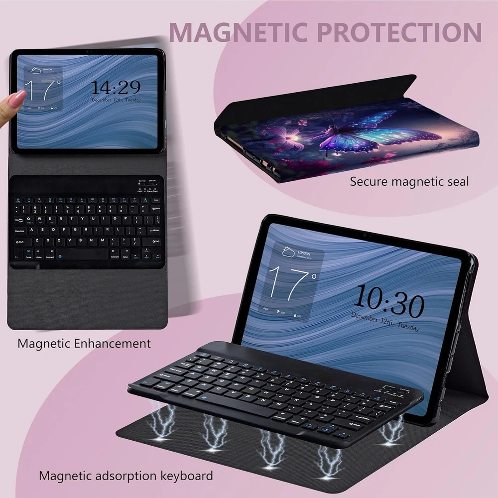 forFire Max 11 Keyboard 11 11", Glowing Purple Butterflies Product Details Product Dimensions: 9.79 x 6.44 x 0.3 inches Item Weight: 11 ounces Manufacturer: RMJKXQZG Item model number: Fire Max 11 (2023, 13th Gen) Is Discontinued By Manufacturer: No Brand: RMJKXQZG Connectivity Technology: Bluetooth Keyboard Description: Flexible Color: Glowing Purple Butterflies Style: Modern Product Dimensions: 9.79"L x 6.44"W x 0.3"H Material: pu leather Included Components: USB Cable Thoughtful Design: Built-in pencil holder is convenient to store and carry stylus pen for tablet to avoid the risk of losing the pencils; The fire max 11 Case with keyboard contains a non-slip lining and supports a multi-view bracket,allowing you to adjust the viewing angle as you like while keeping your tablet stand steadily; The detachable keyboard allows you to easily switch between laptop and tablet mode; This tablet case with keyboard has a magnet so the keyboard doesn’t move when typing. Heat Release & Full Protective: This tablet case for Fire Max 11 comes with honeycomb grid pattern design is better for heat release. The honeycomb cooling design keeps your tablet at the healthiest temperature. Thoughtful design to effectively extend life of your beloved tablet. Hard PU leather shell and soft flexible TPU bumper shock absorbtion give comprehensive protection for your kindle fire 11 model from scratches and damage. ★★★About The Product★★★ ♥The super-strong magnet ensures that the keyboard doesn't move while typing. ♥Honeycomb grid pattern design is better for heat release. ♥Supports multiple viewing angles while keeping the tablet firm. ♥Thin and light doesn't take up much space. ♥Super magnetic, won't fall off when lifted. ♥Built-in pencil holder is convenient to store and carry tablet Pencil. ♥The keyboard connection is pretty much immediate when you turn it on. ♥Detachable design allows you to easily switch between laptop and tablet mode. It is a very functional and practical design that can be used in the office or at home! ★★★Package Included★★★ ---1 X tablet keyboard case for 10th Generation 2022 ---1 X Operating manual for bluetooth keyboard ---1 X Charging cable for bluetooth keyboard ★★★Please Note★★★ ---This tablet keyboard case only for tablet 10th 10.9” 2022(Model Number: A2696/A2757/A2777). Not suitable for other tablet Tablets. ---There may be color differences due to light intensity and screen resolution. ★★★After-sales service★★★ We sincerely invite you to leave your usage experience to share with other customers! Also please do not hesitate to contact us if you have any questions about this case. We will get back to you within 24 hours.