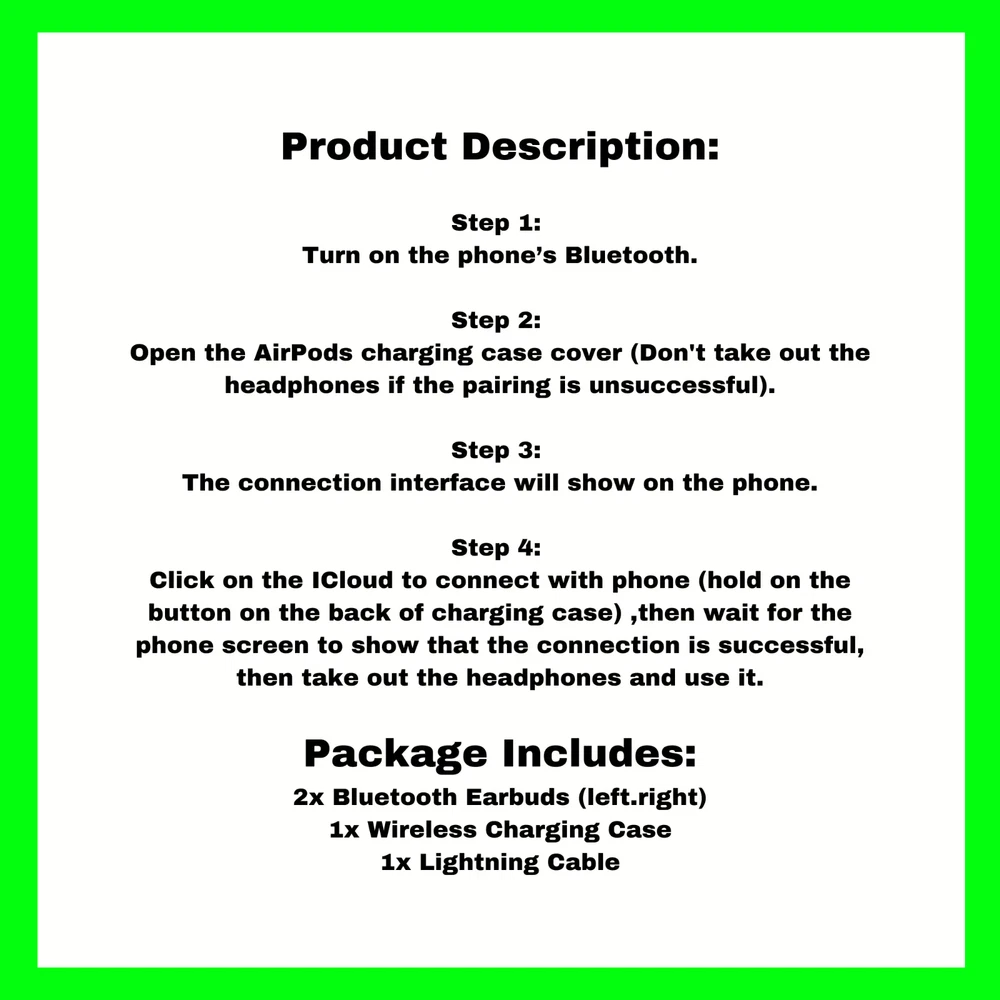 Features: Automatically on, automatically connected, Easy setup for all your iphone devices. Charging quickly in the case. Support wireless charging. Rich, high-quality audio and voice. Classic appearance design, easy to wear. Product Description: Bluetooth headset wireless headset with wireless charging case supports wireless charging Material: Plastic Color: as the picture shows, (Due to the difference between different monitors, the picture may have slight color difference. please make sure you do not mind before ordering, Thank you!) Package weight: 120g Package size: 10x10x3cm,(Please allow 1-3mm error due to manual measurement. please make sure you do not mind before ordering.)
