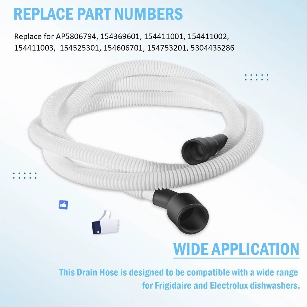 Features: 1. Dishwasher Drain Hose: Dishwasher drain hose is connected to the pump located below the lower spray arm. It helps to make proper dishwasher drainage. If the drain hose is damaged, it causes leakage. So buying a new hose to replace the broken drain hose is the best choice. 2. Wide Application: 807117001 dishwasher drain hose is compatible with most of Frigidaire, White Westinghouse, Kelvinator, Gibson, Kenmore, Sears, Tappan, Electrolux, Crosley, Admiral and Universal dishwasher models. 3. Part Number Replacement: AP5806794, PS9494138, 154753201, 154369601, 154411001, 154411002, 154411003, 154525301, 154606701, 3276641, 5304435286. 4. High Quality Material: Drain hose is made of high quality plastic and rubber, with durable and great connection performance, provides better sealing, you can stop washing your plates, bowls, cups and more by hand. 5. Satisfaction Guarantee: If you have any questions about our 807117001 dishwasher drain hose , please contact us at first time. We are glad to solve the problem you meet and we support refund within 30-Day guarantee, 12-Month warranty for quality-related issues. Descriptions: Dishwasher Drain Hose Application: 807117001 dishwasher drain hose is compatible with most of Frigidaire, White Westinghouse, Kelvinator, Gibson, Kenmore, Sears, Tappan, Electrolux, Crosley, Admiral and Universal dishwasher models. Part Number Replacement: AP5806794, PS9494138, 154753201, 154369601, 154411001, 154411002, 154411003, 154525301, 154606701, 3276641, 5304435286. Function: Dishwasher drain hose is connected to the pump located below the lower spray arm. It helps to make proper dishwasher drainage. If the drain hose is damaged, it causes leakage. So buying a new hose to replace the broken drain hose is the best choice. Package Included: 1Pcs Drain Hose for Frigidaire and Electrolux dishwashers
