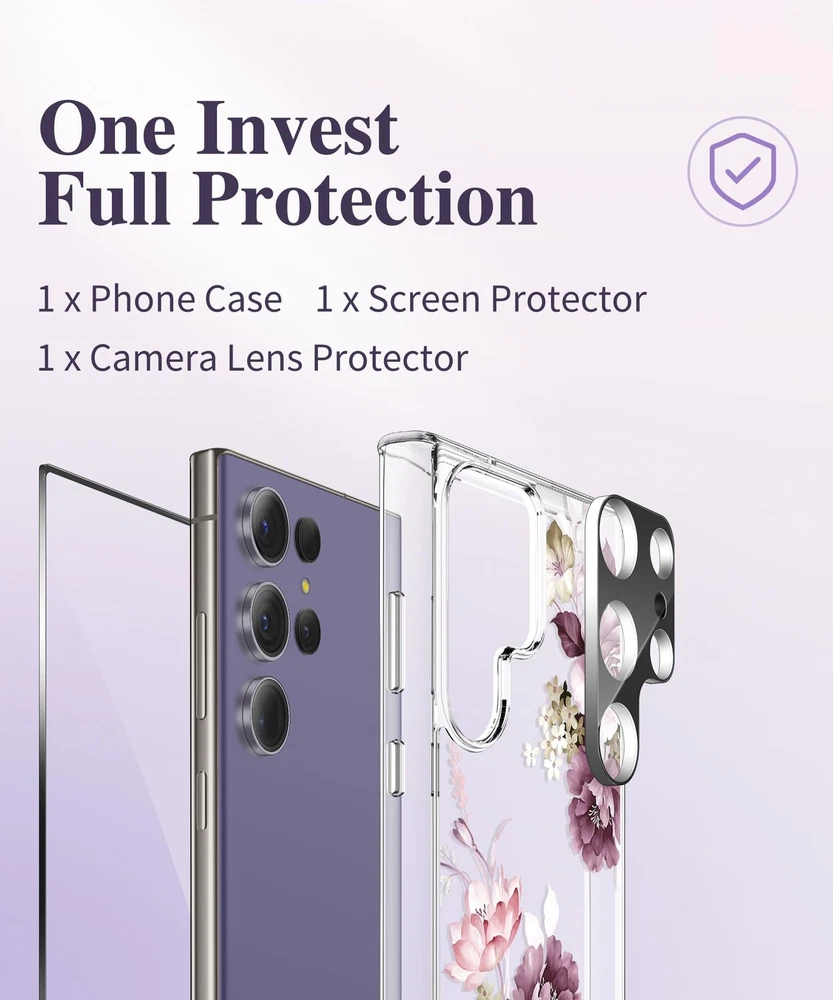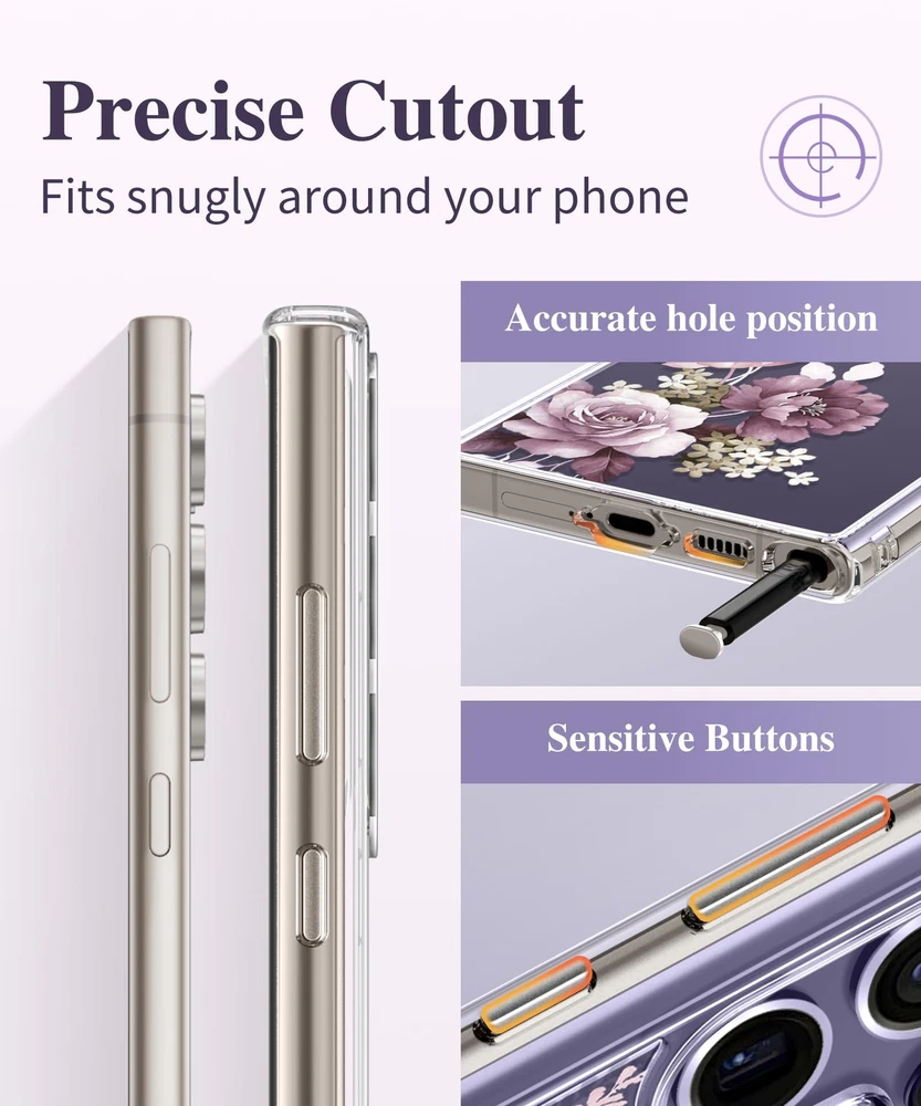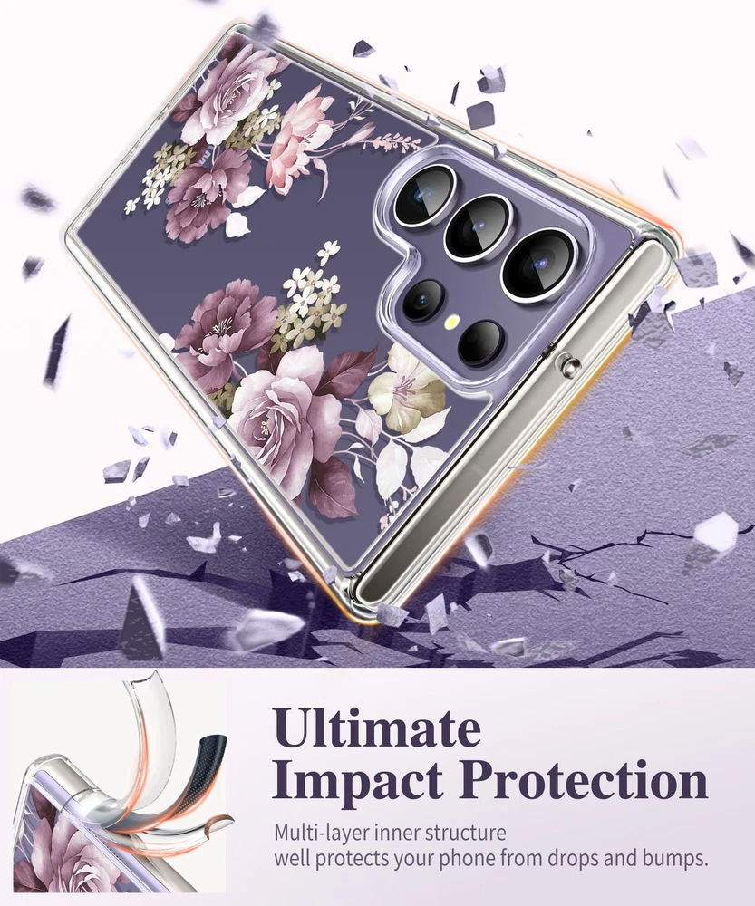 Compatibility- Ultimate Protective ONLY Compatible with Samsung Galaxy S24 Ultra Case 6.8 INCH 2024 Release. Elevate Your Style, Protect Your Device! MIL-Grade Protection & Raised Bezels Protection - Certified by military-grade drop protection standard, our compatible with Samsung S24 Ultra case can withstand drops of up to 10-foot without causing any damage. Reinforced corner bumper offers extra protection at every corner. Thoughtfully raised bezels around the screen and camera provide additional protection when laid on flat surfaces. It also comes with a screen and a camera protector. Feel confident, no matter where you go! Premium Material & Never Yellowing - This S24 Ultra case is made of high-quality PC and TPU materials. The hard PC back ensures robust protection, while the flexible TPU bumper provides a secure grip and shock absorption. Defy time with our non-yellowing formula. Revel in enduring transparency that keeps your phone looking as vibrant as the day you unboxed it. Flower Design & Precision Cutouts - Embrace elegance with our timeless floral print. Unleash your individuality while maintaining the phone's original aesthetic. Every cutout is meticulously crafted to match your device's buttons and curves. Enjoy unhindered access. blends seamless style with total device defense, achieving the perfect fusion of fashion and functionality. Satisfactory Service & Join Us - Our commitment to your satisfaction goes beyond the purchase. Experience peace of mind with our responsive after-sales service. We're here to address any concerns, ensuring your experience is nothing short of exceptional. Unlock the perfect fusion of style and protection with the Galaxy S24 Ultra cover set.