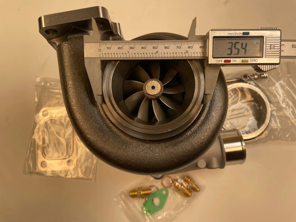 Turbo model for G-Series G35-900 G35-900 A/R.83.T3 horsepower:550-900HP Fit engine displacement 2.0-4.0L 9 blades Point billet compressor wheel bearing type:Ceramic Dual ball bearing cooled type:water and oil cooled oil restrictor & water fittings included Includes Oil Feed (1mm) Restrictor Fitting to -4AN Includes two Coolant Fittings to -6AN Includes Turbine Housing Outlet V-Band Clamps Compressor details a/r 0.72 anti-surge air inlet 4" air outlet 2.0" inducer 61.75mm exducer 76.60mm Compressor Trim: 65 Turbine details a/r .83 Turbine Housing Inlet: T3 flange Turbine Housing Outlet: 3.55 inch (90mm)O.D. w/81mm centering ring V-Band inducer 68.00mm exducer 62.30mm Turbine Trim: 84 ****************Very Important Points******************* 1.Please make sure to open the box immediately when taking delivery, to avoid any potential issues Do NOT sign for any damaged package and report it to the couriers immediately, let the couriers sign for damage, then Contact us please! We will work with the couriers to solve shipping issues. 2.we can accepet customized order!more products you order, the price will be nice.