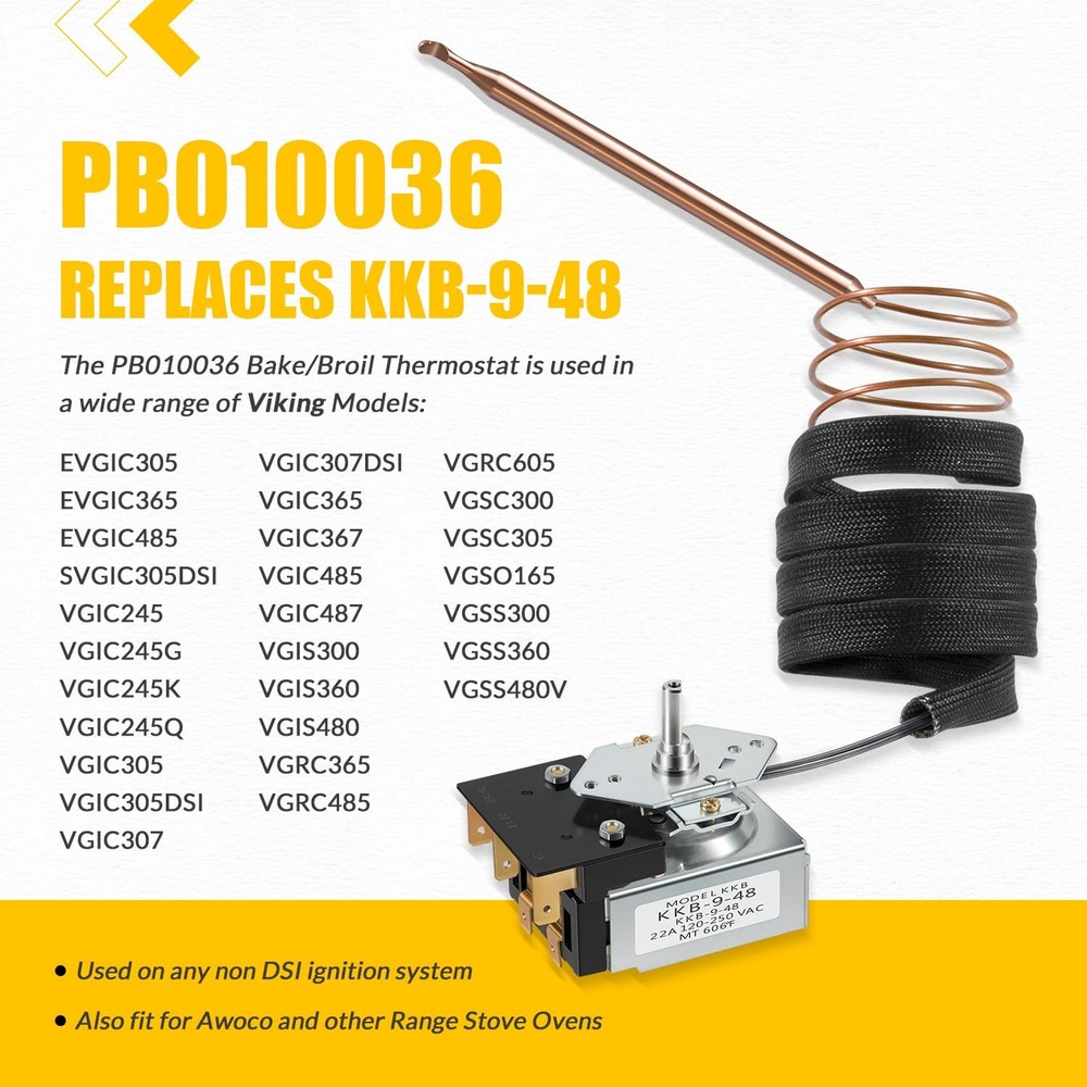 for Viking Range/Stove/Oven Bake/Broil Thermostat PB010036 Wide Compatibility: The PB010036 Bake/Broil Thermostat is used in a wide range of Viking Models — EVGIC365; EVGIC485; SVGIC305DSI; VGIC245; VGIC245G; EVGIC305; VGIC245K; VGIC245Q; VGIC305; VGIC305DSI; VGIC307; VGIC307DSI; VGIC365; VGIC367; VGIC485; VGIC487; VGIS300; VGIS360; VGIS480; VGRC365; VGRC485; VGRC605 (All VGR/VCM/VRT Units); VGSC300; VGSC305; VGSO165; VGSS300; VGSS360; VGSS480. Used on any non DSI ignition system. It is also fit for Awoco and other Range Stove Ovens, ensuring universal Product Specification: Replacement Part Number: PB010036 / KKB-9-48; Dimensions: 2-7/8” x 1-7/8”; Current: 22A; Voltage: 120-250 VAC; Temperature Range: 100-450℉ (38-232℃); Max Temperature: 606℉ (320℃); 1/4" x 6-3/4" copper bulb with 48" capillary. Please notice that don't bend too much or cut the capillary off the probe bulb, liquid or oil is inside Precise Temperature Control for Baking and Broiling: This thermostat offers precise control of oven temperatures up to 606℉ (320℃), ensuring consistent heat for both baking and broiling operations. It allows you to cook with accuracy, achieving perfect results every time, whether you’re baking delicate pastries or broiling meats Durable Stainless Steel Construction: Built with high-quality stainless steel, the PB010036 Thermostat Replacement is highly durable and resistant to wear and tear. It is designed to withstand harsh kitchen environments, providing long-lasting performance and reducing the need for frequent replacements Efficient Performance and Energy Saving: The KKB-9-48 PB010036 thermostat is engineered for efficient performance, helping your oven maintain the desired temperature with minimal energy consumption. This not only improves cooking efficiency but also reduces energy costs, making it an economical option for your kitchen Easy Installation for Quick Replacement: The KKB-9-48 PB010036 thermostat is designed for simple and quick installation. With its universal fit, it allows users to easily replace the old thermostat without needing too much professional help, saving time and effort Satisfaction Guarantee: If you're not satisfied with the tool, simply return it for a full refund in 60 days.If you have any questions, please feel free to contact us and we will reply you as soon as we can. RK-17MH Wall Hydrant Metal Handle Repair Kit Fits For Woodford Model 17 Faucets- 22.60 USD Free shipping For Briggs and Stratton Craftsman Pressure Washer Pump Valve Check Kit 190591GS 23.69 USD Free shipping For Mercruiser Gimbal Bearing Oil Seal Alpha One Gen 1,2/R/MR Housing #26-88416 9.60 USD Free shipping 621957 Burner Orifice Assembly Parts For Norcold N6 N8 Series RV Refrigerators- 19.76 USD Free shipping 23300 Small Engine Valve Spring Compressor Tool Fit 3/4" to 1-1/16" Valve Spring 30.80 USD Free shipping Z-LKR-OEM Locker Sensor Bypass Harness Fit Jeep Wrangler JL Gladiator JT Rubicon 89.59 USD Free shipping Aluminum Fish Finder Gimbal Mount with 1.5" / C Size Ball for Garmin / Lowrance 41.57 USD Free shipping Serpentine Belt Wrench Removal Installer Tool For Honda Acura Accord CR-V Civic- 41.50 USD Free shipping Water Pump Impeller Kit For Chrysler Force FK1069 75 85 90 100 105 115 125 140hp 33.01 USD Free shipping Transmission Shifter Seal Remover & Installer Tools Set with Seal For GM 4L60E 19.55 USD Free shipping Rear Wheel Axle Bearing Kit for Honda 2014-21 TRX420 SRA Rancher TRX500 Foreman 55.57 USD Free shipping High Pressure Oil Pump HPOP Master Service Kit for 94-03 Ford 7.3L Powerstroke 46.42 USD Free shipping Extended Run Fuel Gas Cap for Honda / Champion / Westinghouse Generator 16.80 USD Free shipping Washer Dryer Noise Anti Vibration Pads Washing Machine Reduction-4PCS 14.40 USD Free shipping 8PCS Door Hinge Nuts for Jeep 2007-2021 Wrangler JK JKU JL JLU Sports 2/4 -Door 20.59 USD Free shipping 64mm 14 Flutes Oil Filter Cap Wrench Removal Tool For Toyota, Lexus 2.5L-5.7L 6.99 USD Free shipping Oil Filter Cap Wrench Cup Socket Remover Tool For Toyota Lexus 64MM 14 Flutes/ 6.99 USD Free shipping For Pertronix 1181 Ignitor Electronic Ignition Conversion Kit Delco 8 Cylinder 44.91 USD Free shipping T-Handle Gear Shifter Knob for Jeep Dodge Challenger Compass Jeep Wrangler JK 24.70 USD Free shipping High Pressure Oil Rail O-Rings Kit Injector Seal&Nipple Cup Socket for Ford 6.0L 71.30 USD Free shipping Generator Cover Storage Pocket Waterproof for Honda EU2200i EU2000i Companion 19.80 USD Free shipping For WFCO WF-8955-AD-MBA Converter Lower Main Board Assembly 55A, 105-130VAC 950W 144.76 USD Free shipping for 010-11442-00 Garmin NMEA 2000 Starter Kit with Cable Terminator T-Connectors 82.69 USD Free shipping 4.5" Cable Boot for T-H Marine CB-4-DP Boat Motorwell Transom Steering Wire Boot 13.60 USD Free shipping 780044-1 UC H7 R2 Helix 7 Unit Cover Silicone for Humminbird Helix with 7 Series 33.13 USD Free shipping 740146-1 Gimbal Mounting Bracket Kit For Humminbird Helix-7 Series Fish Finders 29.80 USD Free shipping Universal A/C Hose & Fitting Kit 42810100 for Custom Air Conditioning Lines 122.99 USD Free shipping for Gallon Bottles Wide-Mouth Quart Bottl Hand Oil Transfer Pump Fluid Pump 30cc 17.59 USD Free shipping 14048000 1" Universal Extension Kit for Grohe Rapido SmartBox Rough-In Trim 25MM 51.91 USD Free shipping for Zodiac Jandy R0445400 Diffuser Kit ePump PlusHP WaterFall JEP SHPF PHPF MHPM 59.50 USD Free shipping 2 Pack Boat Truck Cargo Trailer RV Door Grab Handle Assist Bar Camper Gate Metal 30.09 USD Free shipping 010-11425-01 Threaded Transducer Power Cable for Garmin GLS 10 Sonar Module- 36.91 USD Free shipping 73995 Hot Tub Pressure Switch for Watkins Caldera,Hot Spot, Solona Hot Tub 2006+ 46.78 USD Free shipping for Watts 1/4"-1/2" 009 Total Relief Valve Repair Kit Assembly 0887298 RK 009 82.19 USD Free shipping Springs Kit &Parking Brake Pad Shims for Polaris Ranger 500 700 800 900 2203148 37.26 USD Free shipping Fryer Thermostat Pitco 
