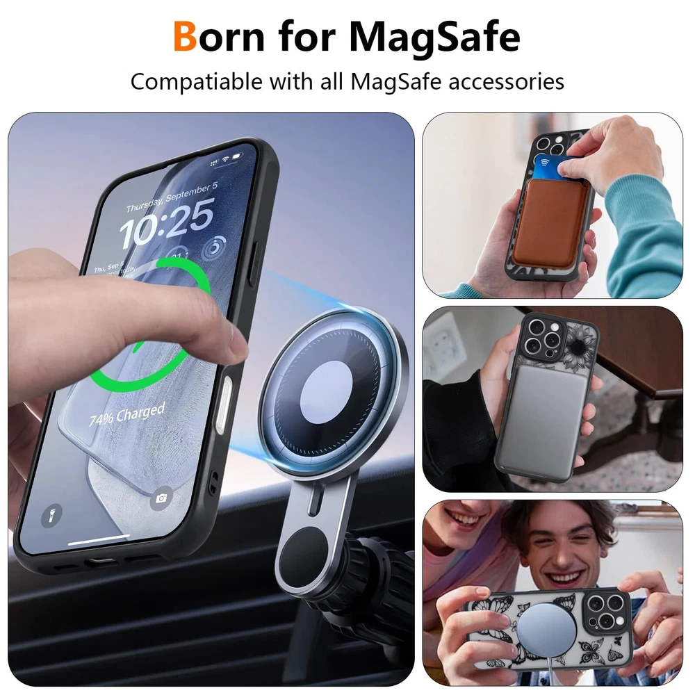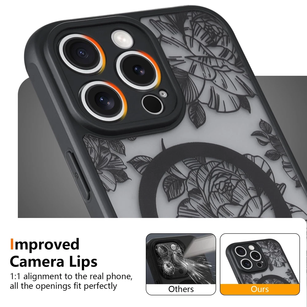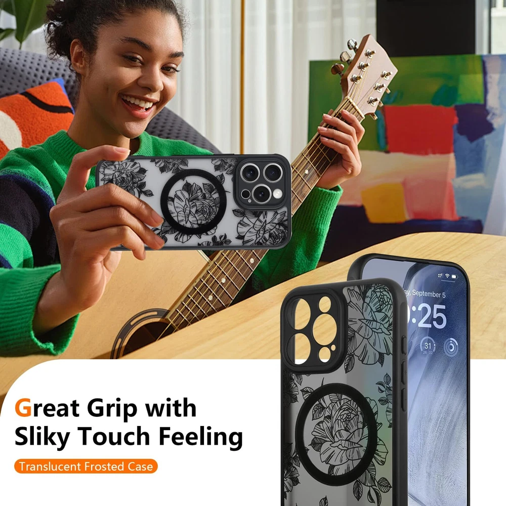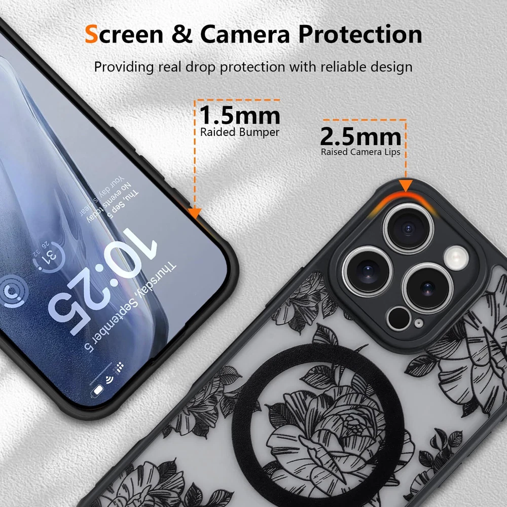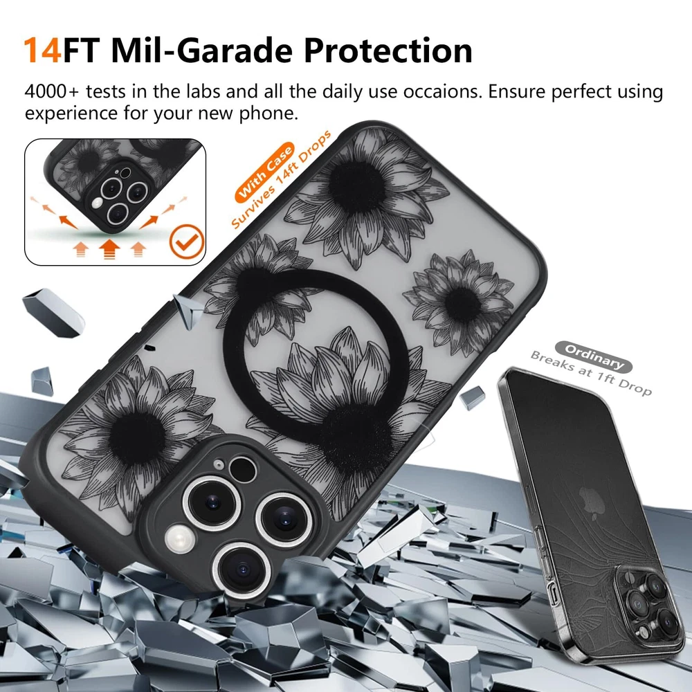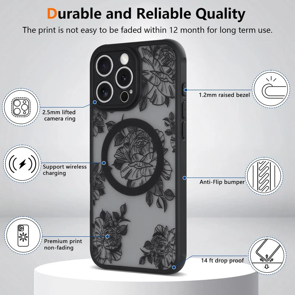 【18N Super Strong Magnetic】designed for iPhone 16 Pro Max case boasts a 18N magnetic strength, thanks to 38pcs upgraded N52 magnets with magnetic attraction of 2600gf, it's nearly 7× more powerful than standard magnets. The magnets are recessed and after multiple pressure processes, the magnetic ring is securely housed inside the multi-layer PC back, ensuring that it is not only strong, but also incredibly durable. 【MagSafe Compatibility at Its Best】Our iPhone 16 Promax case is perfectly compatible with all MagSafe accessories and other Qi wireless chargers. Whether you're using magnetic leather wallet and sleeve, stand wireless charger, credit cards or key fobs, this phone case ensures optimal alignment for faster and more stable wireless charging with original 16W power. So 16 Pro Max case isn't just about magnet strength, it's also about practicality 【Military-Grade Drop Protection】case for iPhone 16 Pro Max has been drop-tested 3,000+ times to withstand drops up to 14ft that provides 3× the shockproof protection, including a 4-corner upgraded invisible flex cushion and reinforced soft cushioning TPU bumper that disperses up to 98% of the impact when your 16 Pro Max is experiencing impact. With it, you don't have to worry about your phone falling out of your pocket and breaking it anymore! 【Upgraded Full-Body Protection】The iPhone 16 Pro Max Case comes with 2 pieces 9H Clear Tempered Glass Screen Protector, its silky smooth and sturdy providing the ultimate new machine experience. And It must be pointed out that the 16 Pro Max case's 2.5mm raised full-covered camera bezel and 1.0mm raised bumper protect the camera and screen well from breakage and scratches, giving your phone all-around rugged protection. 【Sleeky Touch, Stylish Design】We believe that protection should not come at the expense of style, and the iPhone 16 Pro Max cases feature floral print design, making your phone more fashionable. In addition, the oleophobic nano-coating on the surface resists fingerprints, watermarks, grease and dust, providing not only reliable protection but also a sleeky touch and great grip. You can enjoy the best using experience!