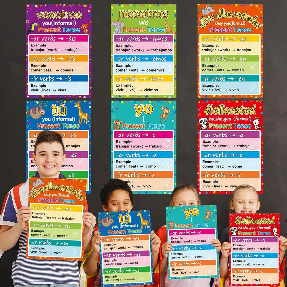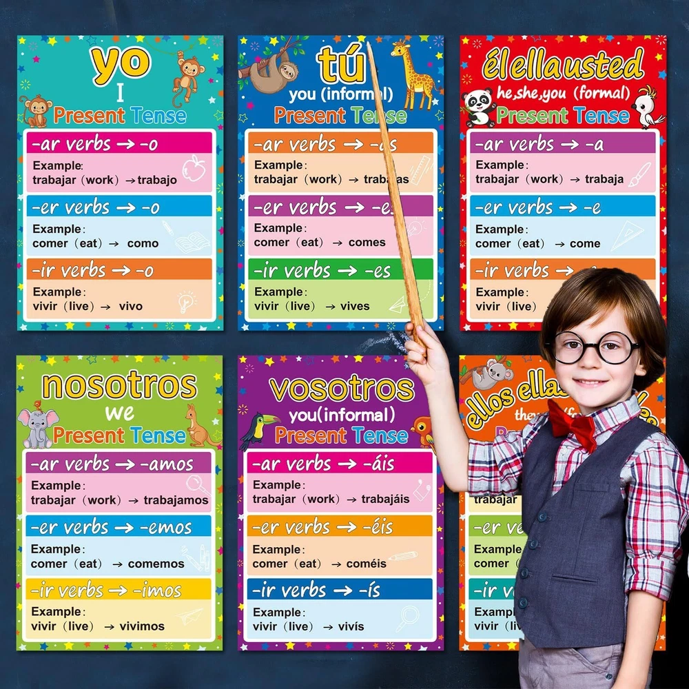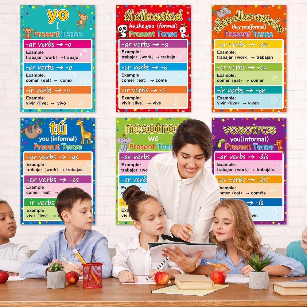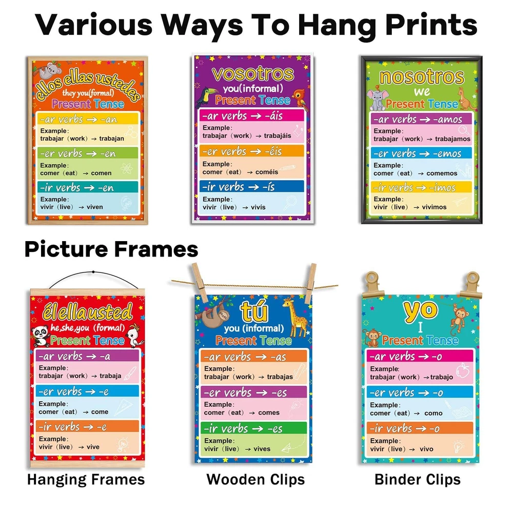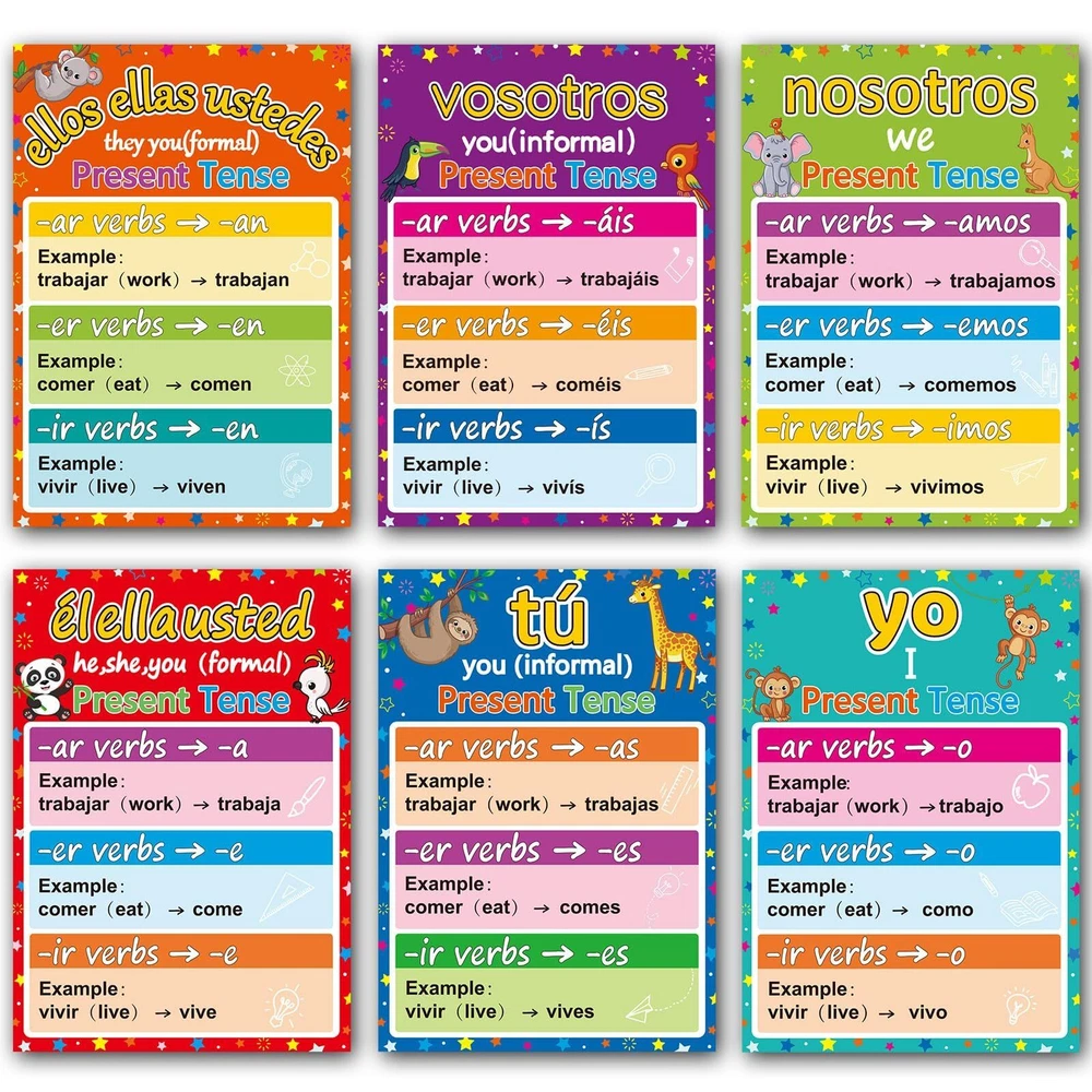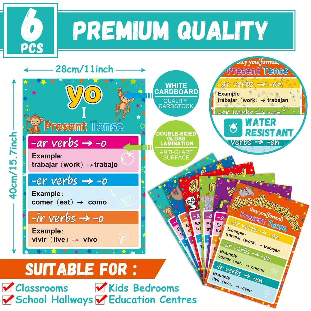 6 Color Spanish Verb Conjugation Posters Spanish Grammar Posters Spanish Charts Classroom Decorations for Teachers Classrooms Elementary Middle School High School Classroom Poster Posters for School Package: 6 Color Spanish Verb Conjugation Posters Quality: strong, durable and reusable. Bright color,waterproof without fading reusable. 【Product Dimension】Each Spanish classroom decor posters measures 16*11inch/40*28cm,large enough to be recognized.You will get it with glue point dots, so you can easily put them on the wall to decorate classroom, home, tutoring or toy room to brighten your space. 【What You Get】Includes 6 pieces Spanish verb conjugation posters.Their content includes present tense regular AR, ER, and IR verb conjugations.They are all perfect for Spanish classroom decoration needs or homeschooling needs. 【Attractive Design】Our Spanish verb conjugation banners are all new design with rainbow,balloons,colored flags and stylish fonts.The colorful well designed pictures are very eye-catching and can easily arouse students' interests.They can not only learn knowledge from it but also use it as classroom decoration. 【Meaningful and Inspirational】Each Spanish banners features different verb conjugation.They are great for home schooling elementary and middle school.They are a perfect gift to support children, families and teachers on their Spanish learning journeys. 【High Quality】These Spanish bulletin board are made of quality poster paper and coated with laminated PET film layer, good enough for using as banners.They are waterproof, tear resistant, reusable and marks on them written by water-based dry erase markers could be erased.