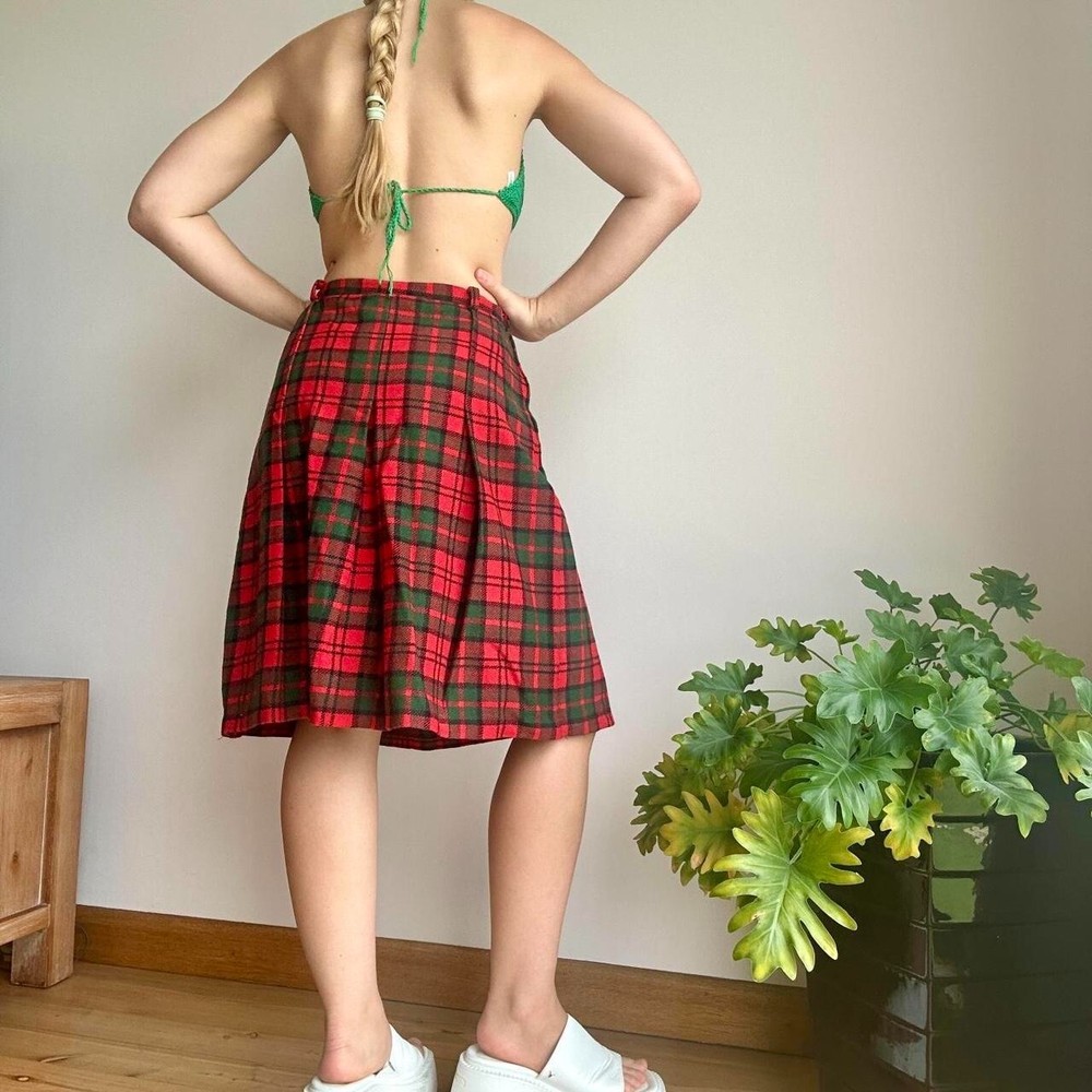 vintage red tartan gingham wool pleated midi skirt brand: glenleigh tartan by warrnambool no size but would fit sizes 6-8 flatlay measurement (cm) waist: 33 length: 62 one small hole shown in last image pure wool material instant buys are welcome international shipping available eco friendly packaging item modelled on a size 8 who is 159cm tall unpinned 1 .