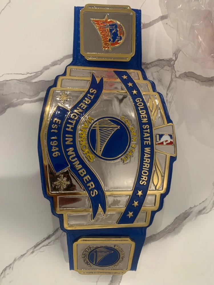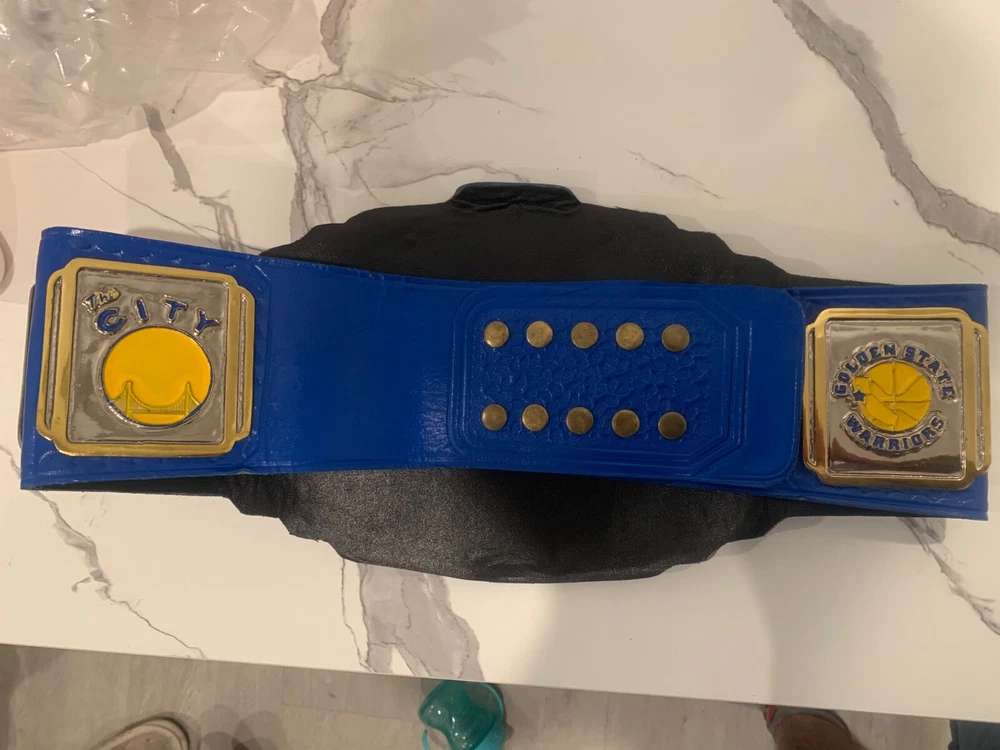 The product is a belt featuring the branding of the Golden State Warriors, a professional basketball team in the National Basketball Association (NBA). As a fan apparel and souvenir item, this belt is designed for supporters of the Golden State Warriors to showcase their team pride while adding a sporty touch to their outfit. Perfect for fans of basketball and the Golden State Warriors, this belt is a stylish accessory that allows fans to represent their favorite team both on and off the court. This is customer made hand made just like pro belts