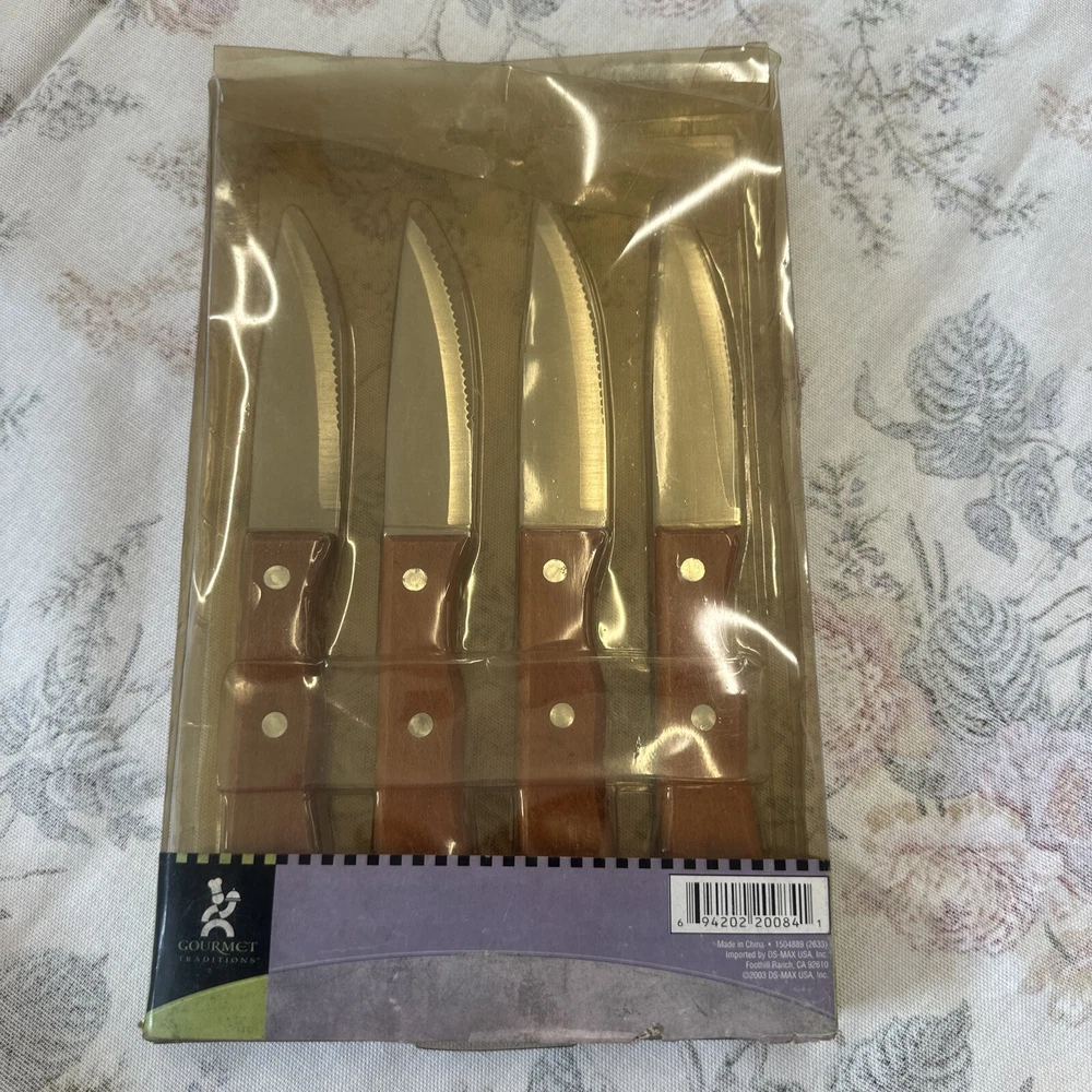 This 4 piece knife set is perfect for any meat lover. The set includes a steak knife, all crafted with a serrated blade edge for efficient cutting through any meat. The handles are made of a combination of wood and stainless steel, ensuring a sturdy and comfortable grip. The set is ideal for home or professional use, and is compatible with any type of meat. Add this Gourmet knife set to your collection today!