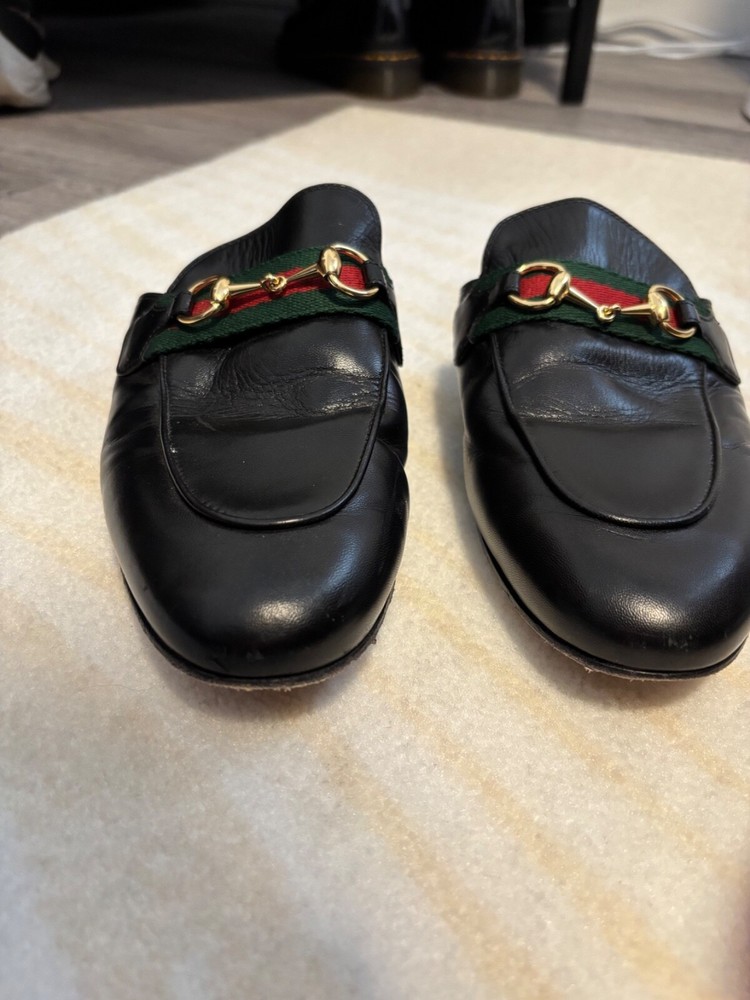 Black leather with tonal piping Women's Green and red Web Horsebit detail Leather sole Flat .4" height Made in Italy This style runs small, we recommend sizing up