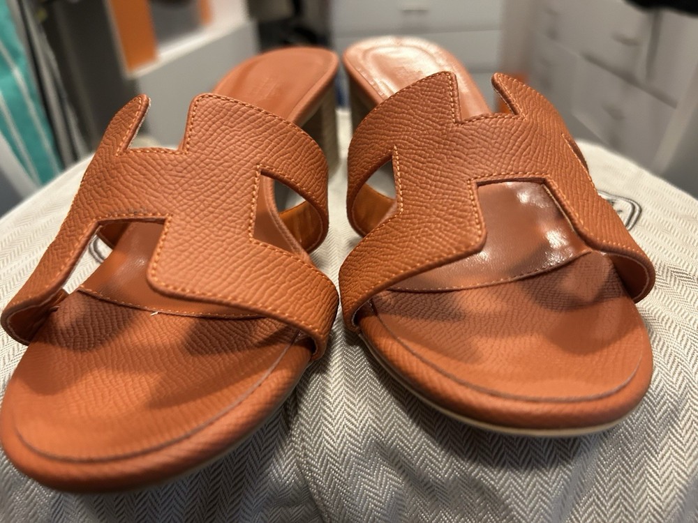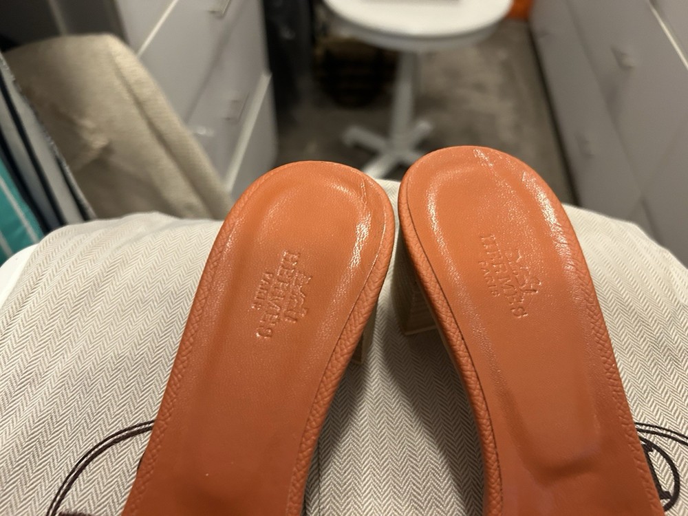 Purchased overseas by a relative, too small, these fit size 7 or 7.50, even though it says size 38. I am selling 2 pairs of sandals. One in orange and one pair in blue. The product is a pair of new Hermes sandals in blue, size 38 (US 7.5). They are slip-on sandals with a low heel and H cut-out style, featuring the brand's logo accents. Made of leather with a comfortable insole and outsole, these sandals are perfect for casual occasions in the summer and spring seasons. The design of the sandals is a cultural homage, adding a touch of quiet luxury to the wearer's ensemble.