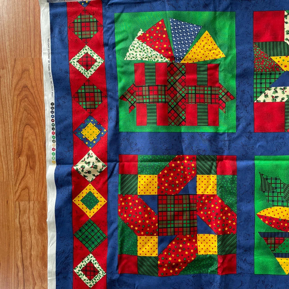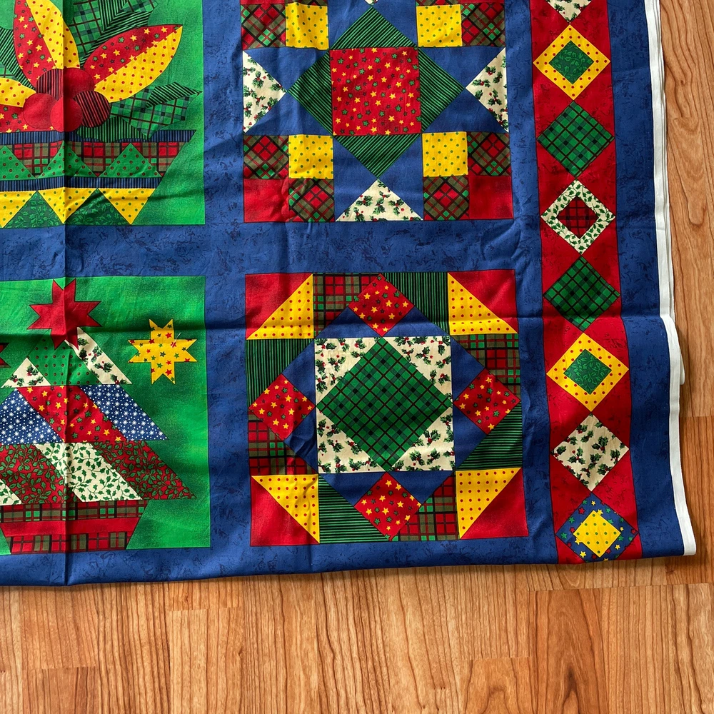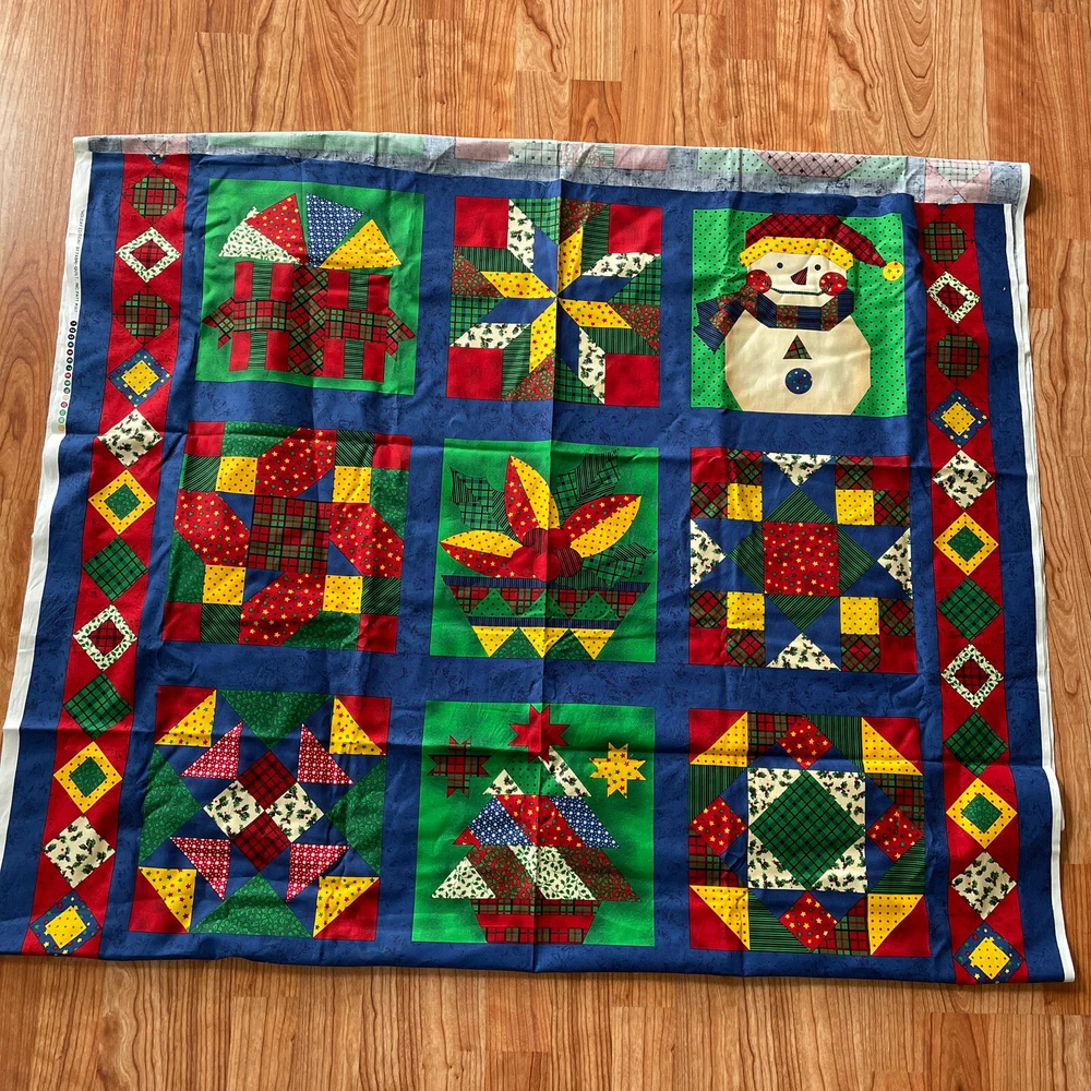 holiday editions Christmas Bright Snowman Present Tree Cheater Panel fabri quilt. Comes as shown. Each block measures about 10”x10”. Entire fabric measures about 35” long and 44” wide