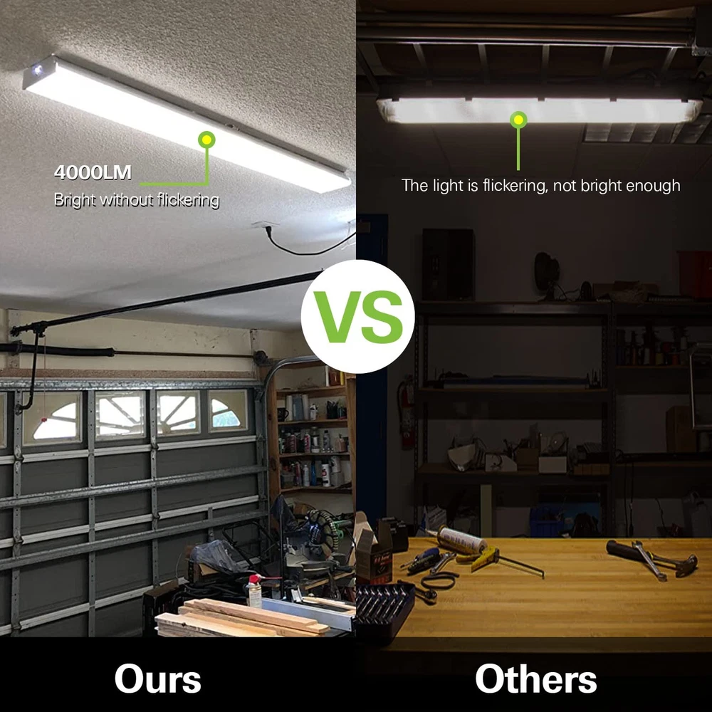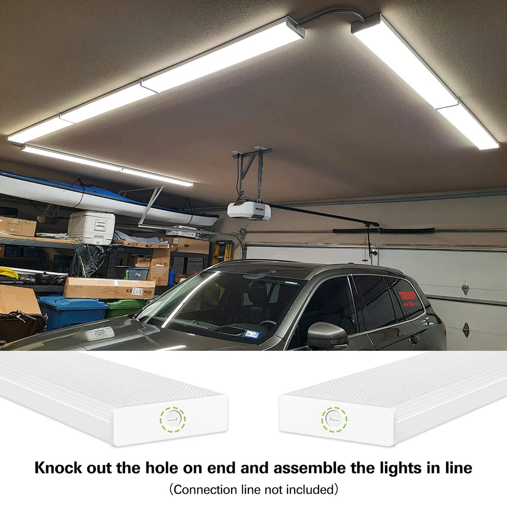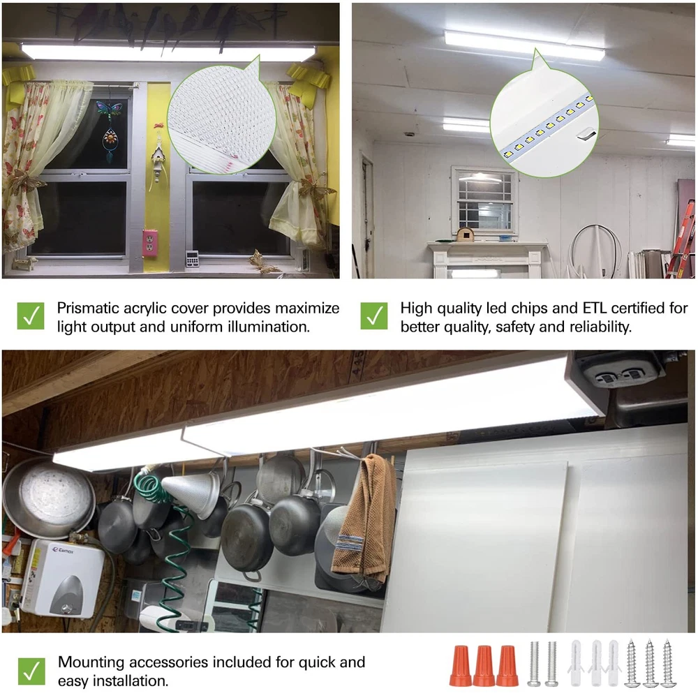 UP to 75% ENERGY SAVING - Hykolity's 4FT 40W LED Wraparound light at 4000K Neutral White provides over 4400lm,which makes the perfect replacement for traditional 2 lamp 32W fluorescent wrap light fixture and cuts down the electric bill up to 65% instantly UNIQUE DESIGN - Designed with an impact resistant-prismatic acrylic lens to maximize light output and distribution, this wraparound light fixture uses ultra-efficient LED technology to help lower energy usage and costs, eliminates the need for bulb replacements QUICK&EASY INSTALLATION- The LED wrap light is easily flush mounted to the wall or ceiling with the mounting accessories(included). NO BALLAST TO EVER REPLACE WIDE APPLICATION -The 4ft led shop lights are perfect for use in garage, office, workshop,workbench, kitchen, basement, closet, storage rooms, warehouse, hallways and so on SAFETY - ETL certified for better quality, safety and reliability