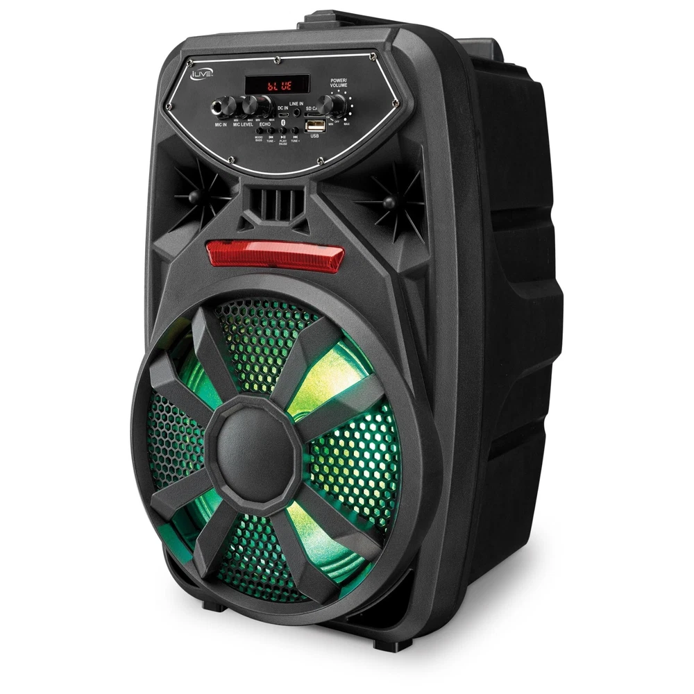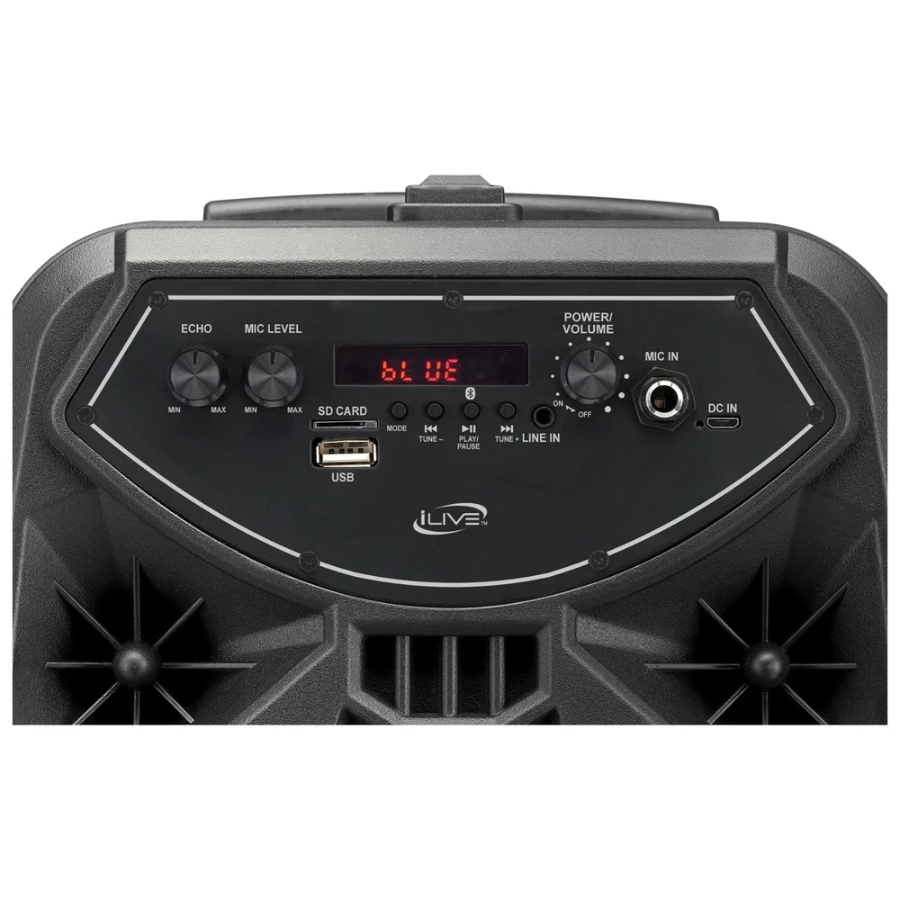 Full-bodied sound and low, lows are what you want from a party speaker. That’s exactly what you get with this iLive Wireless Tailgate Party Speaker. Connect your Bluetooth device and get the party going with room-rockin’ bass and a microphone input to make announcements to the crowd. If you want to take the party to the next level, turn on the LED light effects and create a concert -like atmosphere. The transportability is second to none, the ergonomic retractable handle and wheels make moving this speaker around easy. Dimensions:9.84 x 9.25 x 16.93 in. Supports Bluetooth v5.0 Supports profile A2DP (Advanced Audio Distribution Profile) Wireless range: 60 feet Built-in 8" speaker FM scan radio Line in (3.5mm audio input) Micro SD slot and USB port: supports audio file playback Microphone input Micro-USB port for battery recharge Retractable pull handle and roller wheels for easy transport Frequency response: 70Hz - 10kHz Sensitivity: 81dB Voice prompts announce speaker functions and make Bluetooth pairing easier Color changing LED light effects Play/pause/pairing button Skip forward/skip back/tuning buttons Volume/on/off control Function mode and speaker light on/off switch Microphone volume control Echo control LED display DC battery power: built-in rechargeable lithium ion battery Battery life: ~6 hours at 50% volume Battery life: ~2.5 hours at 100% volume Charge time: 4-5 hours Micro-USB to USB cable 90-Day Limited Warranty Features Built-in wheels Brand iLive Model ISB380B Color Black Manufacturer Part Number ISB380B Assembled Product Weight 5.4 lb Manufacturer DPI Inc. Battery Life 6 h Power Type Battery Wireless Technology Bluetooth Recommended Location Indoor, Outdoor Shape Rectangle Electronics Feature LED Lighting Assembled Product Dimensions (L x W x H) 9.84 x 9.25 x 16.93 Inches