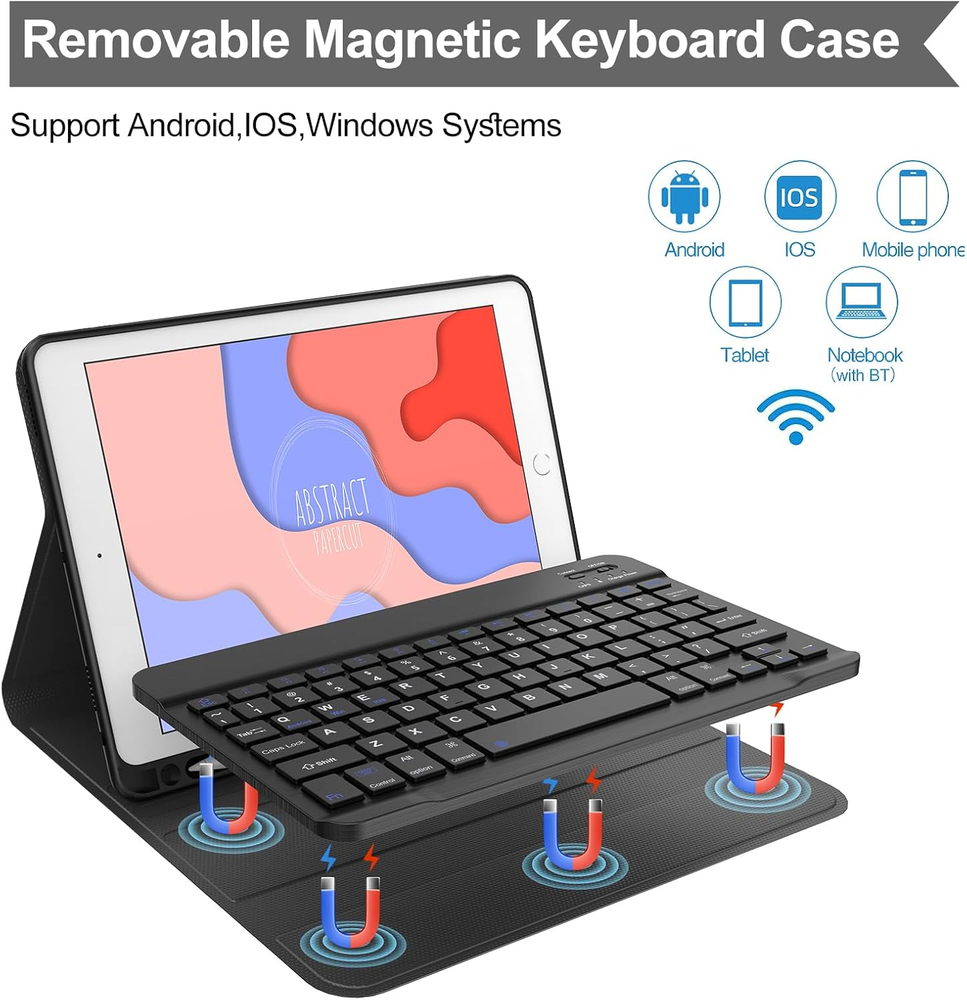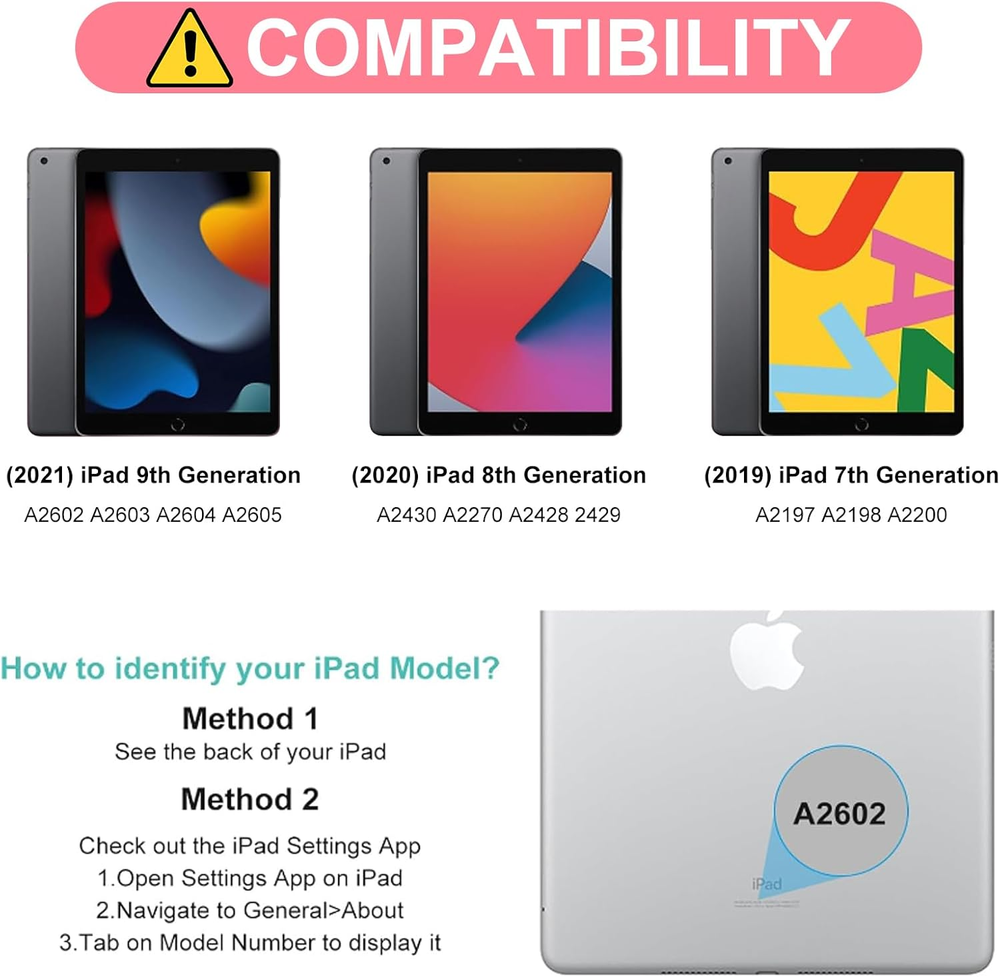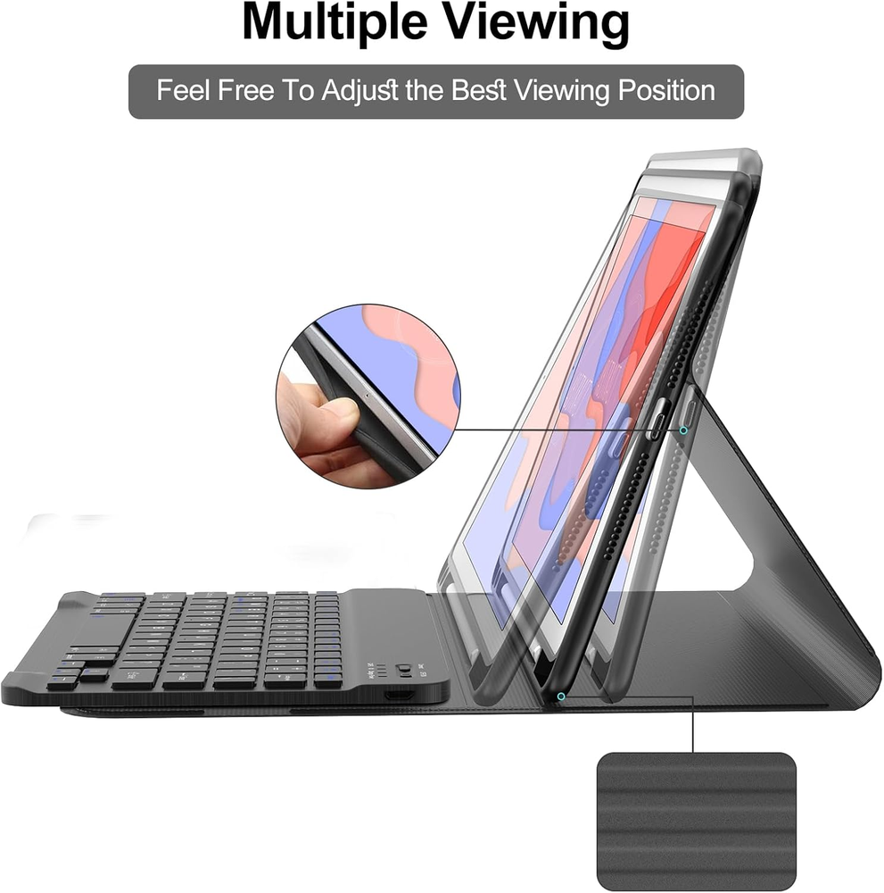 ☎【Compatible Devices】:iPad 9th Generation 2021 (Model: A2602/A2603/A2604/A2605), iPad 8th Generation 2020 (A2430/A2270/A2428/A2429), iPad 7th Generation 2019 (A2197/A2198/A2200), iPad Air 3 10.5 inch 2019 (A2152/A2123/A2153/A2154), iPad Pro 10.5-inch 2017 (A1701/A1709/A1852).Make sure you check the back of iPad to confirm the model.(The package does not contain iPad and iPad pencil). ☎【Multiple Viewing Angles】: The iPad 9th generation case with keyboard features a sleek and elegant design that turns your iPad into a laptop in a second. Three notches on the case support your tablet in landscape mode, creating three different viewing angles. Perfect for working, writing or watching videos. ☎【Detachable Magnetic Keyboard】:The iPad 9th generation keyboard with a magnetic detachable design, the iPad can be attached to the case for a firm hold without fear of falling. Equipped with useful shortcut keys for multimedia and others, 10.2-inch iPad wireless keyboard puts you at your fingertips. ☎【All Round Protection & Pencil Holder】: The iPad 9th generation case is made of high quality vegan outer synthetic leather and soft non-slip lining, providing 360°all-around protection for your tablet on the front and back, preventing from accidental scratches. iPad 9th Generation case comes with a built-in pen holder, which is thoughtfully designed to hold an Apple pen or stylus, preventing it from being lost or getting in the way. ☎【Auto sleep/Wake Function & Precise Cutout】: It automatically wakes up or sleeps when iPad is turned on or off, saving a lot of power for iPad. Precise cutouts are designed to easily connect all ports, camera, speakers, headphone jack and volume control. ☎【Stain Resistant Case】Stain Resistant Case, even accidentally spilled ink, coffee, food stains, etc., can be easily wiped in a short time, to achieve excellent quality of anti-stain, and anti-yellow, so that the cover can keep smooth. ☎【Rechargeable Keyboard with Long Battery Life 】:Using the USB-C charging, it can be charged quickly and can be fully charged in 2.5 hours. It can be used for 70 hours on a single charge, no need to worry about running out of power when traveling, and it is easy to carry. The box contains a Type-C charging cable. ☎【Laptop-Like Typing】Large, well-spaced keyboard containing a full row of shortcut keys lets you type comfortably with speed and accuracy. ☎【Package & Warranty】: 1 x iPad 10.2 9th/8th/7th Gen & iPad Pro 10.5-inch Keyboard Case, 1 x Micro USB Charging Cable, 1 x User Manual. ☎【100% Satisfaction】Once you purchase our 9th gen ipad case with keyboard, we will provide you with a 1-year worry-free warranty and 30-day money back guarantee! If you have any questions about our products. Please contact us, we will reply you within 24 hours and provide you with a satisfactory solution. Customer satisfaction is our top priority! Product Description