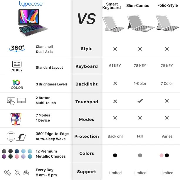 Compatibility - New iPad 9th Gen (2021, 10.2"), iPad 8th Gen (2020, 10.2"), iPad 7th Gen (2019, 10.2"), iPad Air 3rd Gen (2019, 10.5") & iPad Pro (2017, 10.5") including models A1701, A1709, A2123, A2152, A2153, A2154, A2197, A2198, A2199, A2200, A2270, A2428, A2429. Precision Trackpad - Navigate iPad in a whole new way with multi-gesture controls that redefine productivity; edit documents, browse the web and build presentations with unparalleled speed. Illuminated Typing - Type quickly and accurately on a laptop-like keyboard with a full row of iPadOS shortcuts and laser-etched keys that allow an adjustable 10-color RGB LED backlight to shine through. 7 Use Modes - A patented 360° hinge (20,000-cycle stress tested) lets you comfortably use iPad for any task from typing notes to watching videos to using iPad in its native form in tablet mode. Smart Features - Premium hard-shell design protects all sides of your iPad; auto sleep/wake initiates when keyboard case is opened & closed to conserve battery life; holder for Apple Pencil so it won't get lost or in the way.