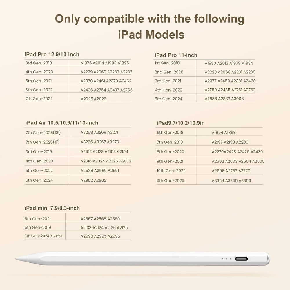 Free eBay listing template designed by dewiso.com Stylus Pen for iPad(2018-2025)-13 Mins Fast Charge with Tilt Sensitivity & Palm Rejection for iPad 11/10/9/8/7/6th Gen, Air 7/6/5/4/3/M3/M2, Pro 13"/12.9"/11"/M4, Mini 7/6/5th,White FREE AND FAST SHIPPING! About this item 🖊【Wide Compatibility】: Stylus pen supports iPad 2018-2025 series:iPad 11th 11 inch 2025/10/9/8/7/6th Gen,iPad Air 7th 11 inch (M3) 2025/7th 13 inch (M3) 2025/6/5/4/3th Gen,iPad Pro 13 inch M4,iPad Pro 12.9 inch 3/4/5/6th Gen,iPad Pro 11 inch 1/2/3/4th/M4,iPad Mini 7th (A17 Pro)/6/5th Gen.NOTE: The Pencil is NOT compatible with iPad models before 2018, iPhone, Android and Microsoft devices. Please check your product model before placing an order. 🖊【Ultra-fast Charging/Ultra-long Battery Life】: Hastraith stylus pen for ipad uses a Type-C interface for charging and can be fully charged in just 13 minutes. It also has an ultra-long battery life of more than 10 hours of continuous use, which can meet the needs of long-term writing or drawing. 🖊【Tilt Sensitivity and Palm Rejection】: Hastraith ipad pen uses tilt pressure sensing technology, which can dynamically adjust the line thickness according to the different tilt angles of the pen side. The full-screen palm rejection function ensures that when using a capacitive pen, the finger or palm touching the screen will not cause accidental touches, while ensuring the smoothness and stability of writing. 🖊【Battery Display/No Bluetooth Required】:No need for Bluetooth connection, turn on this stylus pen by simply touching the cap button. Hastraith ipad pencil has 3 battery indicator lights: All lights on: 70%-100% power, 2 lights on: 30%-70% power, 1 light on: 5%-30% power, 1 light flashing: less than 5% power. Therefore, you can view the battery consumption progress in real time so that you can charge it before important work begins. 🖊【Package Included】: 1 * smart stylus, 1 * type-c charging cable, 3 * replacement nibs, 1 * dust cover, 1 * silicone protective cover, 1 * user manual. Hastraith provides you with a 12-month manufacturer's warranty, if you have any questions about our products, please contact us. Note: If it does not work after turning on, please turn off the Bluetooth of the iPad. Product We offer a 30-Day Return Policy on items which you are not completely satisfied with. You have the option for a full-refund or an exchange of the item. No returns are available on items shipped outside of the US . Shipping We offer Free Shipping to the US and ship within 2 business days of payment, usually sooner. We use UPS express shipping. That's why your products are usually delivered within 3 days . Contact We try our very best to make sure every customer is completely satisfied. If there's a problem , message us! We're happy to help. 24/7 live chat available.