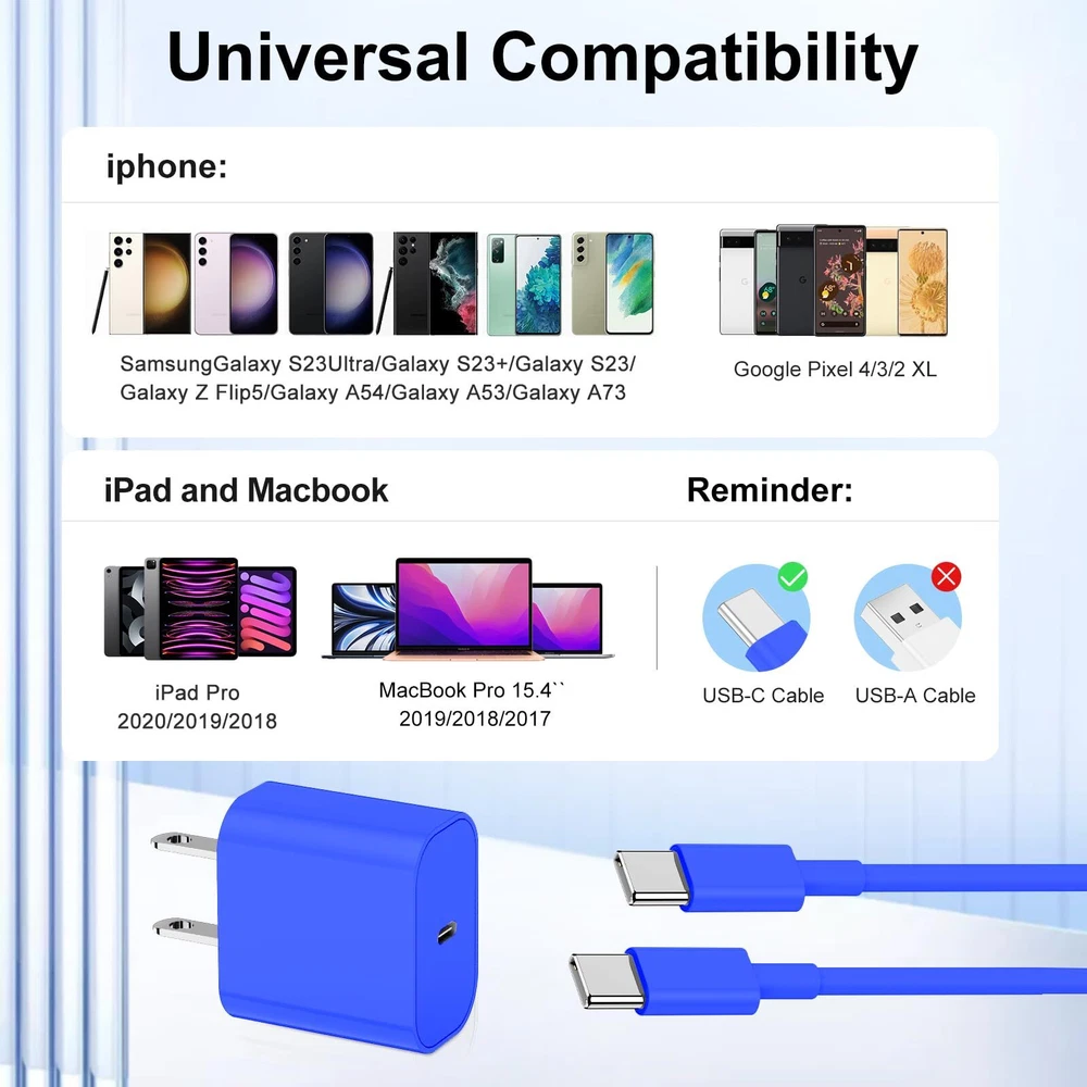 iPhone 15 Charger 10 Ft with 20w USB C Charger Block,2-Pack 20W Fast Wall Charger for 15/15 Pro/Pro Max/iPad Pro AirPods/Samsung and More, with 2 Pack 10ft USB-C Cable 【iPhone 15 Charger】20W PD USB Type C power delivery wall plug, PD adapter 3.0 Quickly Charge , USB-C port provides Max 20W output power, 3X faster than standard USB charger. charging your up to 50% in just 30 minutes for iPad Pro Charging, At 3A Maximum, Helps You Work Efficiently. 【iPhone 15 Fast Charger】The Power Delivery Wall Charger for iPad iphone owns a built-in multi-protection system, avoiding over-voltage,over-charge,over-heat, etc. The smart chip including the MFi certified lightning cable match the current required by the device automatically, charges your iPhone/iPad device fast, safely, and steadily. Tangle-free 10 Feet length is convenient for usage while charging and sync at home/office/travel in bed, hotel rooms, and more. 【USB C Fast Charger for iPad pro】With the MFi Chip, the USB-C to lightning cord equips automatic chip recognition function, full support with iOS versions.20W USB-C Charger Offers Multiple Safeguards Automatically. Multi-Charging Protection Keeps Your Device Safe From Over-Current Over-Voltage Over- Heating & Short-Circuiting. 【Broad Compatibility 】Use the official USB-C lightning cable 20W USB C wall charger to access fast-charging iPhone 15/15 Plus/15 Pro/15 Pro Max/ 2021/2020/2018 iPad Pro 12.9/11 inch,iPad Air 4, Mac Book Air 13 inch, Mac Book 12 inch, Gen 4/3, iPad Pro 11 Gen 2/1, iPad Air 4, Google Pixel 4/ 4 XL / 3a XL / 3 / XL / 2, Samsung Galaxy S8 S9 S10 S20 Plus, Note 10, LG and more. 【What You Get】2x 10FT Cable and 2 x USB-C Wall Charger. If you have any questions, please feel free to contact us. 【iPhone 15 Charger】20W PD USB Type C power delivery wall plug, PD adapter 3.0 Quickly Charge , USB-C port provides Max 20W output power, 3X faster than standard USB charger. charging your up to 50% in just 30 minutes for iPad Pro Charging, At 3A Maximum, Helps You Work Efficiently. 【iPhone 15 Fast Charger】The Power Delivery Wall Charger for iPad iphone owns a built-in multi-protection system, avoiding over-voltage,over-charge,over-heat, etc. The smart chip including the MFi certified lightning cable match the current required by the device automatically, charges your iPhone/iPad device fast, safely, and steadily. Tangle-free 10 Feet length is convenient for usage while charging and sync at home/office/travel in bed, hotel rooms, and more. 【USB C Fast Charger for iPad pro】With the MFi Chip, the USB-C to lightning cord equips automatic chip recognition function, full support with iOS versions.20W USB-C Charger Offers Multiple Safeguards Automatically. Multi-Charging Protection Keeps Your Device Safe From Over-Current Over-Voltage Over- Heating & Short-Circuiting. 【Broad Compatibility 】Use the official USB-C lightning cable 20W USB C wall charger to access fast-charging iPhone 15/15 Plus/15 Pro/15 Pro Max/ 2021/2020/2018 iPad Pro 12.9/11 inch,iPad Air 4, Mac Book Air 13 inch, Mac Book 12 inch, Gen 4/3, iPad Pro 11 Gen 2/1, iPad Air 4, Google Pixel 4/ 4 XL / 3a XL / 3 / XL / 2, Samsung Galaxy S8 S9 S10 S20 Plus, Note 10, LG and more. 【What You Get】2x 10FT Cable and 2 x USB-C Wall Charger. If you have any questions, please feel free to contact us. Shipping from the USA All of our products are shipped from the USA, ensuring quick delivery to your destination. Payment We offer the following payment methods: PayPal, credit card, bank transfer, and eBay's secure payment system. Free Shipping & Free Returns Shipping within the USA is FREE. Additionally, any return is absolutely free for you. Risk-Free Purchase You have the option to return an item within 30 days without any justification. We cover the return shipping costs! Fast Shipping We ship immediately upon receipt of payment. Generally, the package is delivered within 2-3 days in the USA. If it takes longer, we will contact you. Quality and Costs Made in Europe, USA, China No customs fees or additional charges Total satisfaction guarantee Invoice with declared VAT available upon request in .pdf format Feedback Your feedback is very important to us. After you pay for your purchase, you will automatically receive positive feedback from us.