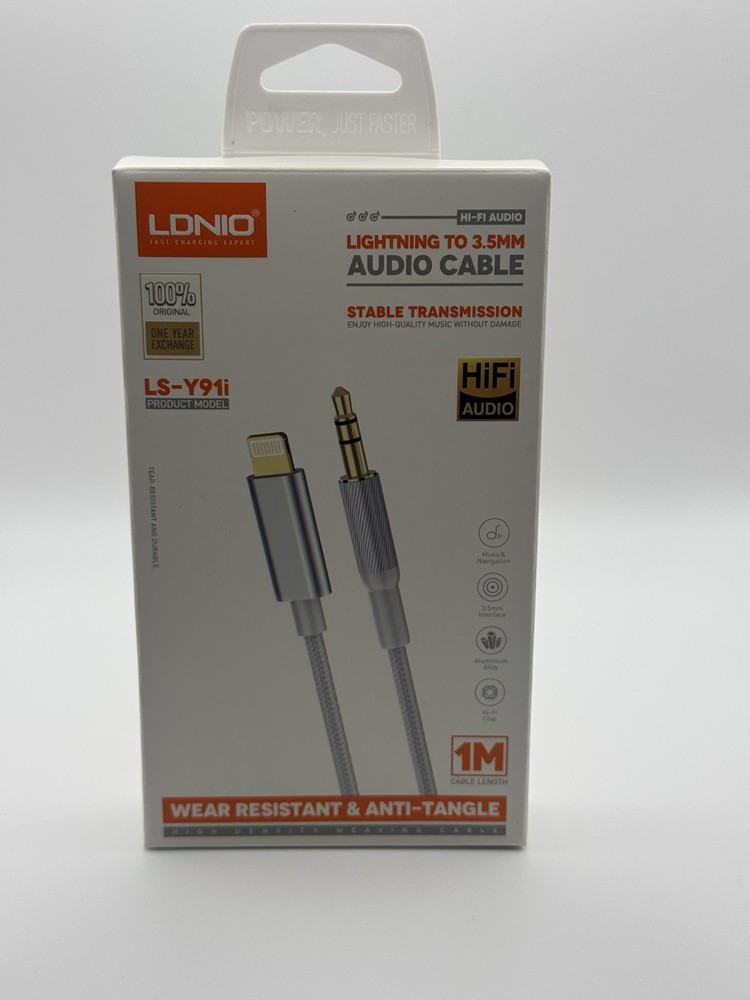 The LDNIO to 3.5mm Cable is designed for Apple devices and features a 1m long white cable made of aluminum. It allows you to connect your device to an audio dock with adjustable angle features for convenience. The cable provides a connection to a 3.5mm audio jack, enabling you to listen to music or other audio from your device through external speakers or headphones.