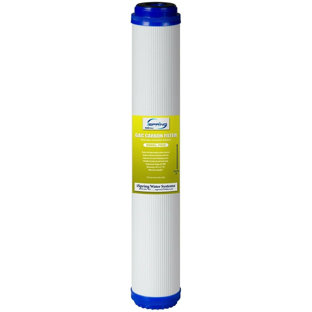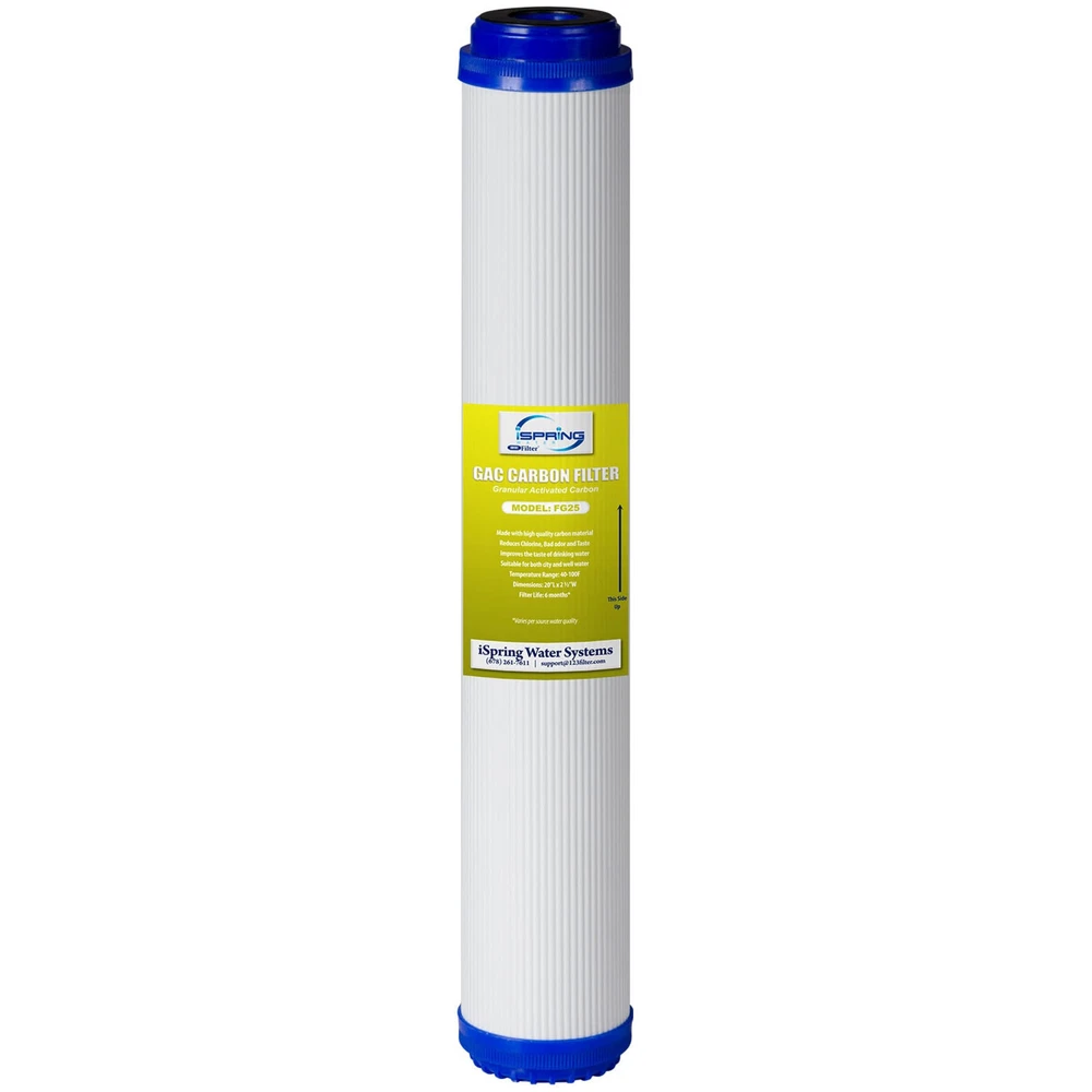 Protect Your Family and Household Appliance from Chlorine and More: Say goodbye to smelly, bad tasting water! The FG25 granular activated carbon filter is specially designed to remove dust, particles, rust, and odors and tastes caused by various contaminants, especially chlorine from your source water.Standard Size: Our filter set fits standard 20" x 2.5" housings, including brand name models.Our FG25 granular activated carbon filters are made of coconut shell carbon to increase filtration efficiency and extend filter life. They are tested by an independent third-party to meet NSF/ANSI standards. The filters have a capacity of 30,000 gallons of water, enough to supply a family of four with clean water for half a year. Water flow: up to 12 GPM.Peace of Mind Customer Service: Register online Free Shipping Over $49.99* Details iSpring Water Filter Replacement Cartridges, Granular Activated Carbon Product Description: Protect Your Family and Household Appliance from Chlorine and MoreSay goodbye to smelly, bad tasting water! The FG25 granular activated carbon filter is specially designed to remove dust, particles, rust, and odors and tastes caused by various contaminants, especially chlorine from your source water. Standard SizeOur filter set fits standard 20" x 2.5" housings, including brand name models. Our FG25 granular activated carbon filters are made of coconut shell carbon to increase filtration efficiency and extend filter life. They are tested by an independent third-party to meet NSF/ANSI standards. The filters have a capacity of 30,000 gallons of water, enough to supply a family of four with clean water for half a year. Water flowup to 12 GPM. Peace of Mind Customer ServiceRegister online to activate your extended manufacturer warranty and life-time free tech support from U.S. local support team. We stand behind our products and if you encounter any problems with any of our products please reach out to us immediately. We are happy to help! Please NoteThe cartridges are individually wrapped to ensure freshness. Please unwrap the cartridges before use. Unlike an RO membrane, the filters don't reduce Total Dissolved Solids (TDS). If you are interested in a filter that removes TDS, consider our iSpring Reverse Osmosis (RO) systems.