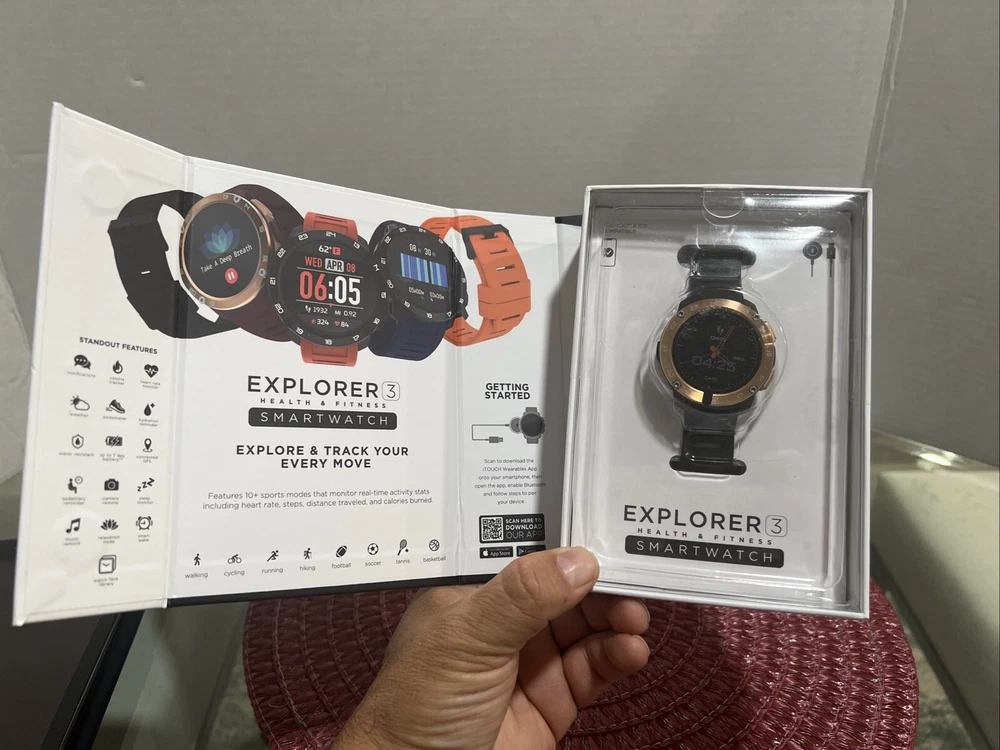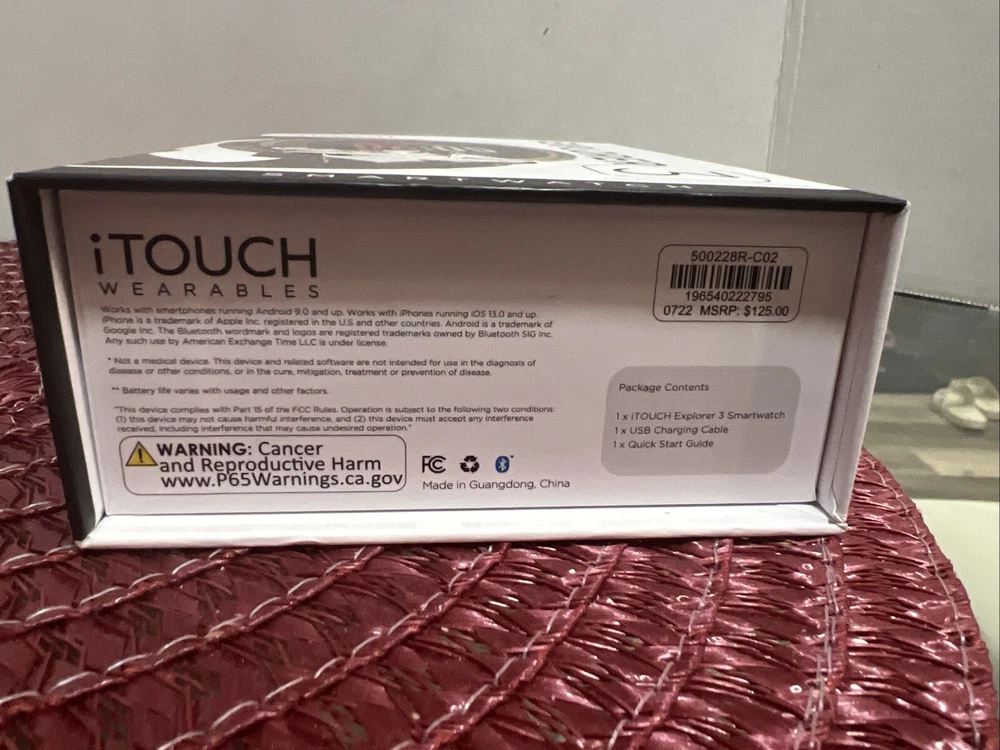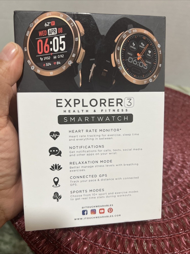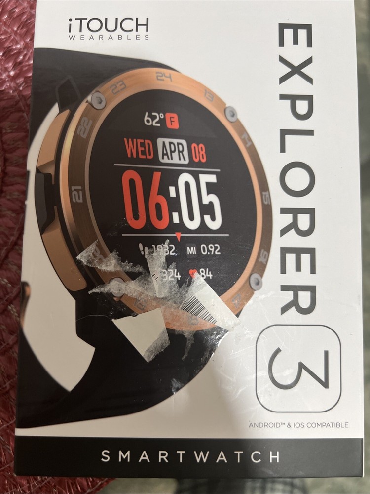 The iTouch Explorer 3 Smart Watch is a fitness tracker designed for sport activities. It features a stylish rose gold case with a 42mm black rubber band, making it durable for active use. This Bluetooth-enabled smartwatch is compatible with both iOS and Android operating systems, allowing for seamless connectivity with your smartphone. With its sporty design and practical features, the iTouch Explorer 3 is a versatile accessory for tracking your fitness goals and staying connected on-the-go. Look at the pictures and Ask questions before making your purchase