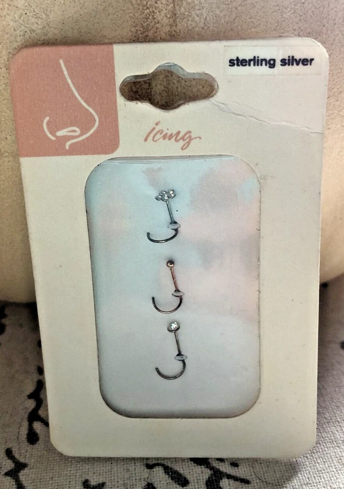 Spice up your look with this three-pack of sterling silver nose rings from icing. Perfect for any occasion, these nose rings are stylish and unique. Made from high-quality silver, they are durable and will last for a long time. Featuring a beautiful silver color and a delicate design, these nose rings are perfect for those who want to add a touch of elegance to their style. With the icing brand, you can trust that you are getting a quality product that is stylish and reliable icing Sterling Silver Nose Ring 3 pack ( Flower, Ball & Rhinstone stud) Brand New in original packaging! Paid $9.50