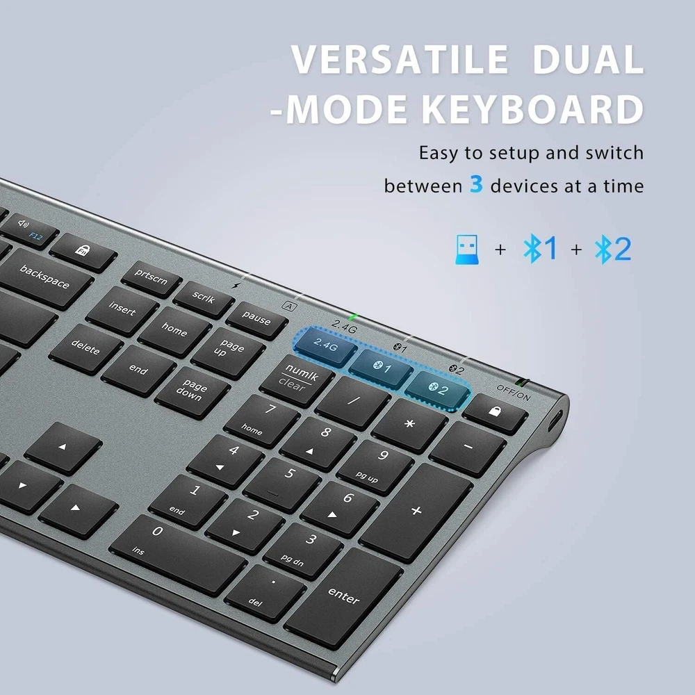 iclever IC-DK03 Wireless + 2.4G Dual Mode Ultra Slim Bluetooth Keyboard Free shipping Multi-Device Connection: Both keyboard and mouse are dual-mode designed and three channels enabled(Bluetooth channel *2 + 2.4GHz USB channel *1). Effortlessly realize quick and smooth switch between 3 devices by pressing a single button. Universal Compatibility: Fully Compatible with Mac, iOS, Android, Windows 7/8/10. Customers can select the corresponding system through the keyboard fn+Q/W. Rechargeable Battery Saves Energy: Forget the annoyance of having to change batteries with this bluetooth keyboard and mouse, which use lithium-ion battery to give you up to 90 hours of continuous use on a single charge. When you're not using them, both the keyboard and mouse will go on standby to save energy. Just click the mouse or hit any key of the wireless keyboard to wake them up. Ultra-Thin Full-Size Keyboard: The ultra-thin full-size keyboard has an independent number zone and multimedia functions. It is the most suitable keyboard for office work. The X-structure design of the keys is labor-saving, light-sounding, stable, and can accurately supplement every stroke. The bottom of the keyboard is designed with aluminum alloy, and at the same time, it adopts a special process to make the appearance thinner and more beautiful.