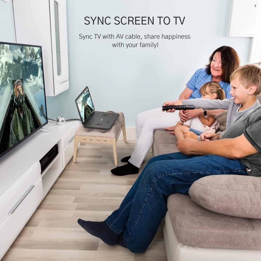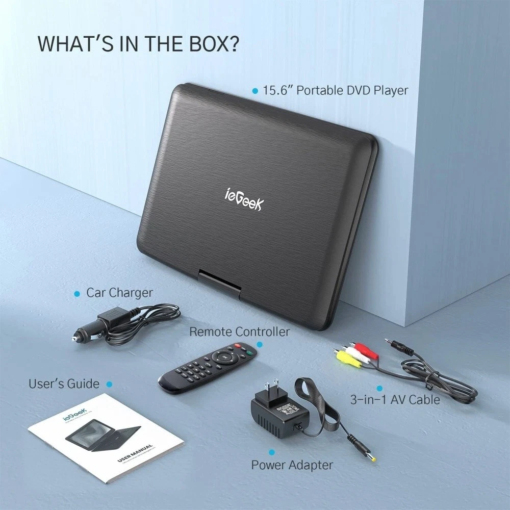 đ ăUpgraded Big HD Screenă The new ieGeek portable DVD players adopt 15.6" large screen with 1280*800 resolution and higher brightness to bring a much more immersive viewing experience. With 270° rotation 180° flip function, you can adjust the screen to your most suitable angle when you doing yoga, having a road trip, or just enjoying a classic movie. đ ăLong Battery Lifeă Built-in 5000mAh battery supports up to 6 hours(2-3 movies) uninterrupted playing, keeping the kids entertained for hours and giving you a break. Our portable DVD players with large screen are also equipped with power adapter and car charger, so don't worry about running out of battery when you at home or long road trip. đ ăPowerful Volume & Enlarged Buttonă Built-in upgraded dual speakers give high volume to ensure a great listening experience. In order to make it easier for the elderly and children to use, we Enlarge and Simplify the button design of this large screen portable DVD player. Also choose to use the remote to control your player from a distance! đ„ ăSync TV & Last Memoryă Want a bigger screen? Use the included AV-RCA cable to connect your DVD player portable to the TV, and have a comfortable and relaxing family time. The last memory feature allows the DVD to play from where it left off last time. đ ăSupport Multiple Media & Region Freeă This portable DVD player is compatible with all-region discs of DVD, DVD±R, DVD±RW, CD-R(RW), SVCD-R(RW), VCD, CD, MP3, MPEG, AVI, VOB, and also support USB and SD card(up to 32GB) to play your favorite movies and music. đ ăCustomer Serviceă We provide a one-year worry-free guarantee and lifetime professional customer service and technical support. Your message will be responded to within 24 hrs. Longer Battery Life Built-in 5000mAh rechargeable battery supports 2-3 movies playing.(full charge) In addition, the equipped car charger allows you to have no fear of running out of power when traveling long distances. Elderly-Friendly Design We think more about your parents and children, so the button is designed to be bigger and more convenient. The remote control is also simplified for ease of use than most portable DVD players. Adopts exquisite craftsmanship and elegant black texture, this player committed to become a leisure activity you'll love. Upgraded Dual Speaker System The upgraded speaker system gives this portable DVD player an extra-large volume. It could also connect to an external speaker or headphones(not included) by the 3.5mm audio port. Support All Regions, Multiple Formats Discs: CD, DVD, VCD, DVD±R, DVD±RW, CD-R, CD-RW, CVD, SVCD. (Note: This product does not support Blu-ray , Dolby and pirated discs) Video/Audio: AVI, MPG, MPVG4, VOB, FLV, RMVB; MP3, WMA, OGG, AAC(32-192kbps)(MP4 not supported) USB/ SD Card up to 32G and resolution within 720*576 Warm tips: 1. How to Start the Machine ? Find the " off/on" button on the right side of the machine and switch it on. Please use it after charging. 2. Product Size : The overall size of the portable DVD player is 17.5 inches (measured diagonally) and the screen size is 15.6 inches (measured diagonally). This portable DVD player has narrower bezels for a better screen experience. 3. How to Use AV-OUT and AV-IN Functions? A V-OUT: Use the AV to RCA cable (included in the package) to connect this portable DVD player with your TV or Projector, and enjoy your favorite movies on a big screen. A V-IN: Two same portable DVD players for car also can be connected by an AV to AV cable(not included) so that one movie can be watched on two players at the same time. 4. Port : DC IN; Power on/off; AV-IN; AV-OUT; Headphone Jack*1; SD Card Jack; USB Jack; Game 5. Rated Voltage : DC 9-12V Share ieGeek, Share the Moment Together. Your happiness is something that we value as much as you do. To start, ieGeek has been engaged in the R&D design and production of portable DVD players for over 8 years. Whether it's laughter when watching a family movie, or leisure time on a road trip, we always hope to ensure the best viewing experience for you and the one you care about. The Best Gift for Children and the Elderly. Thanks to the big screen, your kids will be immersed in their favorite cartoons without hurting their eyes. And that's a good thing for you too. A short break from the distractions of your kids, so you can enjoy your private time. For the elderly, we simplify the button design of the remote and control panel, which will be much easier for them to learn how to operate. The extra-large screen and high-volume dual speakers make it less likely to cause visual fatigue. This portable DVD players with large screen for seniors has exquisite workmanship and superb quality. It will be the best choice as a gift.