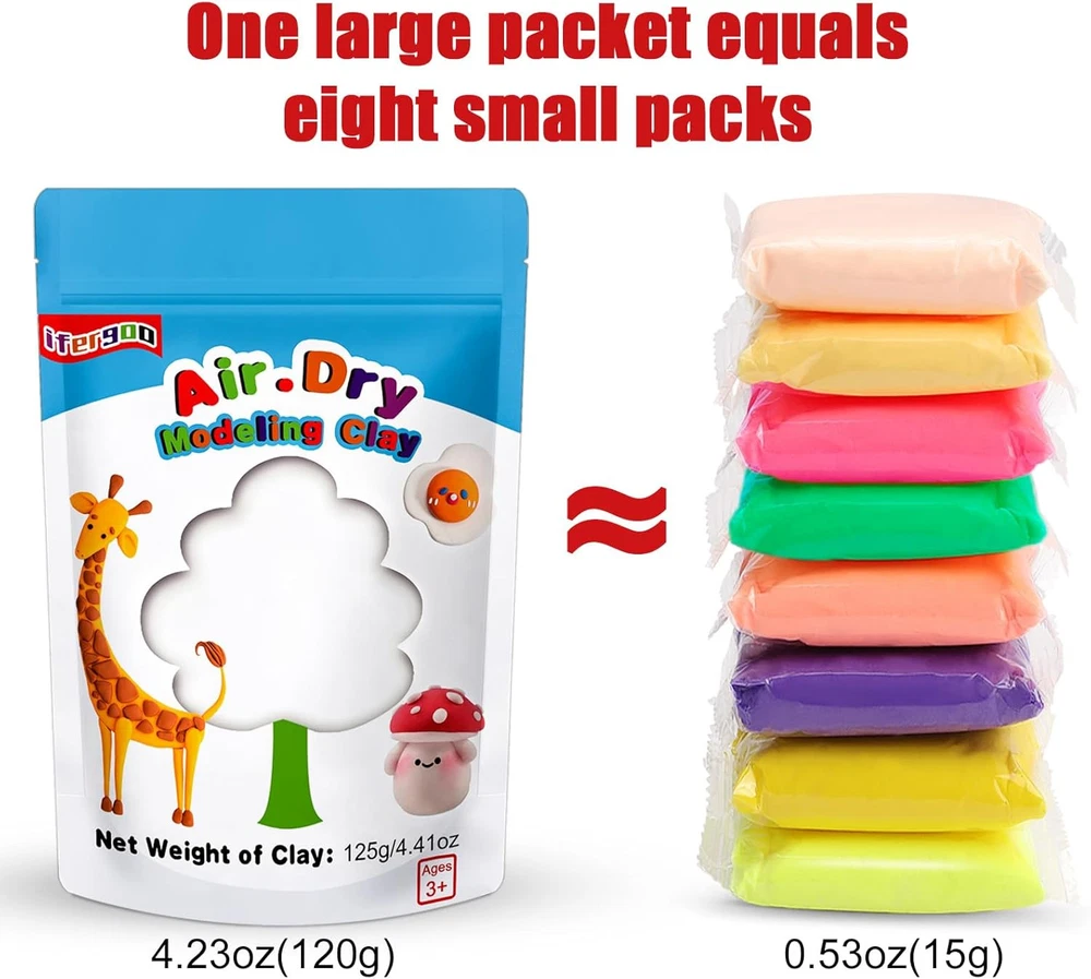 ifergoo Modeling Clay, 24/36 Colors Air Dry Clay Best Gift for White Color Product Details Brand: ifergoo Color: White Color Age Range (Description): Kid Material: Clay Item Weight: 4.45 Ounces Number of Items: 1 Recommended Uses For Product: Playing, Modeling Special Feature: Non Toxic Included Components: 24 Colors Molding Clay Set, Project Booklet in English Educational Objective: Creative Skill Model Name: ifergoo Modeling Clay Item dimensions L x W x H: 7.09 x 4.72 x 0.59 inches Product Dimensions: 7.09 x 4.72 x 0.59 inches Item Weight: 4.5 ounces Item model number: NT-01 Manufacturer: ifergoo AIR DRY & NO BAKING- No need baking, just leave the clay work in air for 18-48 hours, it will be dry. NON TOXIC & NON SMELL- 100% safe for Children. Wheat, tree nut or peanut-free, ASTM F963-17, CPSIA & EN71 certified. Kid-friendly and parent approved! LARGE AMOUNTS REFILL CLAY - One large package equals 10 small packets. Gives you plenty of clay to work with big clay project MULTIPLE USED -Air Dry Clay for Cosplay and Costumes, Moldable Creative clay used for Arts ,Crafts ,Create detailed ornaments and pieces . DEVELOPS IMAGINATION - ifergoo air dry clay will help your kids develop their imagination and enhance confidence.