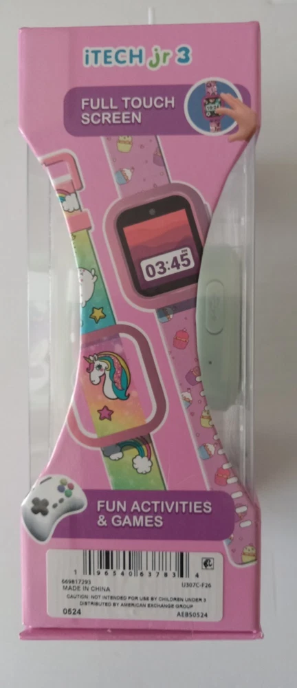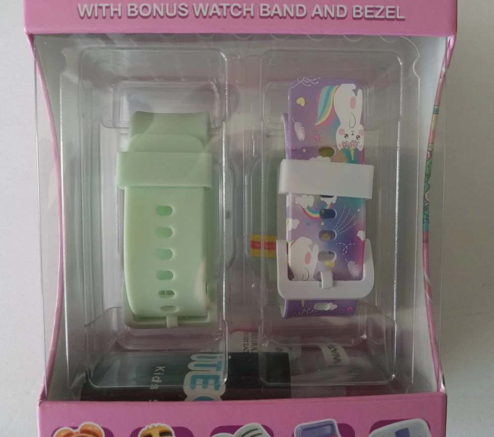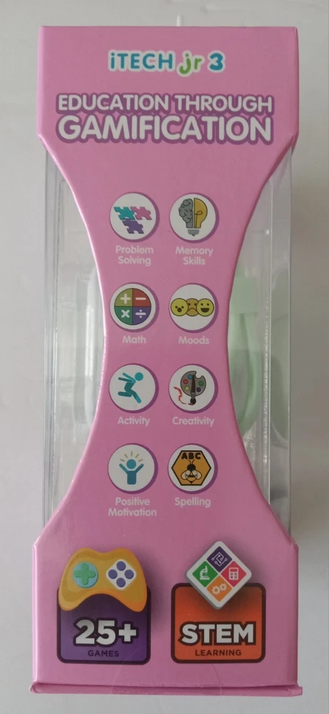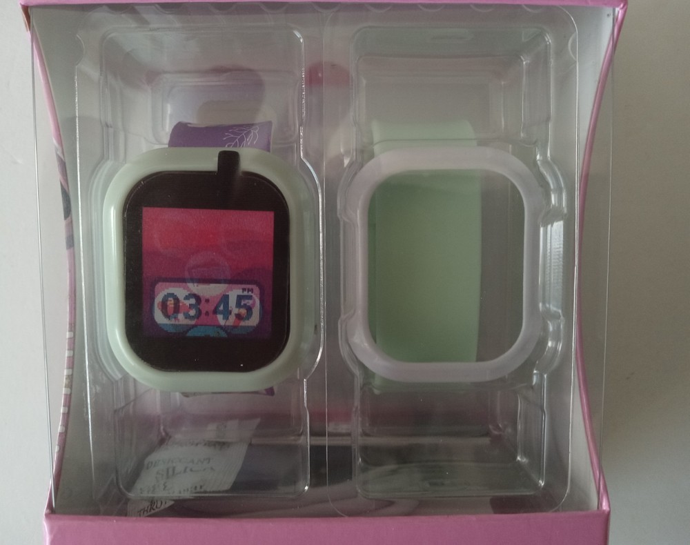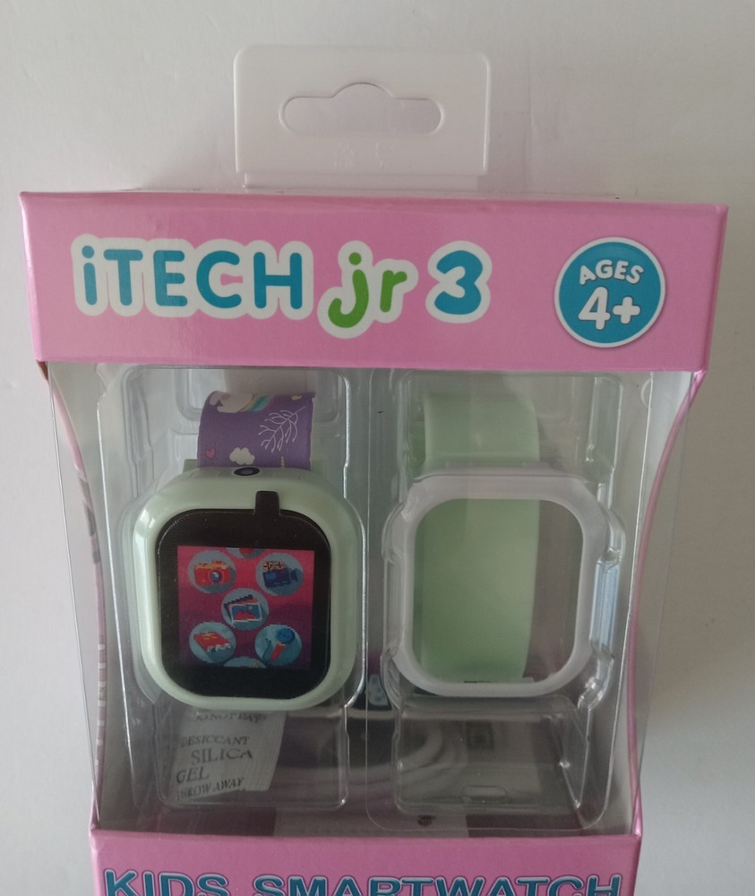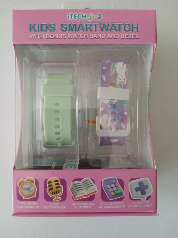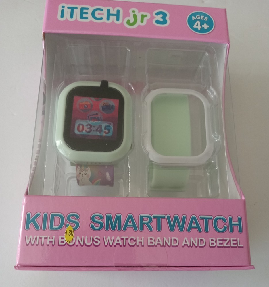 itech jr 3 Kids Smartwatch with Bonus watch Band and Bezel Watch is a White/Cream/Purple Color extra band is White/Light Green. 25+ Games, Stem Learning, Touch Screen, Calculator, Video/Voice Recording, Stopwatch and other functions. The watch is brand new in box. The box has no marks, stains, dings, dents, scratches, nicks, cracks, broken or missing parts. Additional photos upon request. Item will be shipped in safe and secure packaging.
