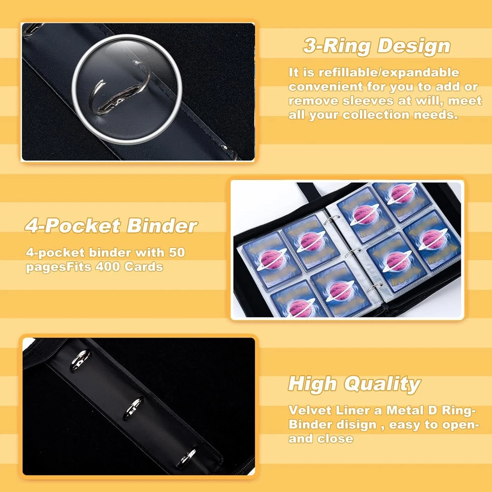🎁Special Gift: This innovative and unique designed 4 pocket card binder makes the perfect gift for New Year's, birthdays, Christmas, and Thanksgiving Day. It brings surprise and joy for boys and girls who love collecting cards. 👍Large Capacity: Each page of the collectible trading card albums has 4 pockets that allow for double-sided storage of cards. It includes 50 high-quality detachable sleeves that can hold up to 400 trade cards. It is great for every collector to showcase and collect your favorite items and for fostering good storage habits! 👍Wide Applications:Jravkfi card holder binder meets all your collectible needs - it is compatible with standard-sized trading cards such as MTG cards, Game King card games, Fuji Mini Polaroid photos, business cards, baseball cards, basketball cards and other collectible cards. 👍High-quality Card Binder: The card holders for trading cards is made of high-quality PU leather and smooth waterproof material. The internal page of the binder is made of PP material that is highly transparent and easy to display and browse. The zipper design ensures that cards are not lost. The soft lining prevents damage and provides comprehensive protection for your cards. 👍3-Ring Design and Portable: Our sports card binder adopts a detachable ring-shaped design that is sturdy and allows you to freely add or remove card sleeves. It comes with a high-quality wrist strap for easy carrying. The size is 9.8*7*1.8inches, which is suitable for Collectors to carry the photo card binder with them and enjoy the fun. 👍Quality Service: We promise you will receive an excellent binders for cards.It is a gift for boys and girls. If you encounter any quality issues with our card book, please don't hesitate to contact us. Your feedback has a significant impact on our product upgrade. Product Description Various Styles of Design---Card Binders Collectible trading card binders storage and collection card---is an ideal card guard binder Surprise Gift——Loved by girls and boys alike card holder binder ! Trading Card Holder Multiple types of Standard card collections Trading Card Binders Internal Details High Quality Sleeve is made of odorless transparent polypropylene,that is durable, acid-resistant, and waterproof, ensuring long-lasting protection for your cards. Protection Oft padding, exquisite machining and stitching techniques, every detail embodies our high-quality standards. Browse The sports card binding sleeve is made of PP material and is inserted from top to bottom, storing the contents clearly on both sides. Robust 3 ring card binder-Rust-resistant and easy to open and close,Fillable/expandable allows you to easily add or remove ferrules for all your needs.
