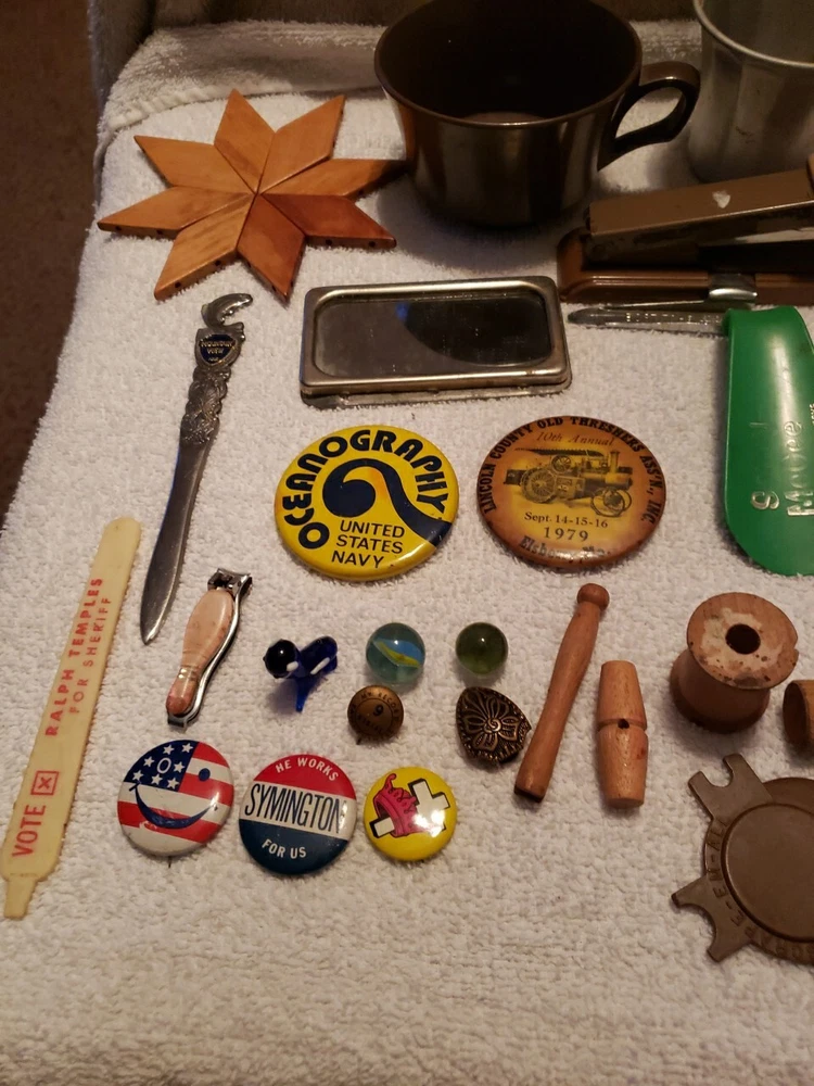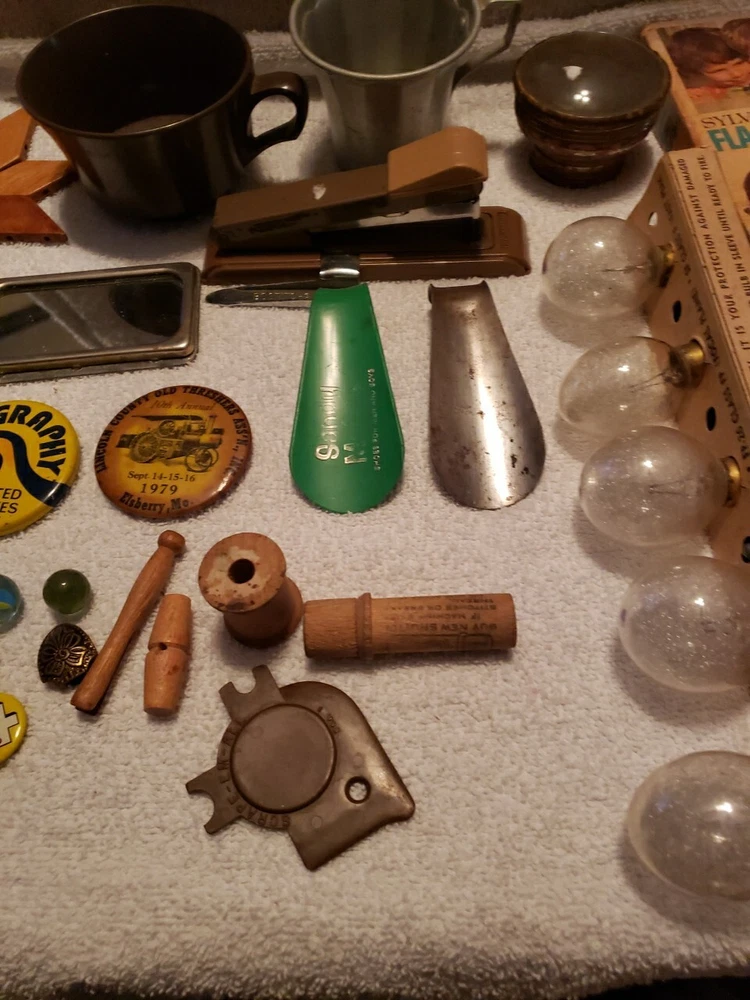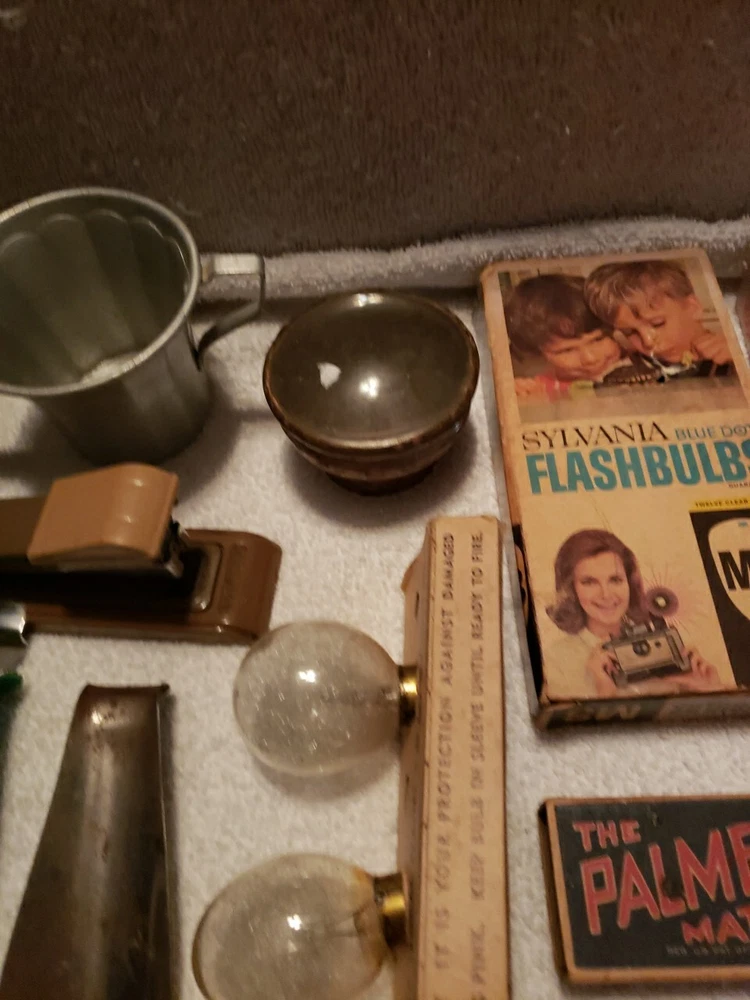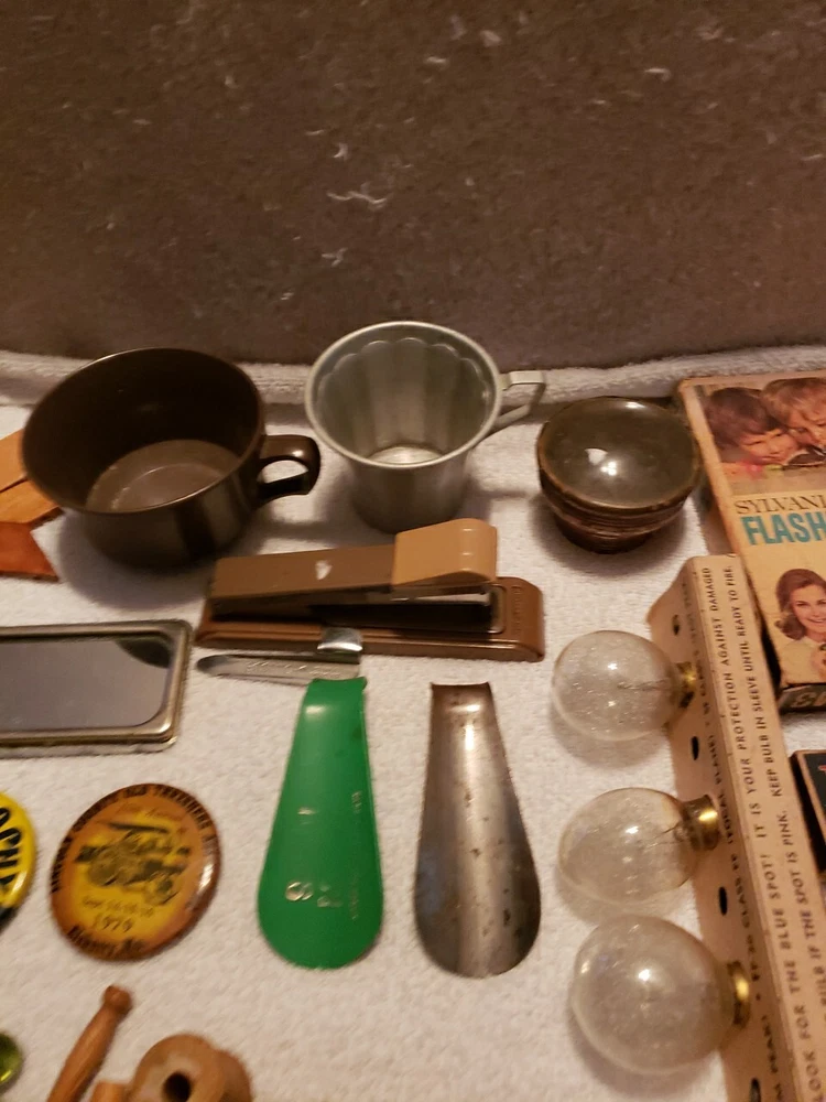 This junk drawer lot includes a variety of vintage collectibles such as button pins, flash bulbs, lenses, and a stapler. These unique items would make a great addition to any collector's collection and are sure to bring back nostalgic memories. The lot falls under the categories of collectibles and wholesale lots, making it an ideal purchase for those who enjoy collecting unique items.
