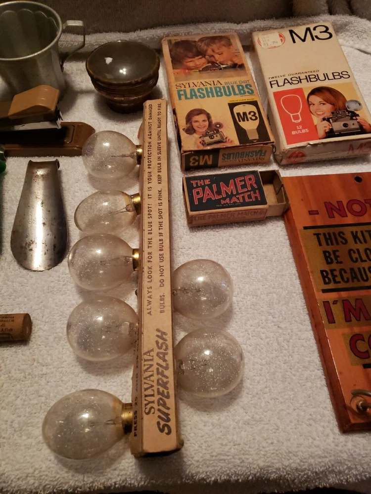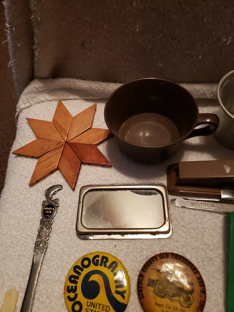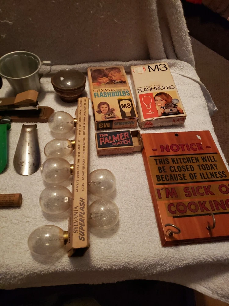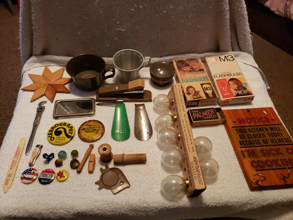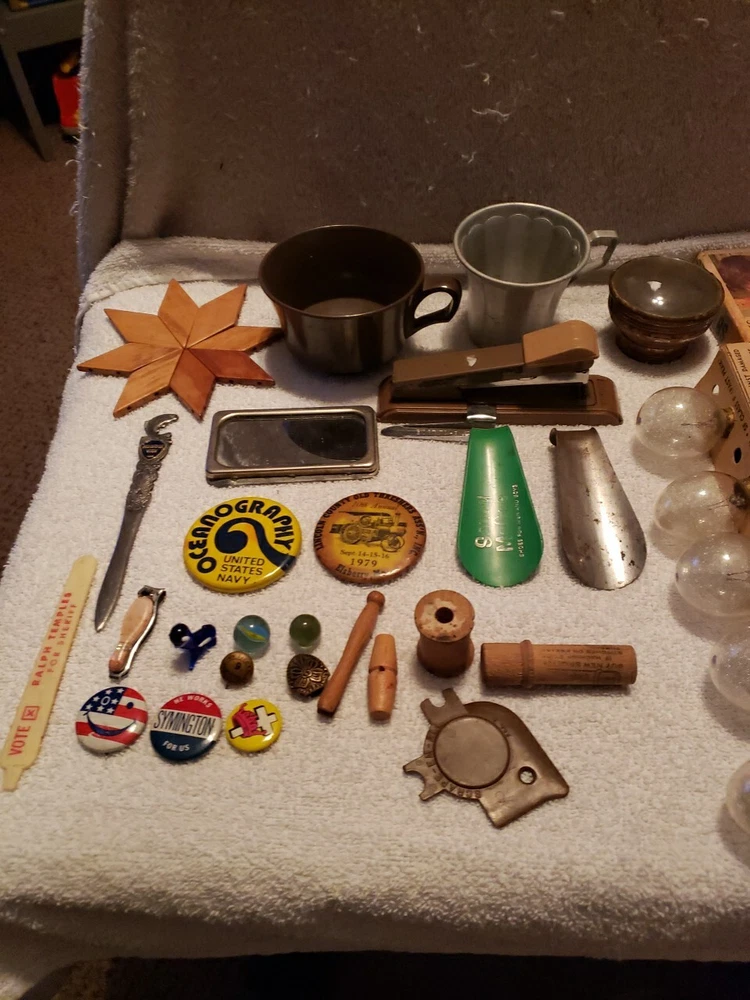 This junk drawer lot includes a variety of vintage collectibles such as button pins, flash bulbs, lenses, and a stapler. These unique items would make a great addition to any collector's collection and are sure to bring back nostalgic memories. The lot falls under the categories of collectibles and wholesale lots, making it an ideal purchase for those who enjoy collecting unique items.