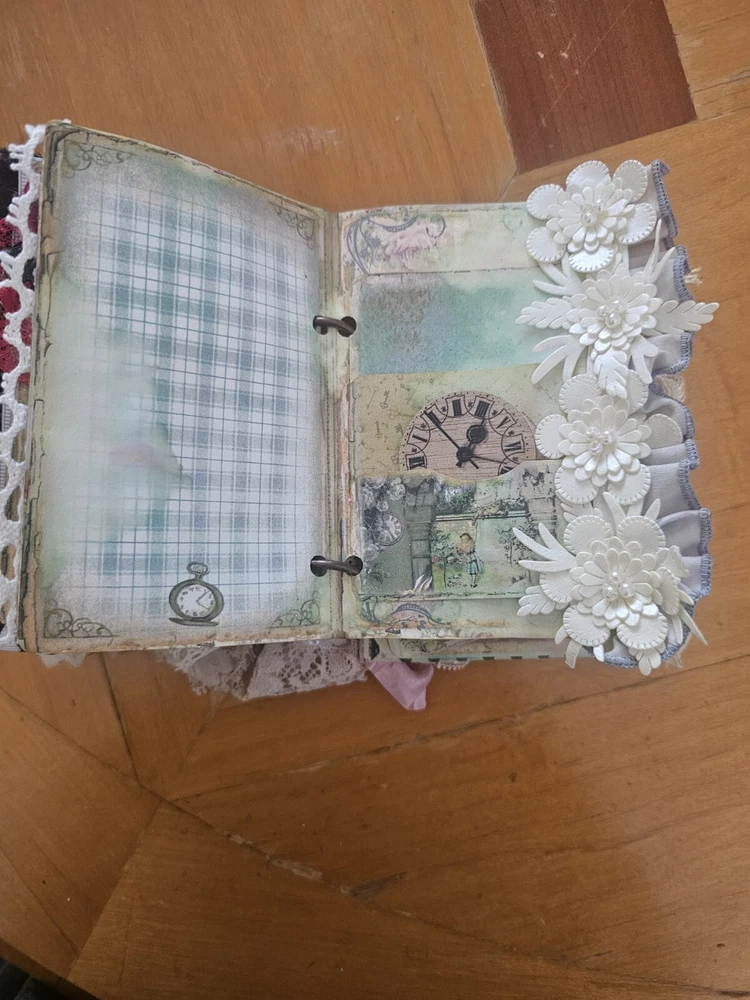 The "junk journal handmade" is a custom-made journal created using a variety of materials such as recycled paper, fabric, beads, and other embellishments. This type of journal is typically made to have a vintage, eclectic look and feel, with various textures and designs incorporated into its pages. It is perfect for those who enjoy creative journaling, scrapbooking, or keeping memories in a unique and artistic way. The handmade aspect adds a personal touch and makes each journal one-of-a-kind.