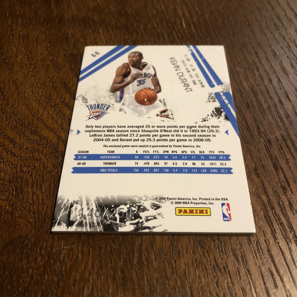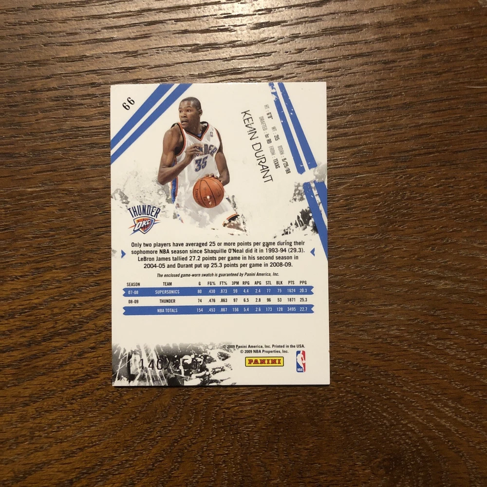 Card is in excellent condition suitable for grading with a nice swatch of game worn jersey (See pics). Very cool rare early career memorabilia card limited to only 250 total copies produced and when Panini’s swatches were still game worn. Always a good time to invest in the all time greats of the game like first ballot Hall of Famer Durant. I will combine shipping for multiple items so please check out my other listings!