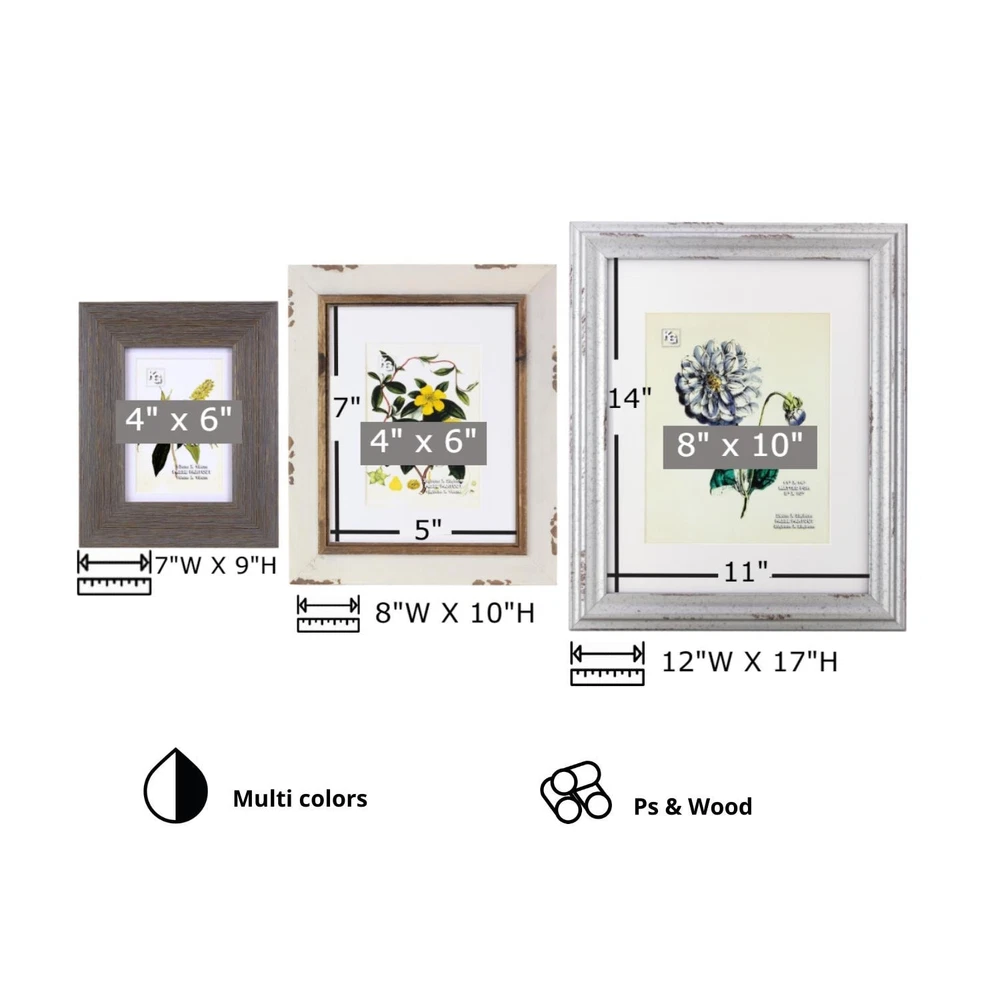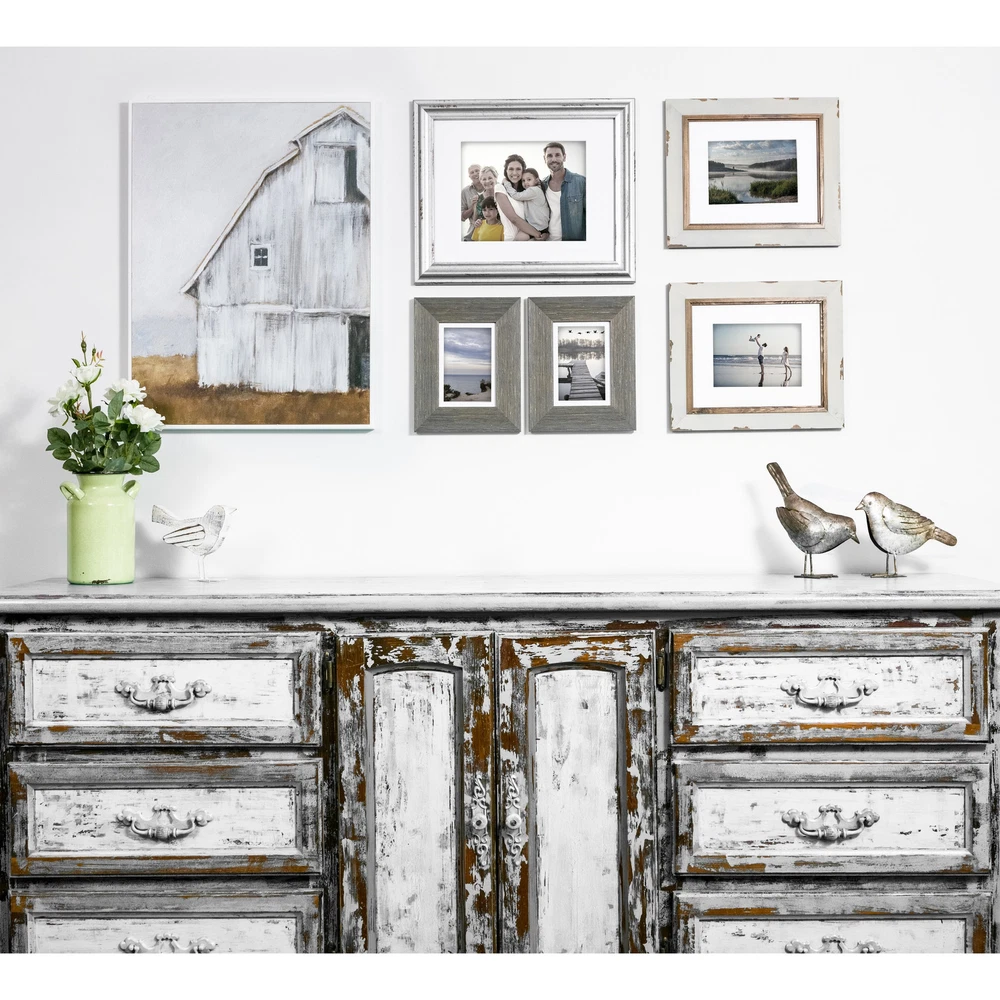 The KG Mixed Farmhouse Gallery Set allows you to display an array of photos in minutes, making an easy addition to your décor. Each set included 4 Raymond Frames, sized 5x7" matted for 4x6", 2 Gary Frames, sized 8x10" matted for 5x7", and 1 Jean frame, sized 11x14" matted for 8x10". Blending a homespun edge with a touch of gold-effect, this mixed grey gallery is a gorgeous home for your memories.SET OF 7 STYLISH, ELEGANT FRAMES - Make an instant photo display! You'll love the Farmhouse Gallery Frame set. Combining rustic styles, this set is great for creating a beautiful group of photos. FOUR RAYMOND FRAMES - Grey, bevelled, worn-look wood frame! The Raymond measures 7"W X 9"H X 0.5"D. The frame opening is 4" x 6". With an easel back and hangers, this frame has a multitude of display Free Shipping Over $49.99* Details kieragrace KG Farmhouse Gallery Set of 7 Product Description: The KG Mixed Farmhouse Gallery Set allows you to display an array of photos in minutes, making an easy addition to your décor. Each set included 4 Raymond Frames, sized 5x7" matted for 4x6", 2 Gary Frames, sized 8x10" matted for 5x7", and 1 Jean frame, sized 11x14" matted for 8x10". Blending a homespun edge with a touch of gold-effect, this mixed grey gallery is a gorgeous home for your memories.SET OF 7 STYLISH, ELEGANT FRAMES - Make an instant photo display! You'll love the Farmhouse Gallery Frame set. Combining rustic styles, this set is great for creating a beautiful group of photos. FOUR RAYMOND FRAMES - Grey, bevelled, worn-look wood frame! The Raymond measures 7"W X 9"H X 0.5"D. The frame opening is 4" x 6". With an easel back and hangers, this frame has a multitude of display options. TWO GARY FRAMES - Grey wood frame with a brushed gold finish! The Gary measures 8"W X 10"H X 0.5"D. The frame opening is 5" x 7" and is matted for 4" x 6" with an acid-free mat.With an easel back and hangers, this frame has a multitude of display options. ONE JEAN FRAME - Gorgeous distressed metal-effect finish resin frame! The Jean measures 12"W X 17"H X 1"D. The frame opening is 11" x 14" and is matted for 8" x 10" with an acid-free mat. With sawtooth hangers it's easy to hang.HORIZONTAL AND VERTICAL TRIANGLE HANGERS - The Raymond and Gary feature triangle hangers. Don't know what picture you are going to use this frame for? No problem! Lightweight, easy to place triangle hangers make the frame versatile; use these frames for horizontal or vertical images.