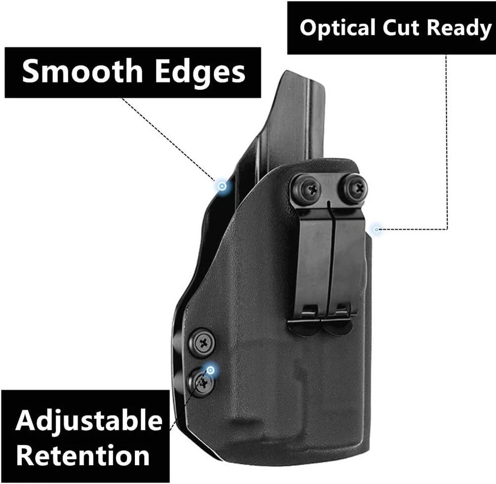 Holster for Glock and Taurus Models with Olight PL-Mini 2 Valkyrie Tactical Flashlight Perfect Compatibility This holster is a perfect fit for a wide range of popular models including: Glock 17, 19, 22, 23, 45 MOS (Gen 3, 4, 5) Springfield Hellcat OSP 3" Taurus G2C, G3C, G3, TORO All with the Olight PL-Mini 2 Valkyrie 600 Lumens Tactical Flashlight and Optics RMR Cut for Concealed Carry. CUSTOM FIT & EXCEPTIONAL STABILITY Designed with exclusive molding on both sides of the weapon, this holster provides a perfect fit, ensuring stability and functionality. The custom fit helps to securely hold your firearm in place, whether you’re carrying in a variety of positions. Durable & High-Quality Material Made from a 2mm thick material, this holster offers extreme toughness, sweat-proof, waterproof qualities, and resistance to impact and abrasion. It ensures that your firearm is well protected and easily accessible when needed. Enhanced Comfort and Versatility With an adjustable metal clip, this holster allows for inside-the-waistband (IWB) concealed carry in any position, providing comfort and flexibility. The adjustable click-in retention offers a secure, firm hold, and the smooth-polished finish along the edge adds a refined touch. Premium Protection This holster is designed for long-lasting use, giving you confidence that your firearm is secure while offering ease of access when needed. Whether for everyday carry or tactical purposes, this holster is built to meet all your needs with superior quality and design.